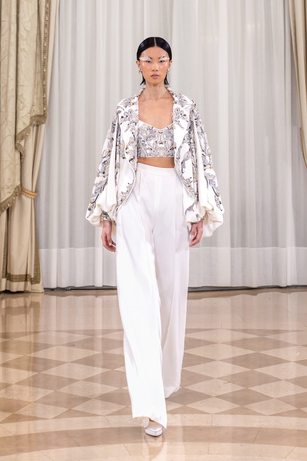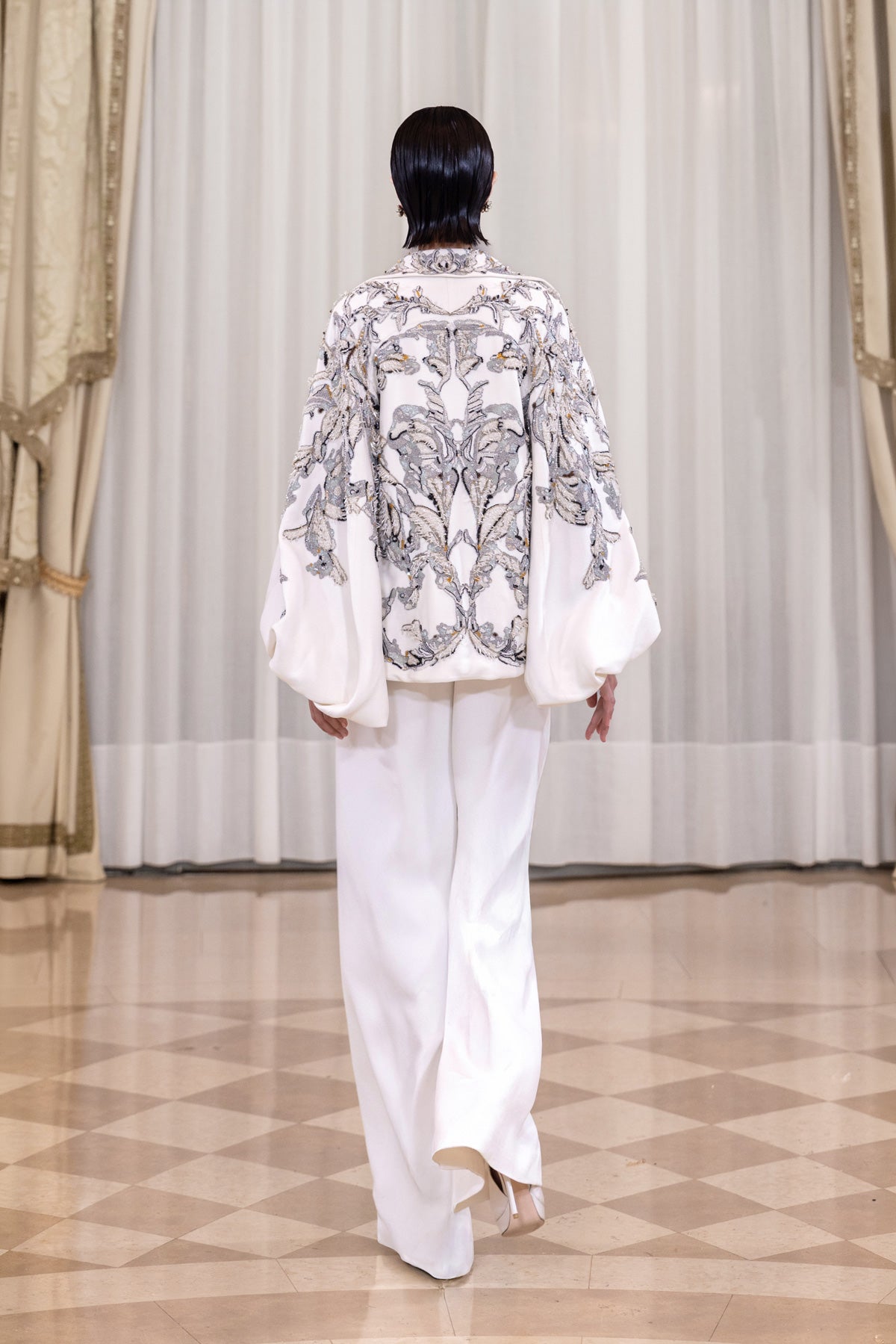 Step into refined grace with our crepe piqué embroidered set in off-white, composed of a jacket, bra, and wide-leg pants. The silhouette is fluid, the pants falling straight and elongated, and the jacket adding soft volume through gently puffy and gathered sleeves. The embroidery is executed in a refined mix of silver, soft gold, Jet-black and blue metallic tones, symmetrically developed across the jacket and bra. Botanical-inspired motifs unfold through mirrored curves, scrolling lines, and ornate flourishes, built with metallic threads and fine beadwork. Fine beadwork and metallic thread trace each shape.