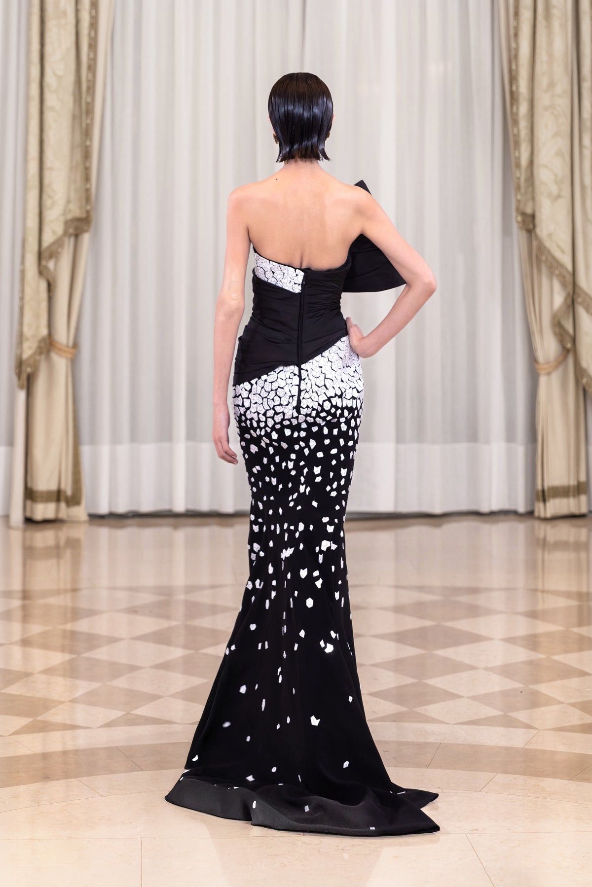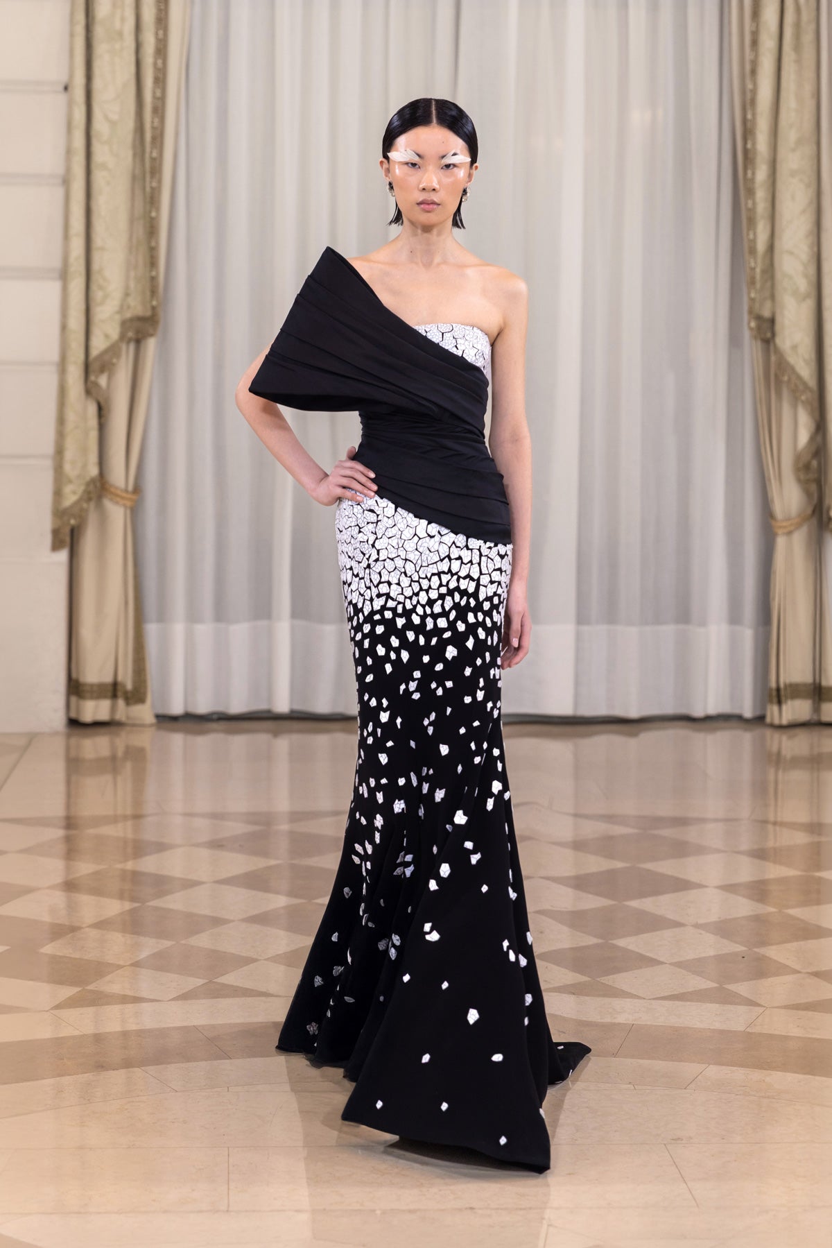 Introducing our draped mermaid mosaic dress. Crafted from jet-black crepe and peau de soie, this design features an asymmetrical one-shoulder silhouette with sculpted draping that wraps the bodice in clean lines. The skirt is adorned with hand-applied white marbled mosaic embellishment, arranged organically to create depth, texture, and a refined contrast against the dark base, enhancing the fluid mermaid silhouette with a small train.