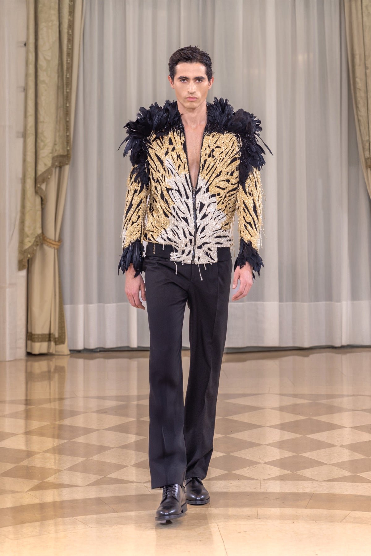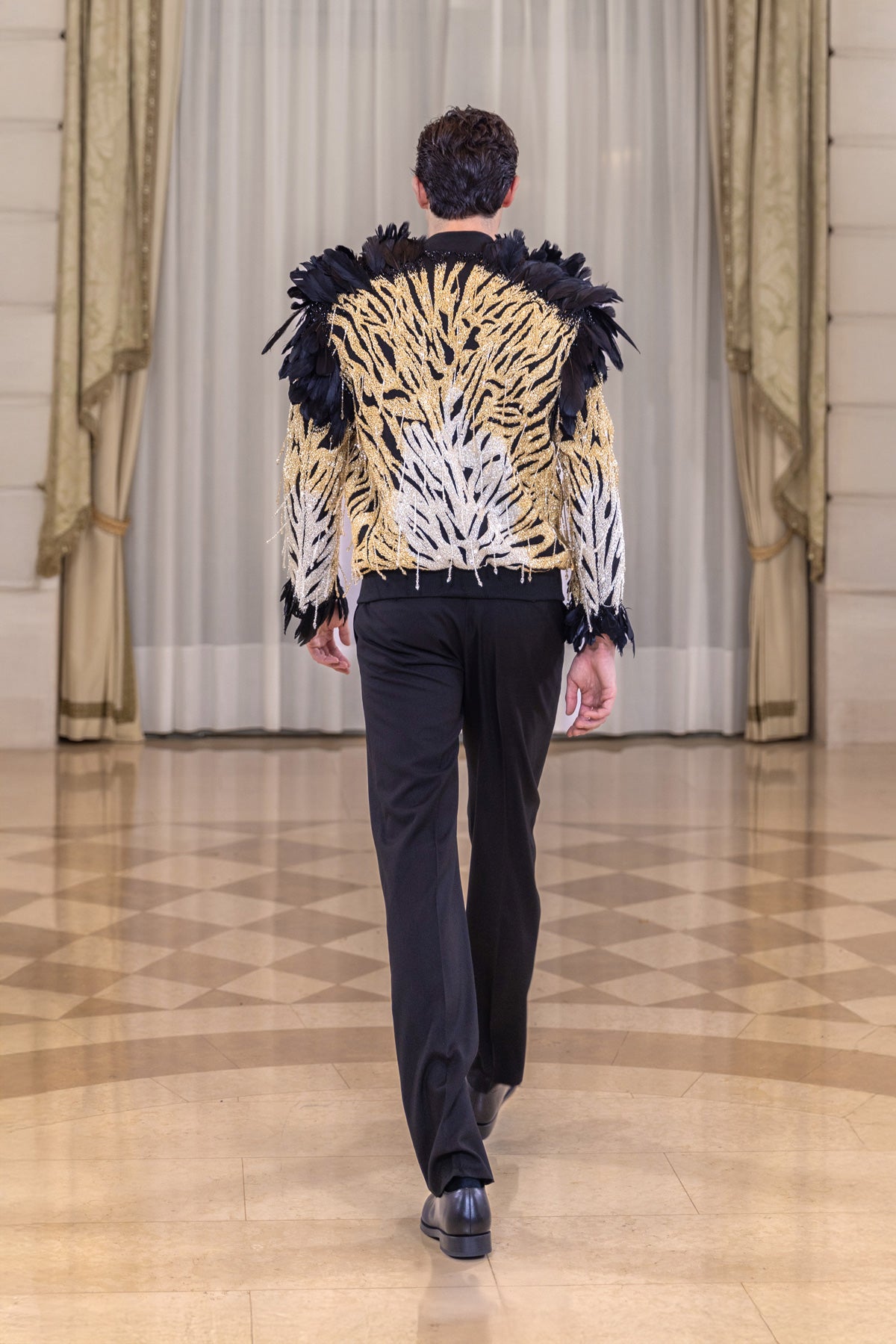 Step into bold sophistication with this embroidered bomber jacket, richly detailed with gold botanical motifs meticulously stitched to create depth and texture across the surface. Jet black feathers frame the shoulders and collar, adding volume and a dramatic edge while softening the jacket’s structured silhouette. A front zip closure introduces a modern finish, while tailored wool cashmere jet-black pants complete the look.