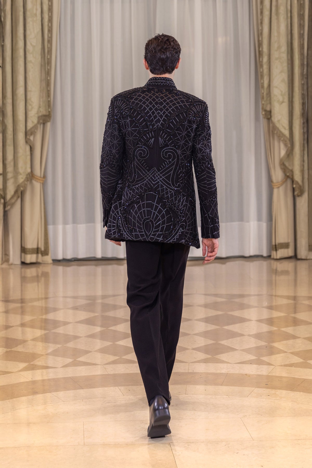 Step into our embroidered tailored set featuring a jetblack jacket and trousers crafted from structured leather strips with hand embroidery. The jacket is defined by a geometric leather framework layered with symmetrical embroidery and subtle beadwork, adding depth and texture while maintaining a sharp silhouette. Clean lines and a structured collar reinforce the tailored construction. The trousers are minimal, balancing the detailed jacket. The look is completed with a jet-black cotton shirt finished with a mandarin collar and a wool cashmere pants.