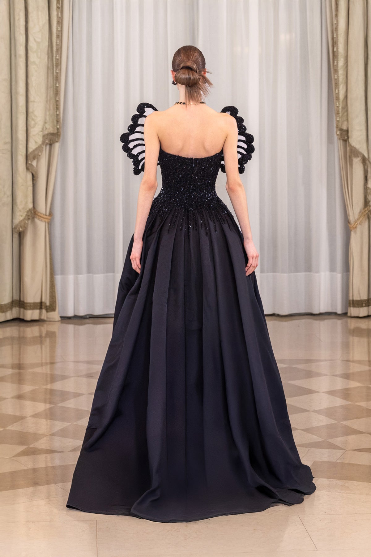 Step into our jet-black embroidered sculptural dress, crafted from luxurious peau de soie. The bodice is entirely hand-embroidered using dense black glass beads, sequins, meticulously layered to create raised, sculptural surfaces. The embroidery is engineered in elongated, flowing formations that converge at the center, emphasizing the waist while extending upward into dramatic arched extensions at the neckline. The beadwork transitions seamlessly into softer embroidered trails that cascade over the upper skirt, allowing the texture to dissolve gradually into the smooth silk base.