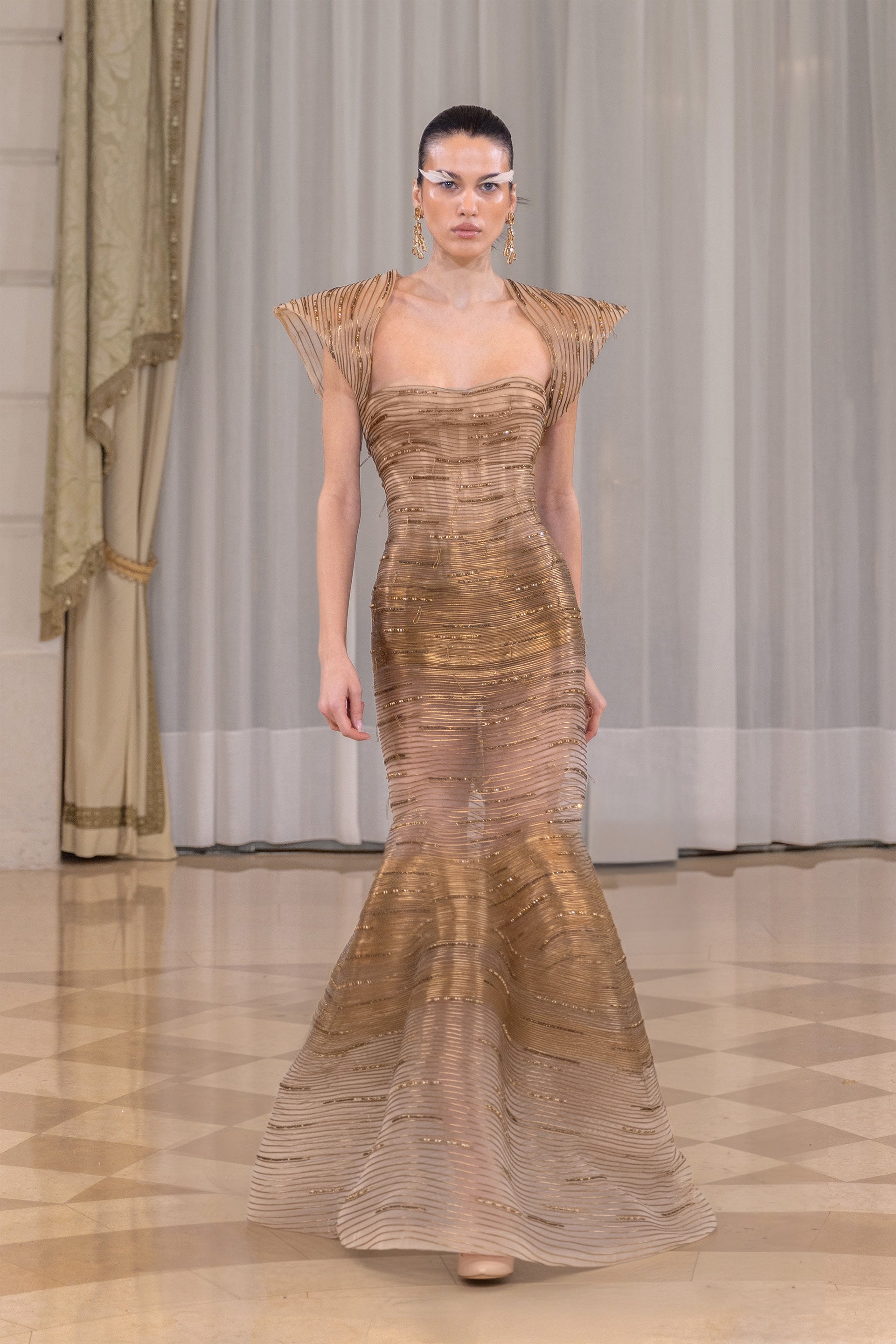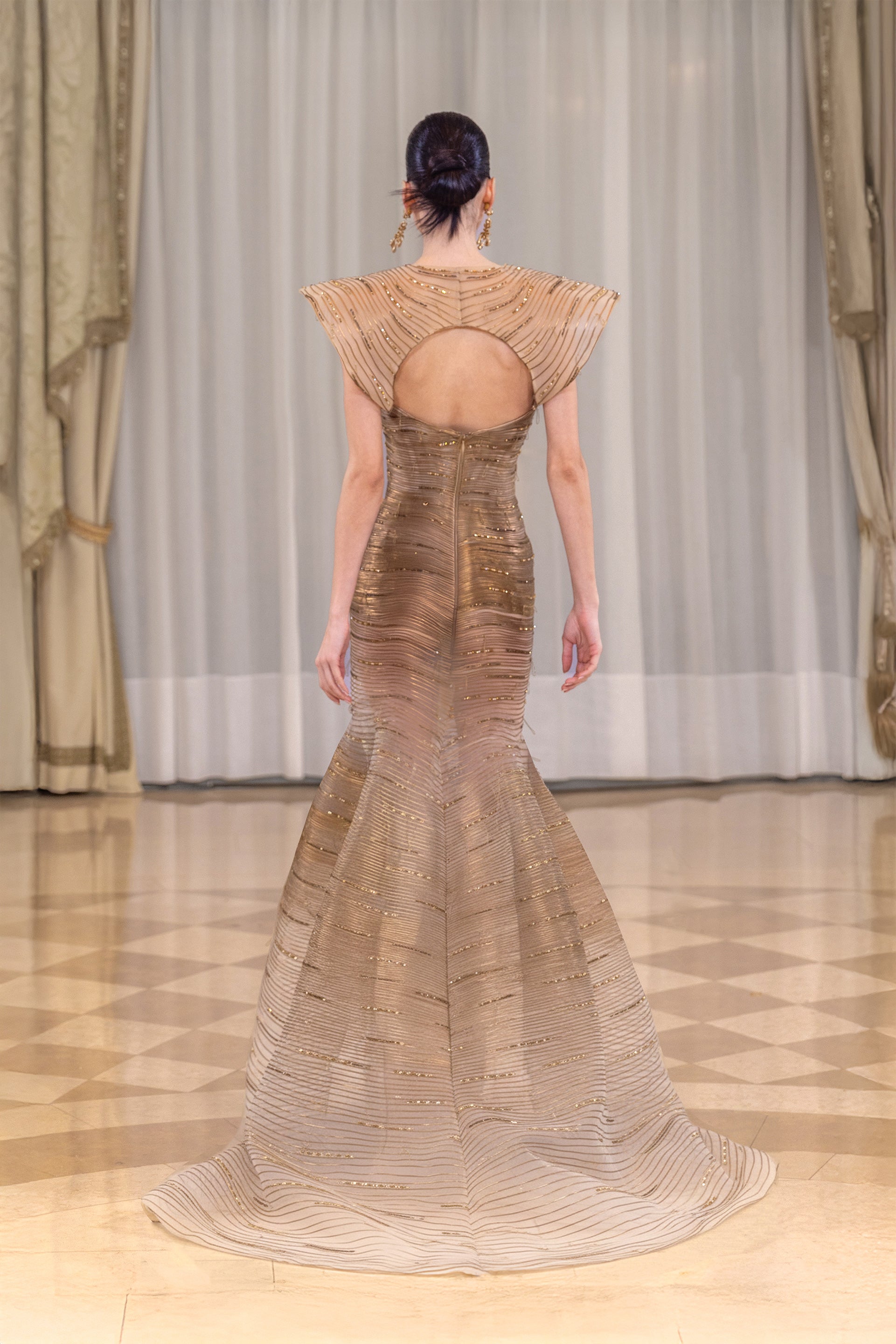 Introducing our linear embroidered dress. The structured bodice is entirely hand-embroidered with dense horizontal lines of metallic gold beads and sequins, creating a richly layered surface with a controlled, luminous finish. The skirt opens into a full, voluminous shape, with the embroidery concentrated through the bodice to define the waist before transitioning seamlessly into the skirt, maintaining continuity and balance across the silhouette.
