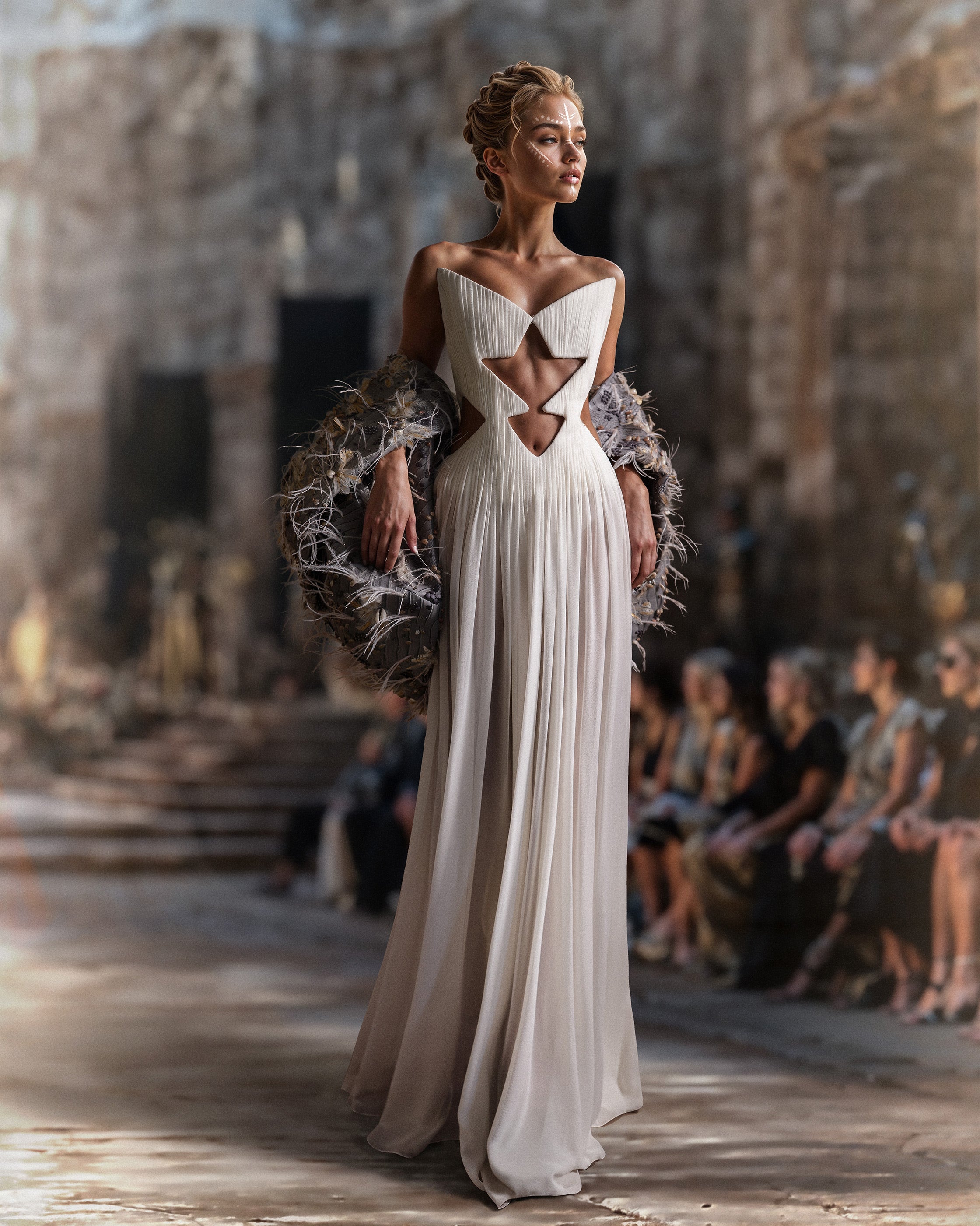 Layered over the gown is a striking structured jacket in silver leather, richly adorned with a tactile mosaic of mixed materials, and hand-placed feather-like accents. With its rounded silhouette and voluminous sleeves, the