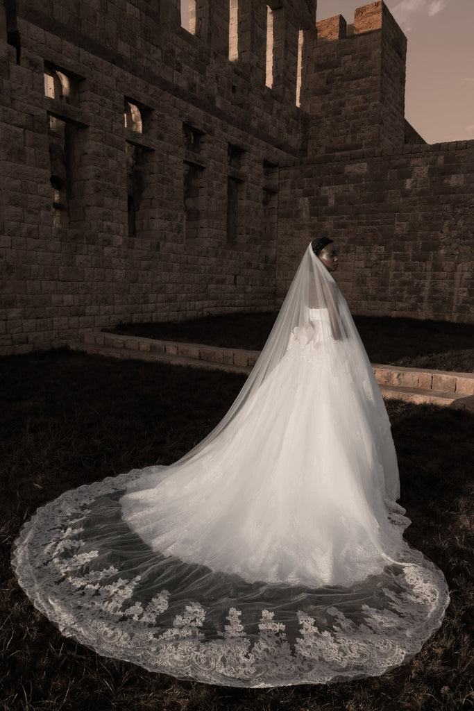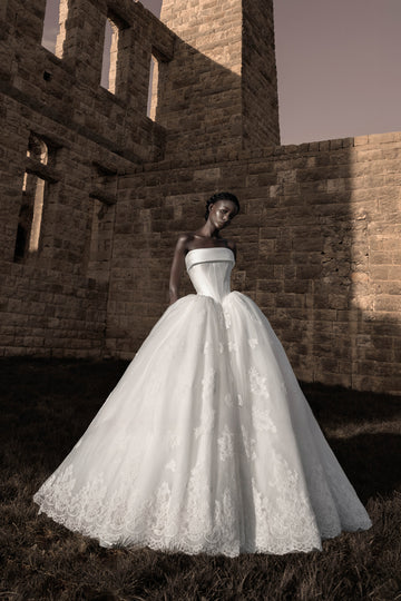 An enchanting off-white gown featuring a structured Mikado corset that sculpts the silhouette. The voluminous dentelle tulle skirt cascades into a sweeping train, richly adorned with lace appliqués and paired with a matching 3.25 meters veil.