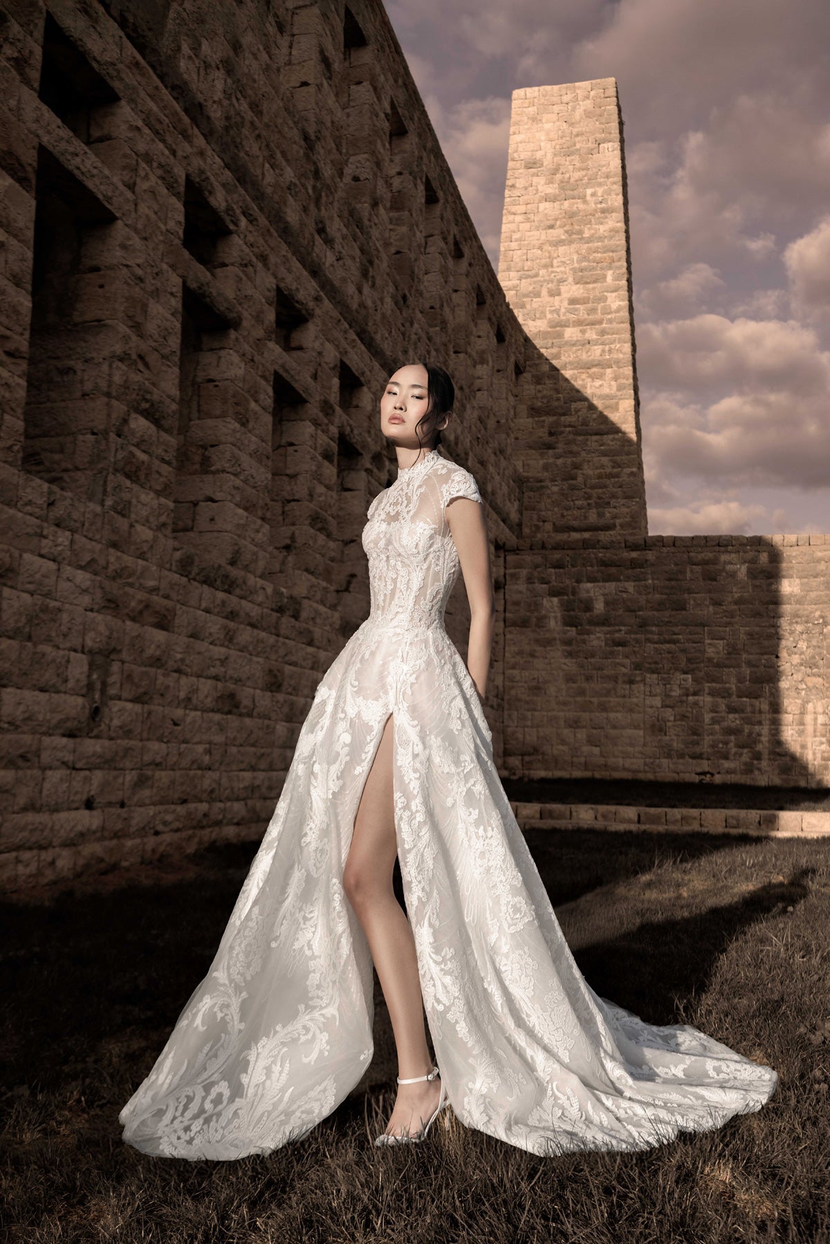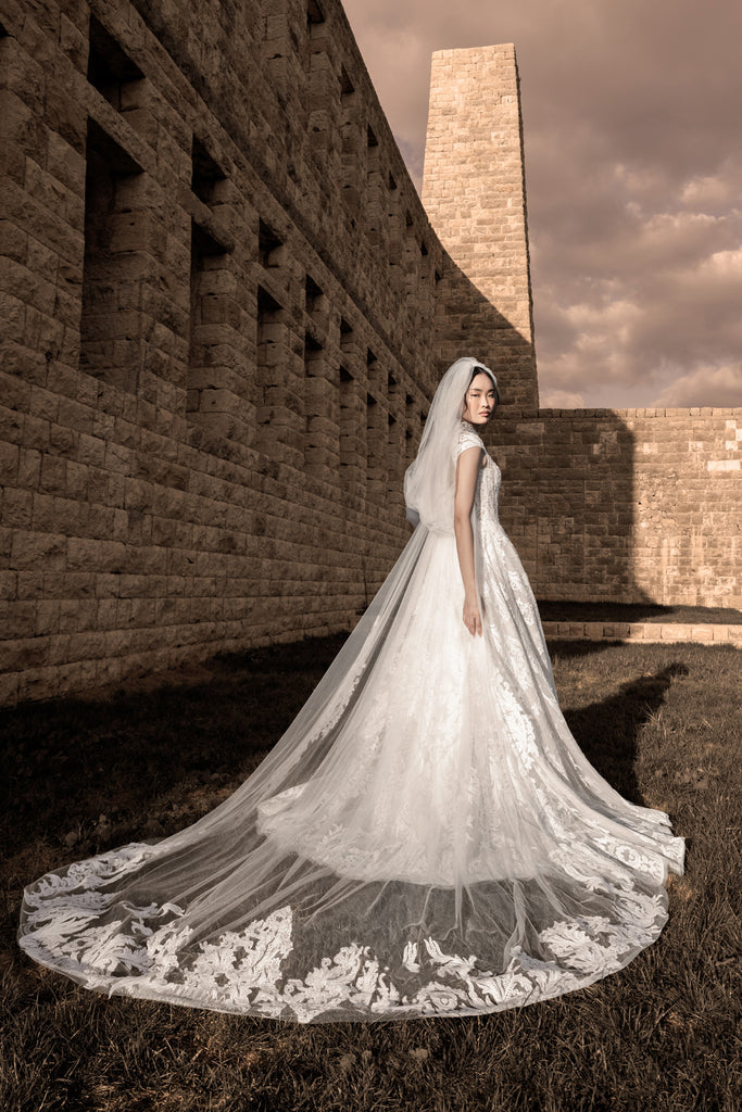 A captivating ivory tulle dress embroidered with an intricate design that flows seamlessly throughout. The draped neckline is embellished with threads, beads, and sequins that cascade onto the skirt. The look is completed with a matching 3.25-meter veil attached to the back of the dress. The skirt features a slit for added allure.