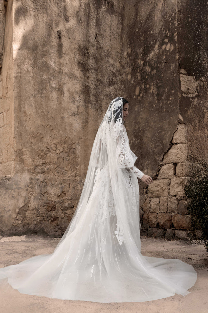 A striking ivory dress featuring a plunging V-neckline framed by romantic puffy tulle sleeves. The fitted bodice is richly adorned with intricate lace embroidery that cascades into an A-line tulle skirt, flowing gracefully into a soft train, paired with a matching 3.25 meters veil.