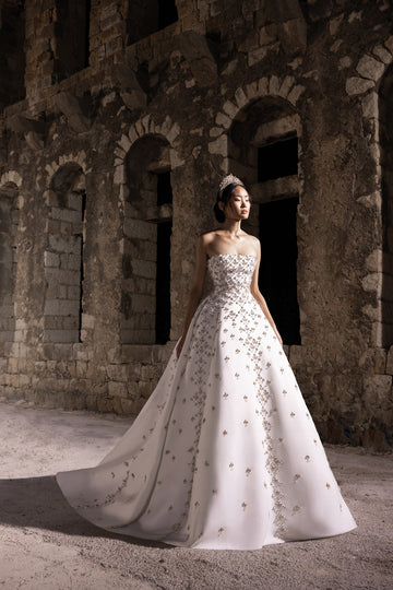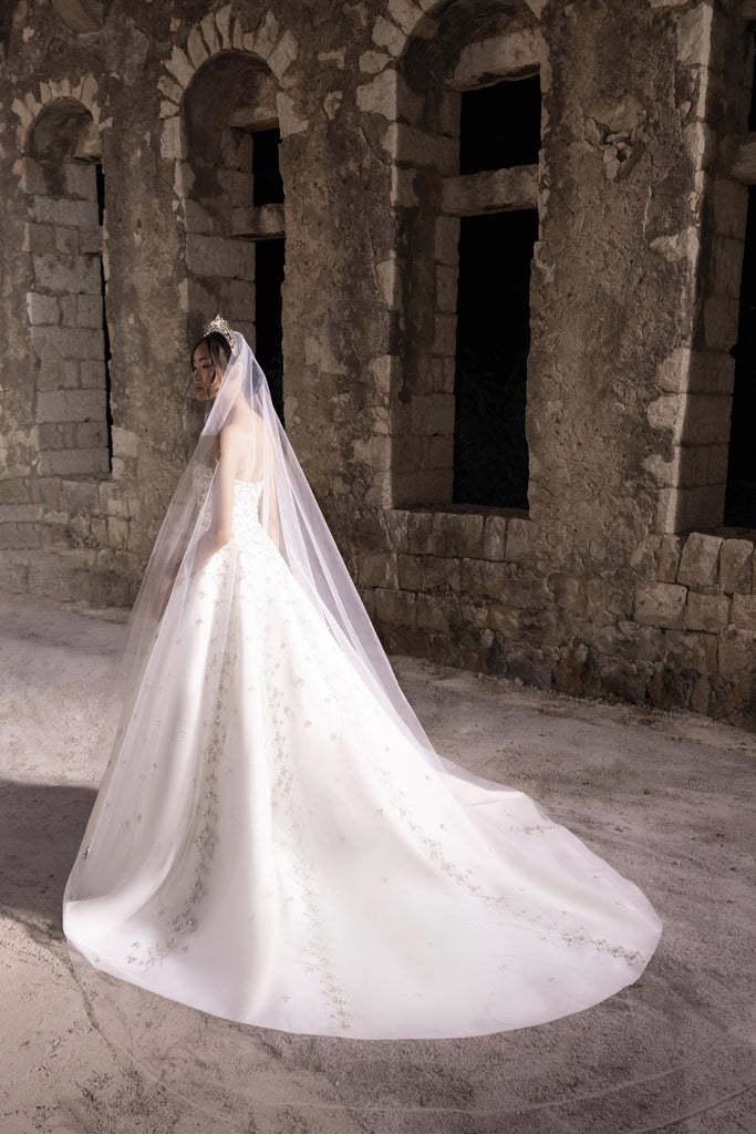 An elegant off-white scuba dress featuring a strapless neckline and a voluminous A-line silhouette. The gown is fully adorned with hand embroidered intricate gold and pearl embroidery that cascades symmetrically across the bodice and skirt. Paired with a 3.25 meters plain tulle veil.