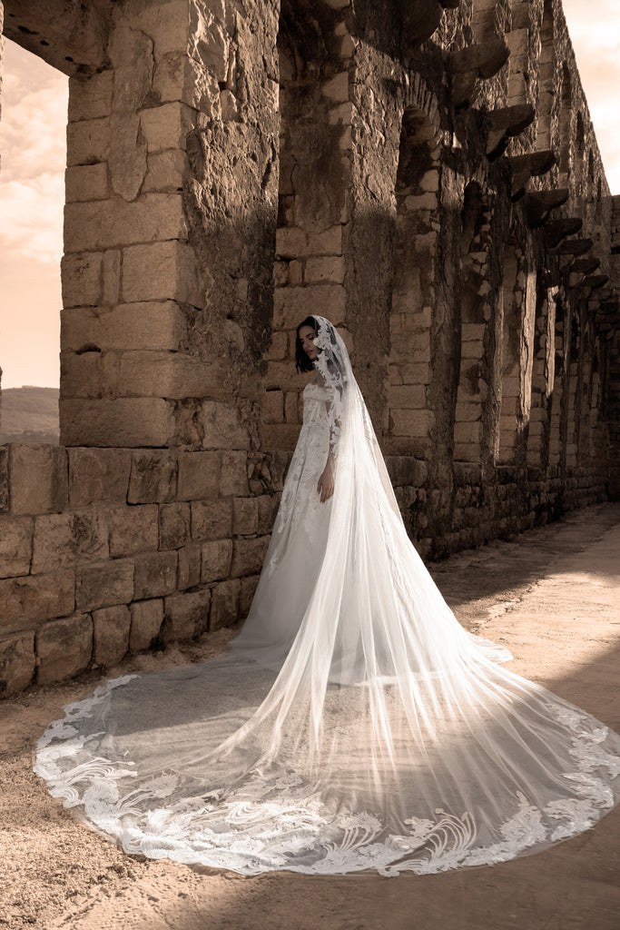 This dress features a classic ivory hue with a breathtaking design, it boasts a delicate off-shoulder neckline. The fitted bodice is elegantly adorned with intricate floral embroidery that flows seamlessly into a layered voluminous tulle skirt. The dress is finished with a train that trails gracefully behind. Paired with matching 3.25 meters veil.