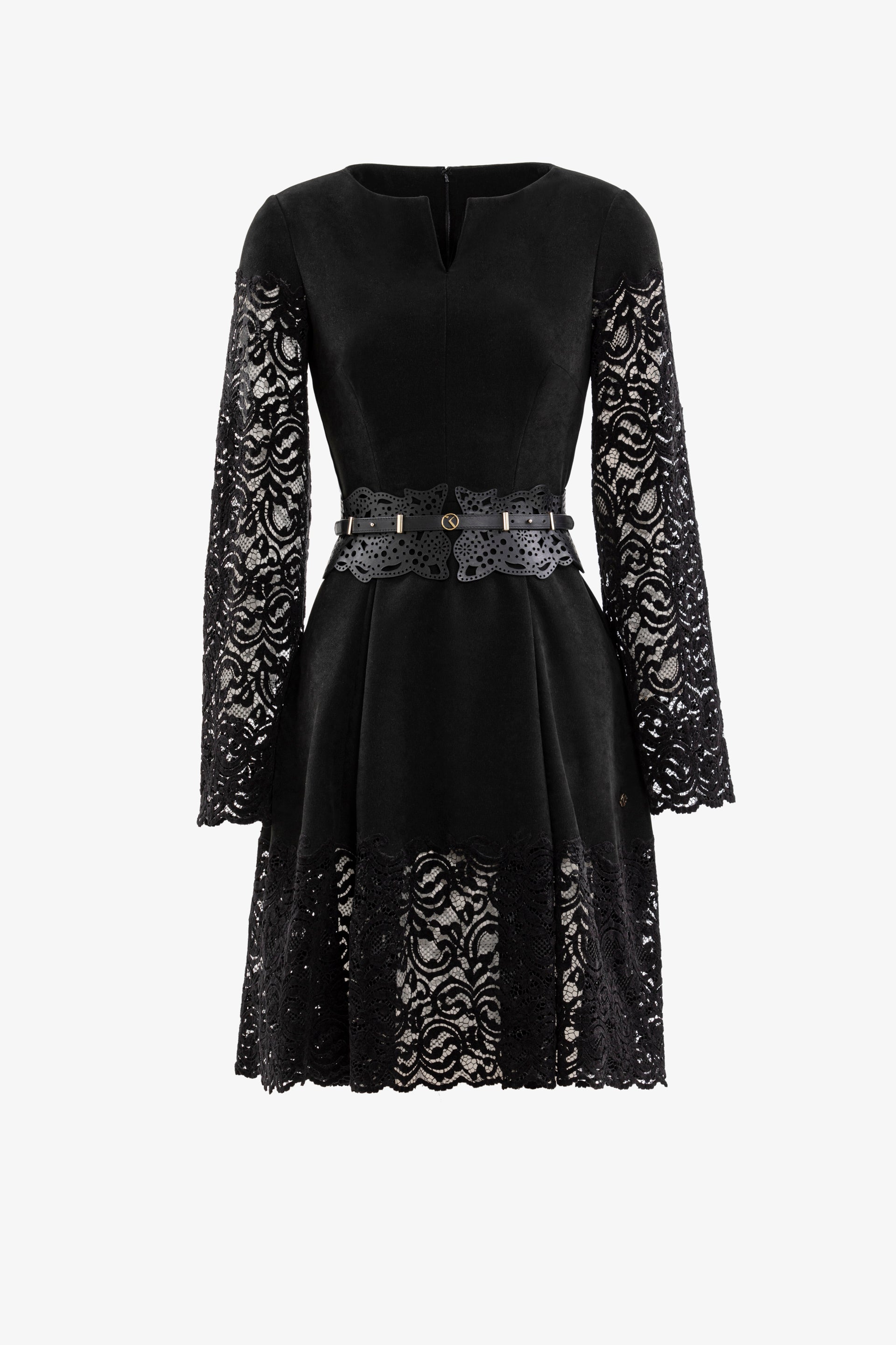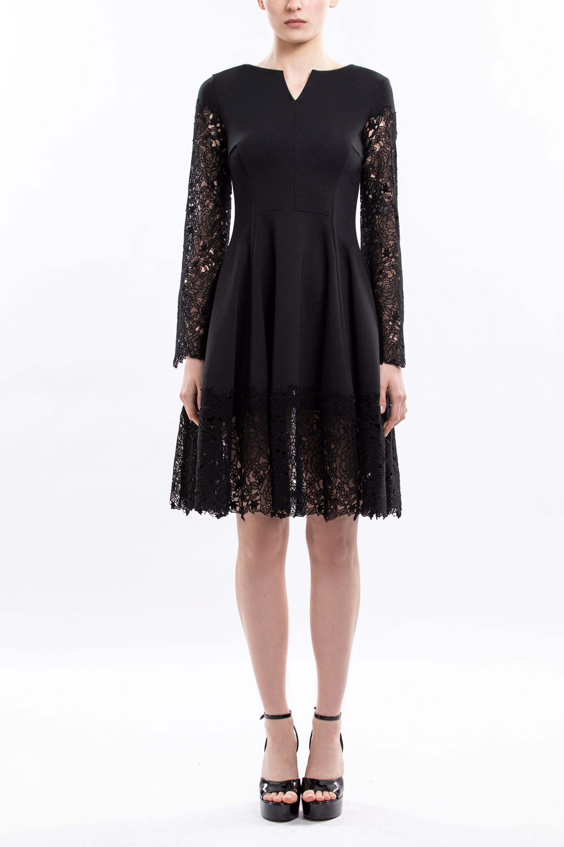 Short jet black lace dress with delicate lace detailing on the sleeves and skirt hemline