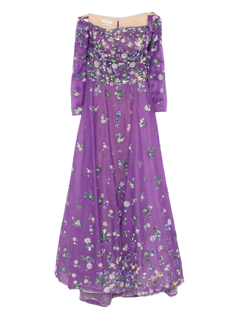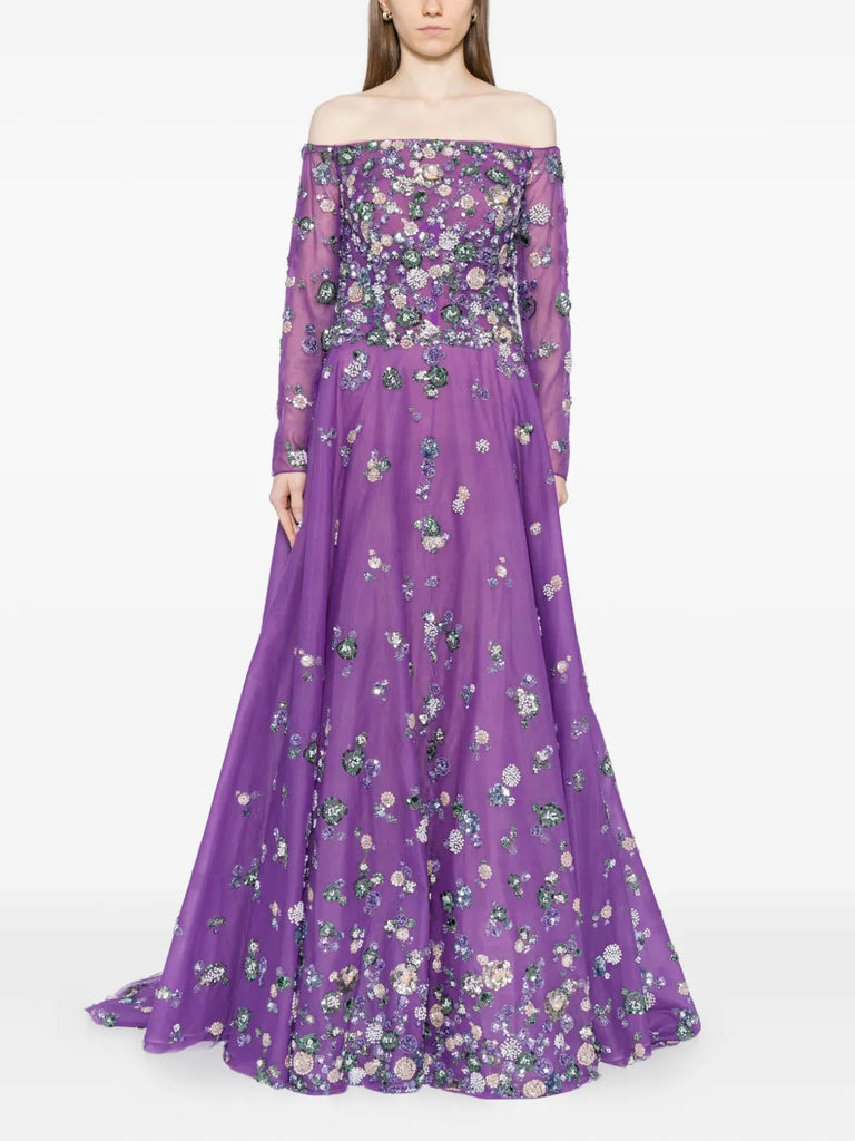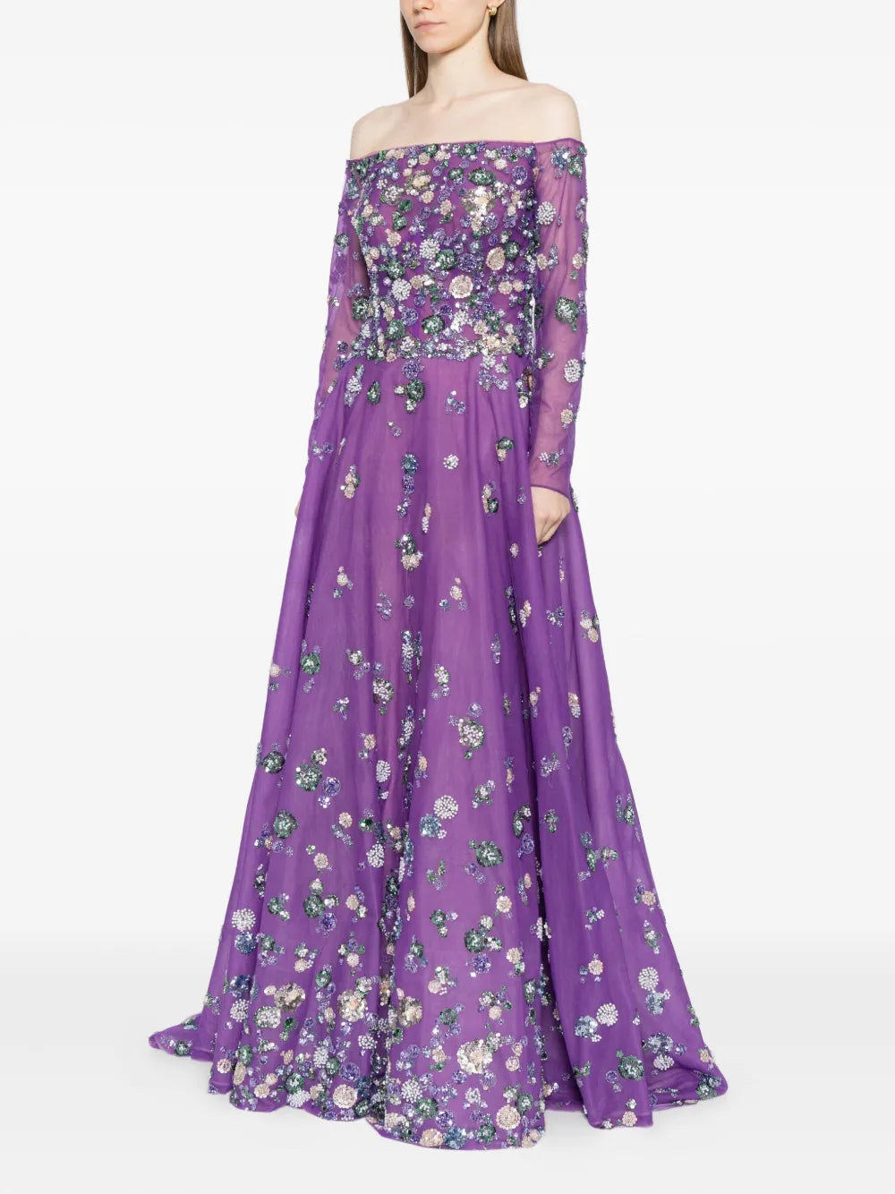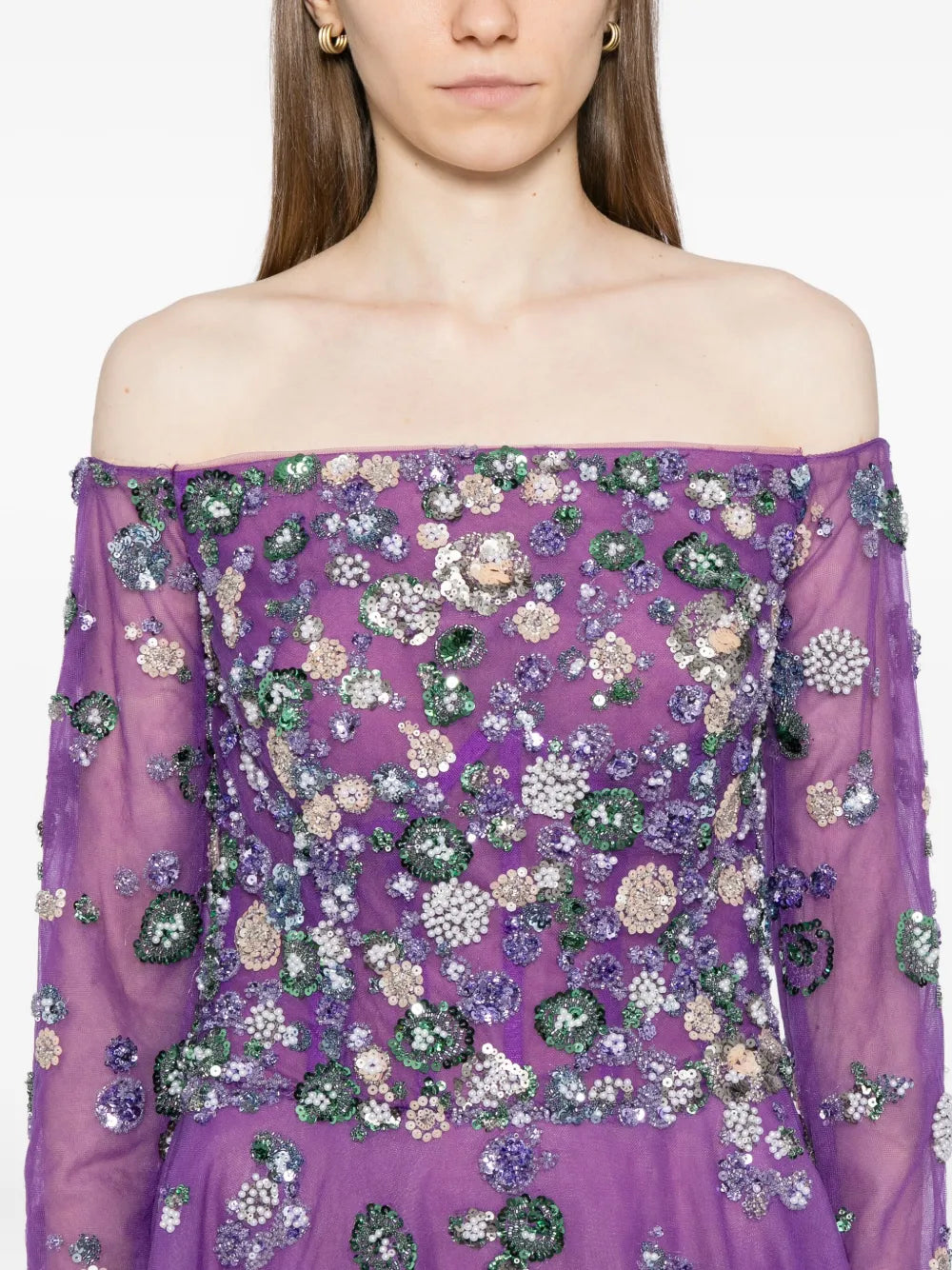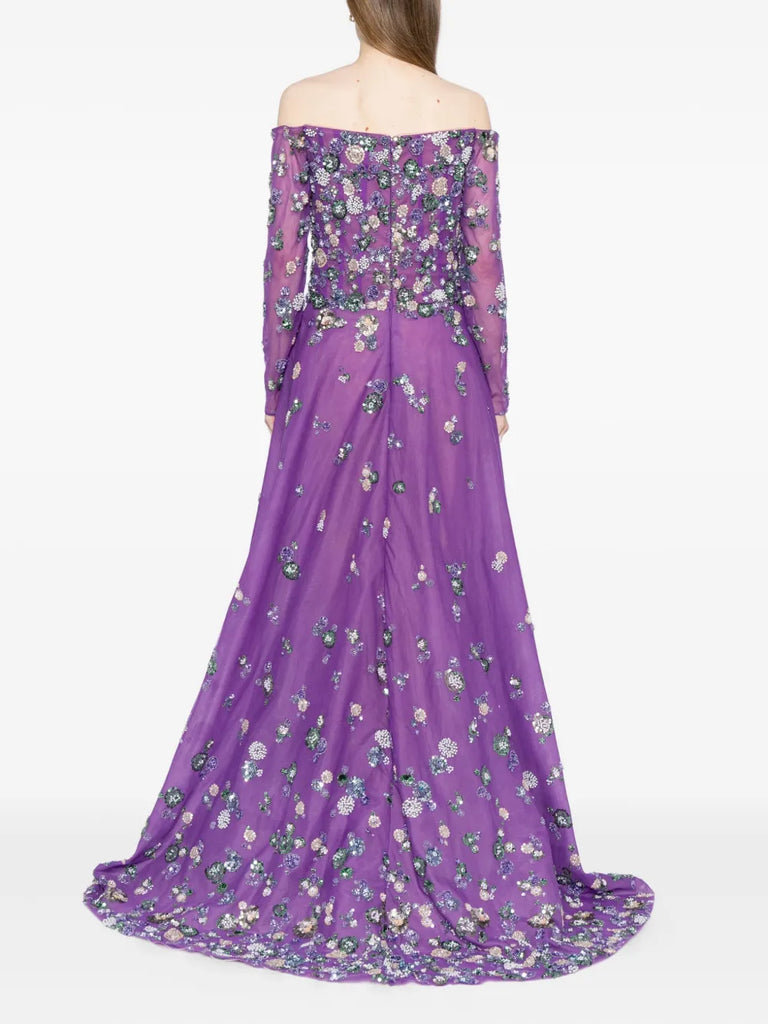 Elegant and enchanting, this tulle beaded dress captures the essence of timeless beauty. Its off-shoulder sleeves delicately frame the neckline, adding a touch of allure to the ensemble. The flared skirt gracefully cascades down, creating a silhouette that is both flattering and sophisticated. The dress is adorned with multicolored scattered dotted beading, each bead meticulously placed, forming a mesmerizing pattern that shimmers with every movement.