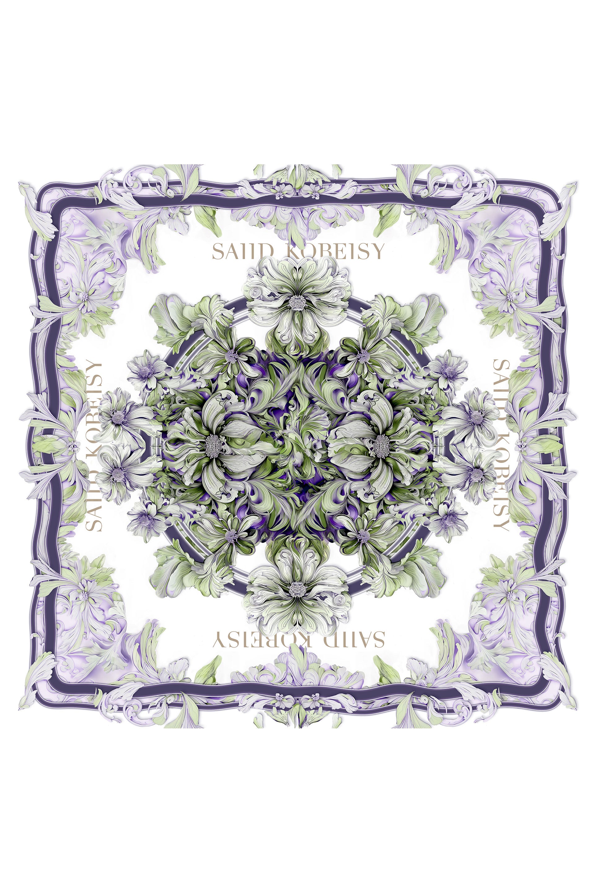 This scarf features a printed flower pattern inspired by the enchanting honeysuckle flower. The harmonious blend of purple and lime green hues creates a lively and refreshing aesthetic.
