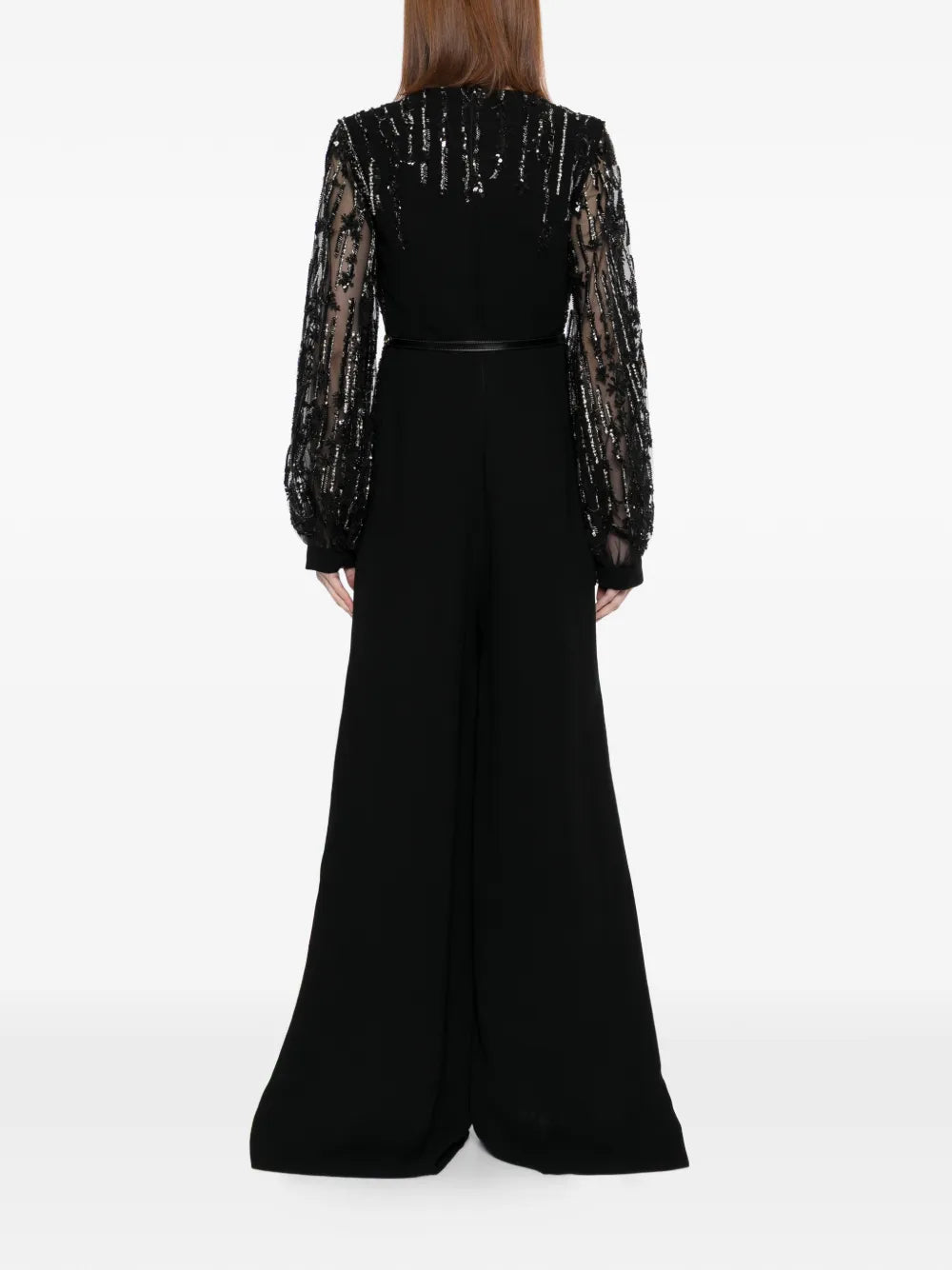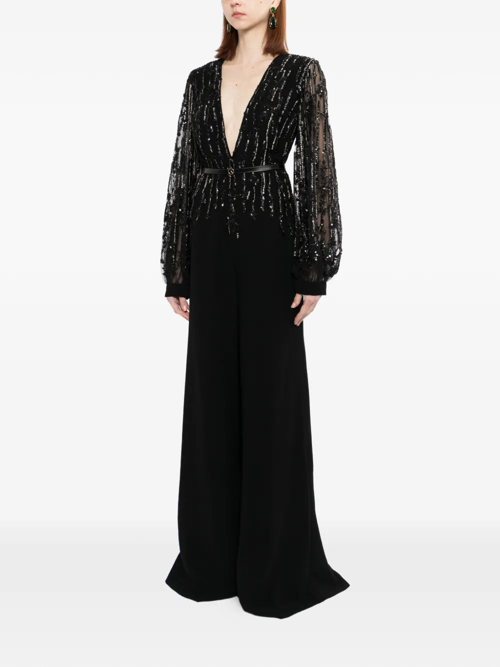 The marlin crepe jumpsuit is adorned with intricate beadwork, flowing seamlessly from the bodice down into the pants. With its long muslin sleeves and deep V neckline, it exudes a glamorous appeal. Paired with marlin 100% leather SK belt.