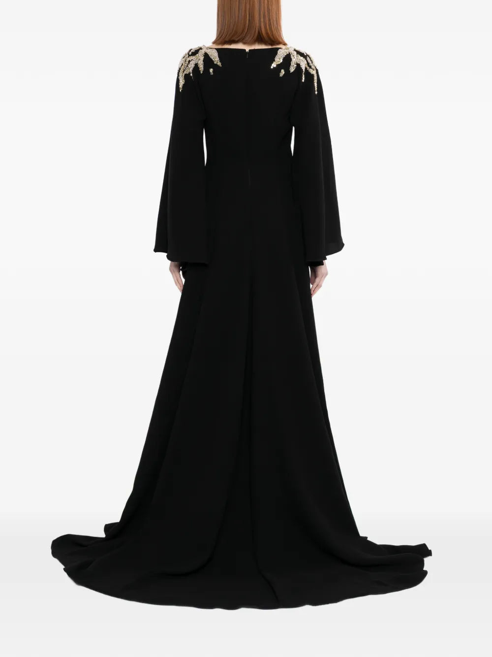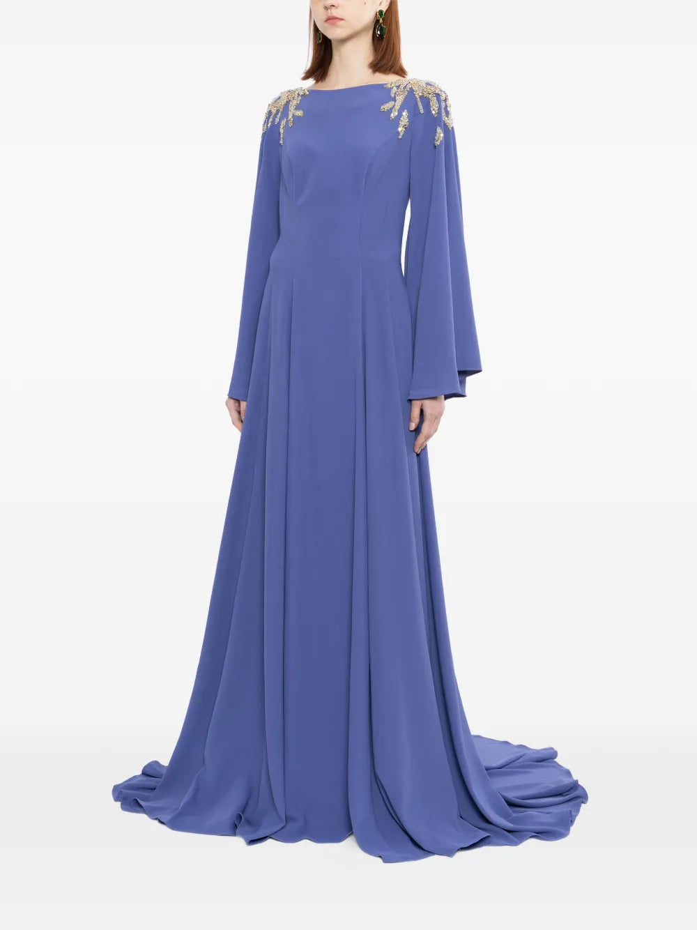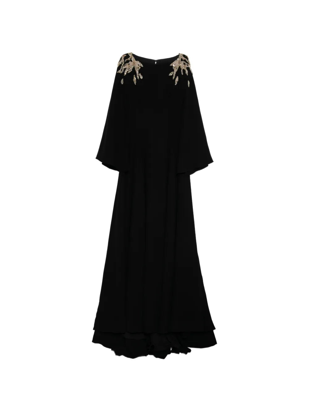 An Italian plum kaftan made from luxurious crepe fabric, featuring wide sleeves and a flowing skirt. The design is beautifully embellished on the shoulders with silver and light gold beads, sequins, and crystals.