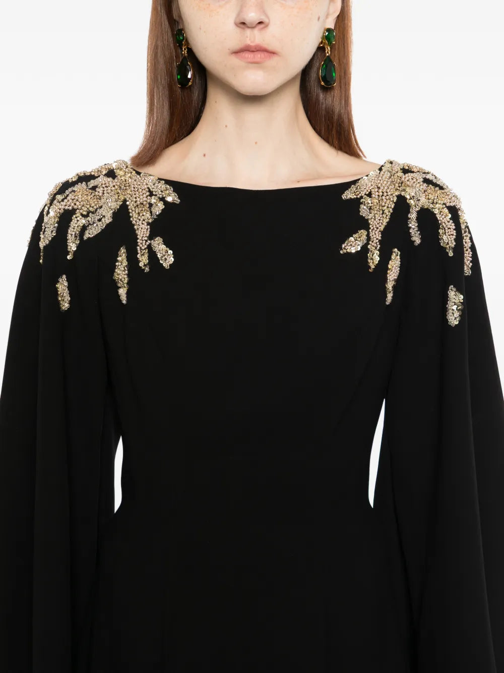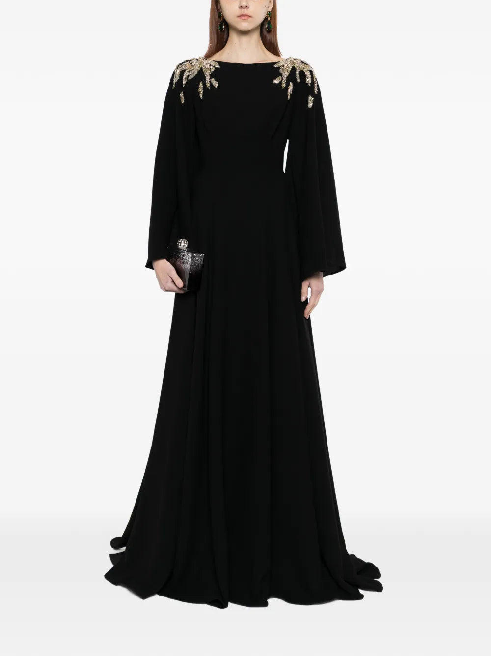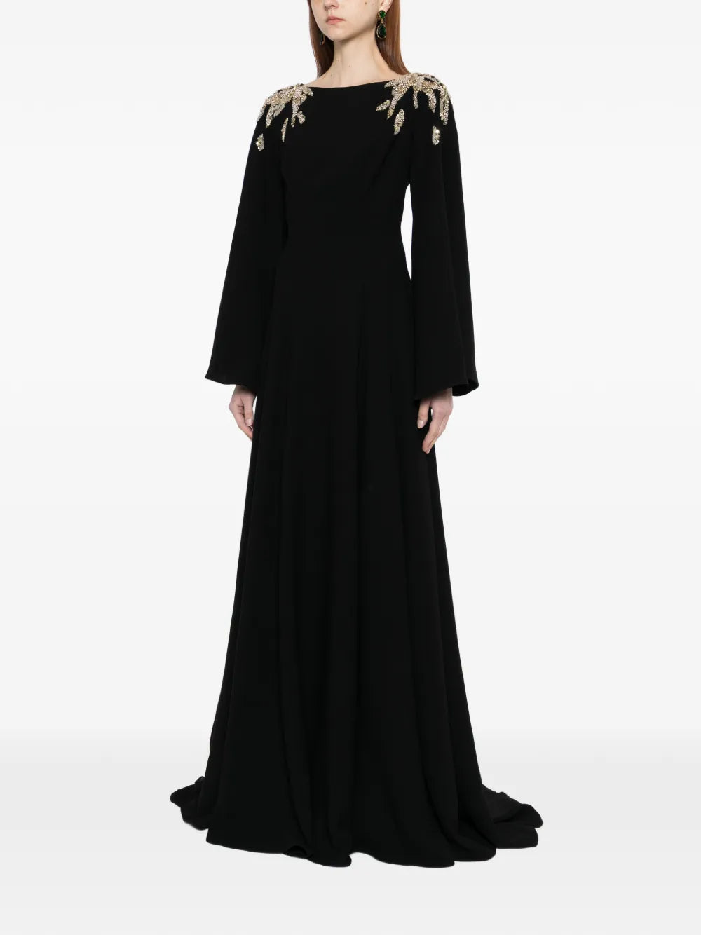 An Italian plum kaftan made from luxurious crepe fabric, featuring wide sleeves and a flowing skirt. The design is beautifully embellished on the shoulders with silver and light gold beads, sequins, and crystals.