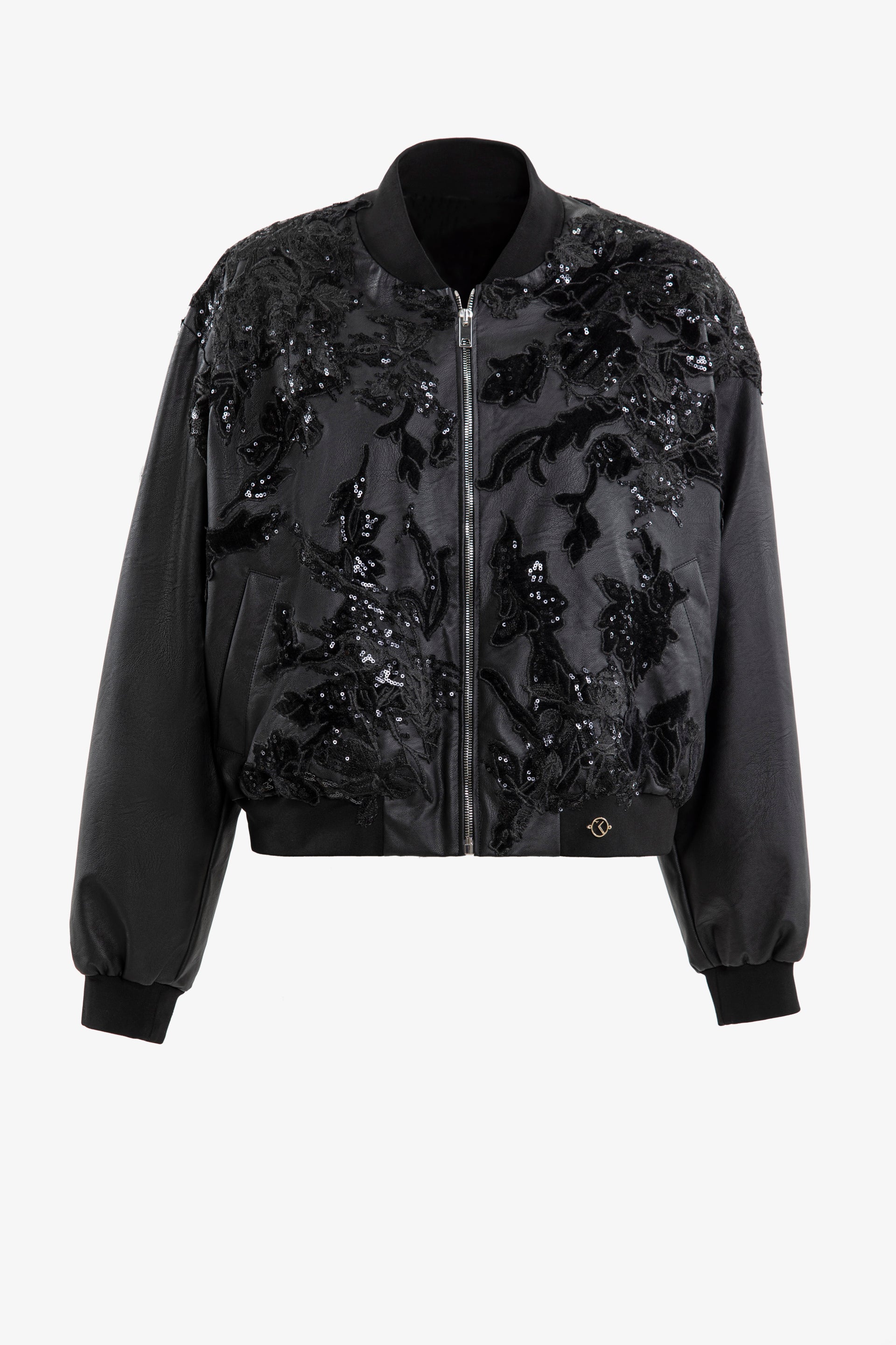 A jet-black embroidered bomber jacket featuring an intricate velvet pattern that extends seamlessly across the entire jacket, including the back. Adorned with light gold SK logo with A jet-black tulle marquise corset and jet black leather pants featuring pockets.