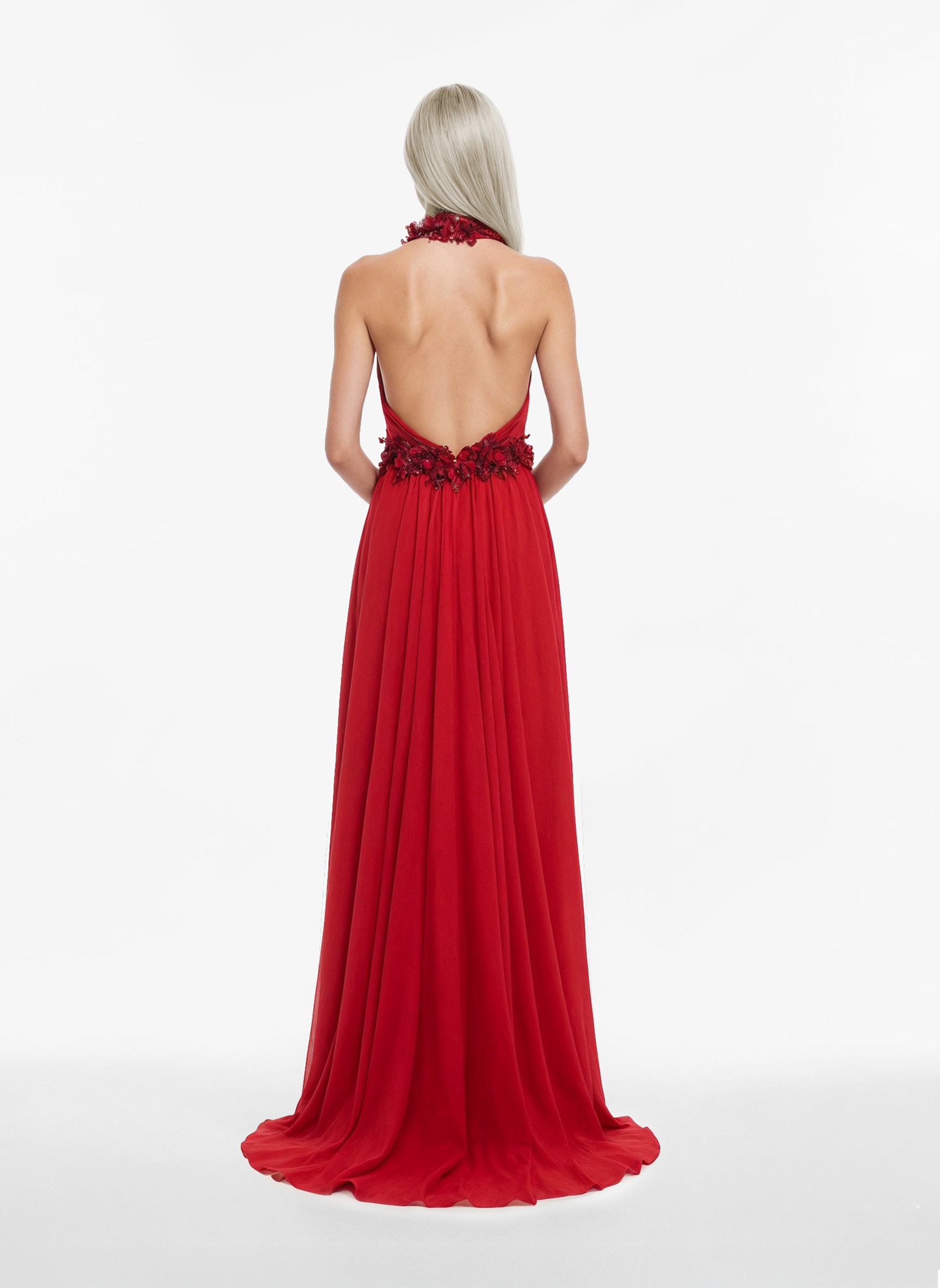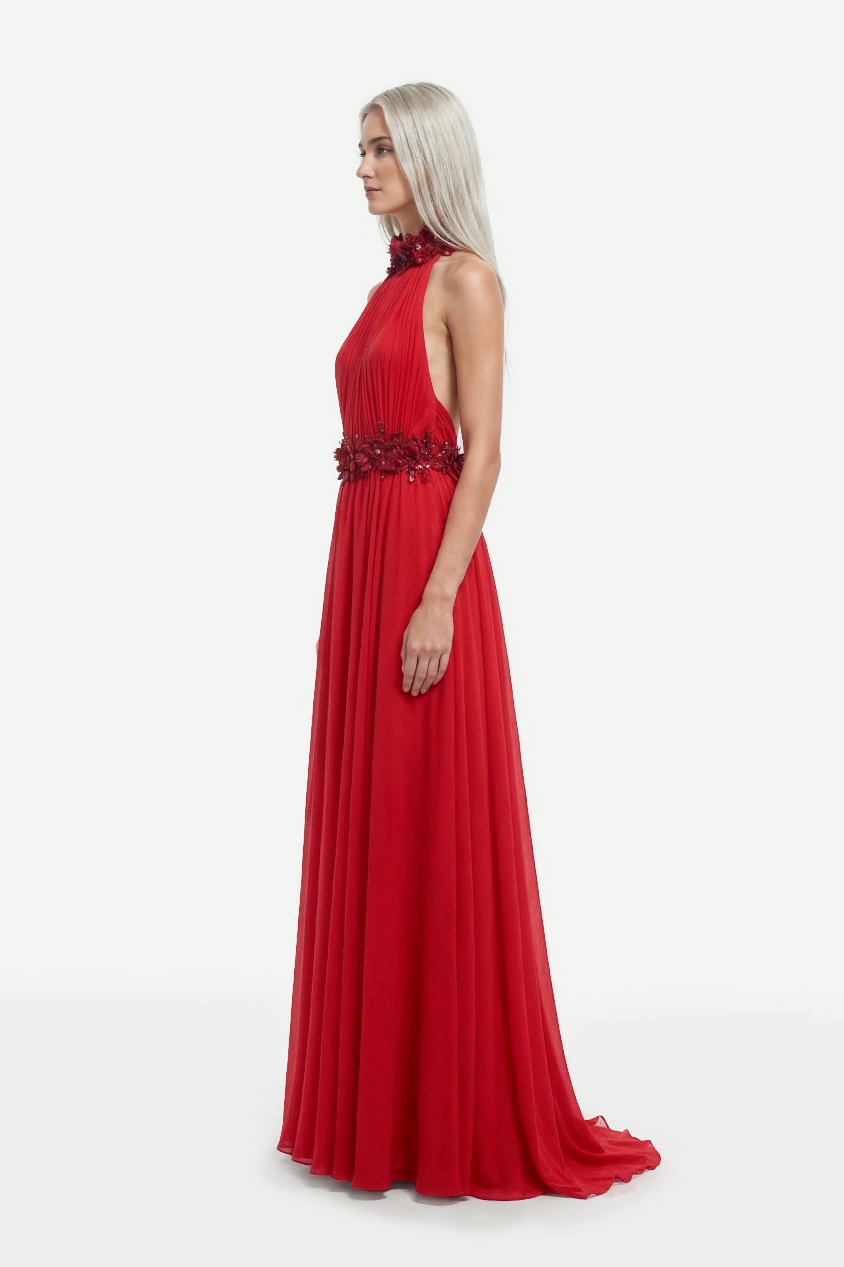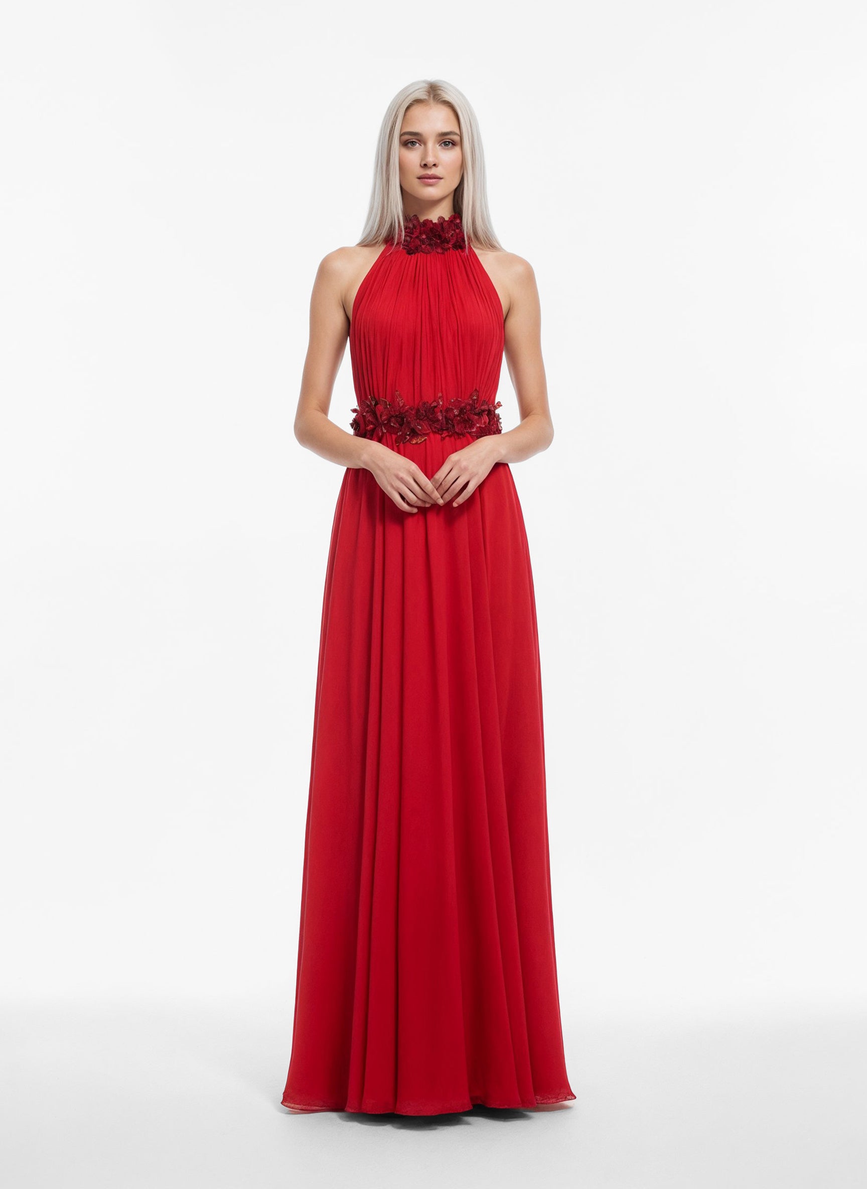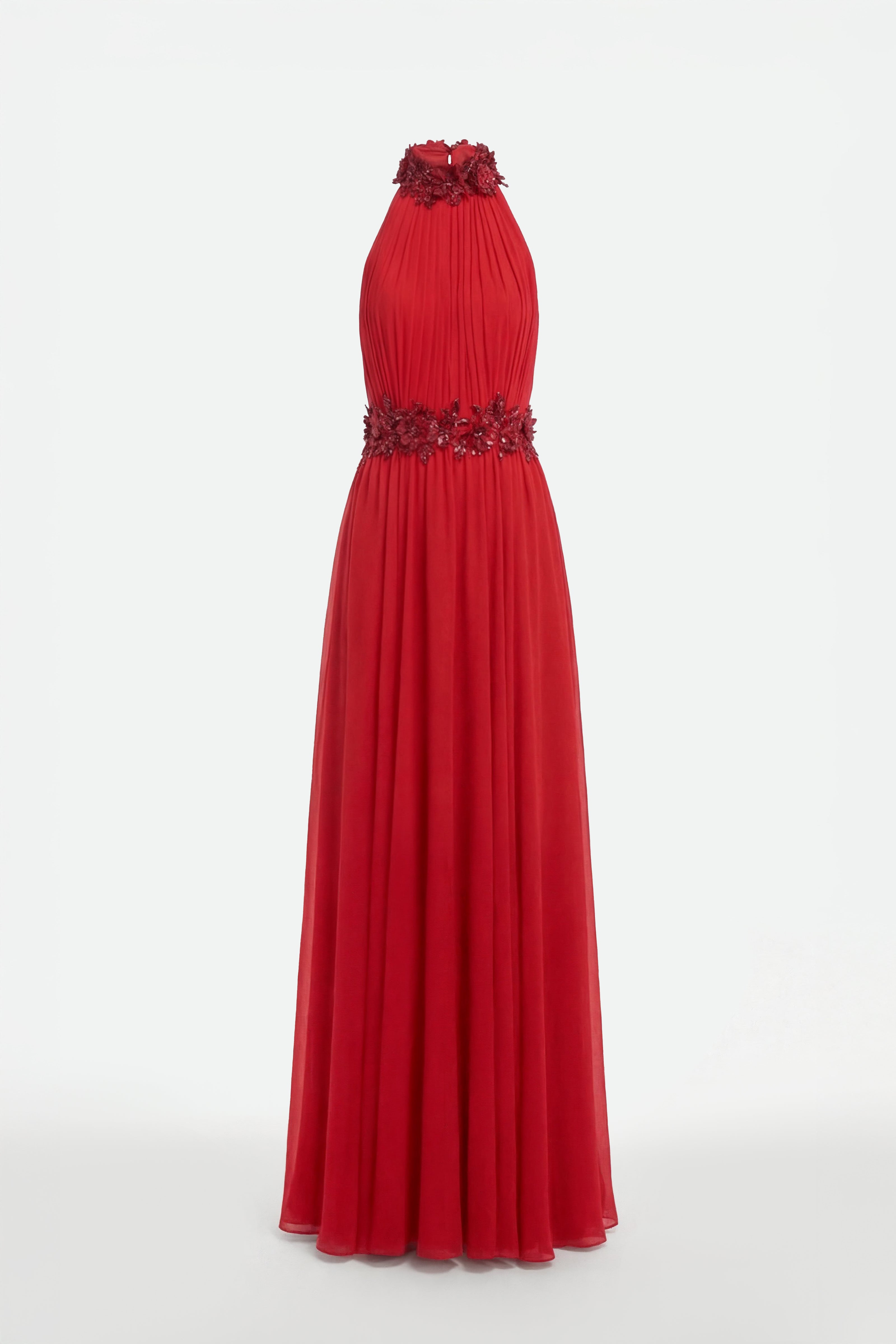 A Valentino red halter neck draped muslin dress, featuring exquisite 3D floral velvet embroidery adorning the neckline, collar, and waist. The fluid draping and sculpted embellishments create a refined and elegant silhouette.