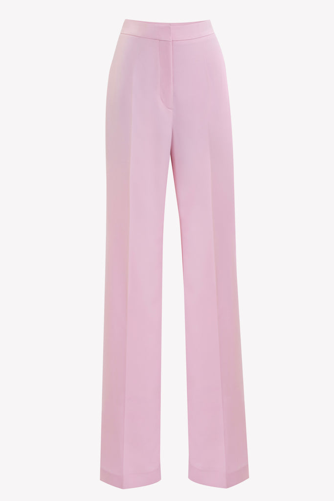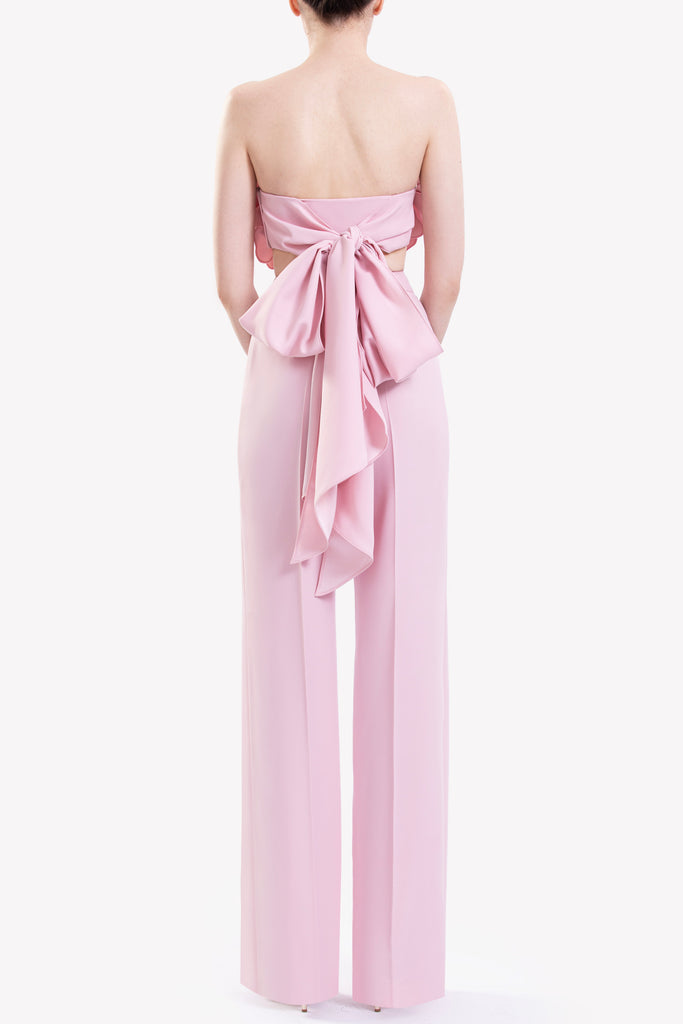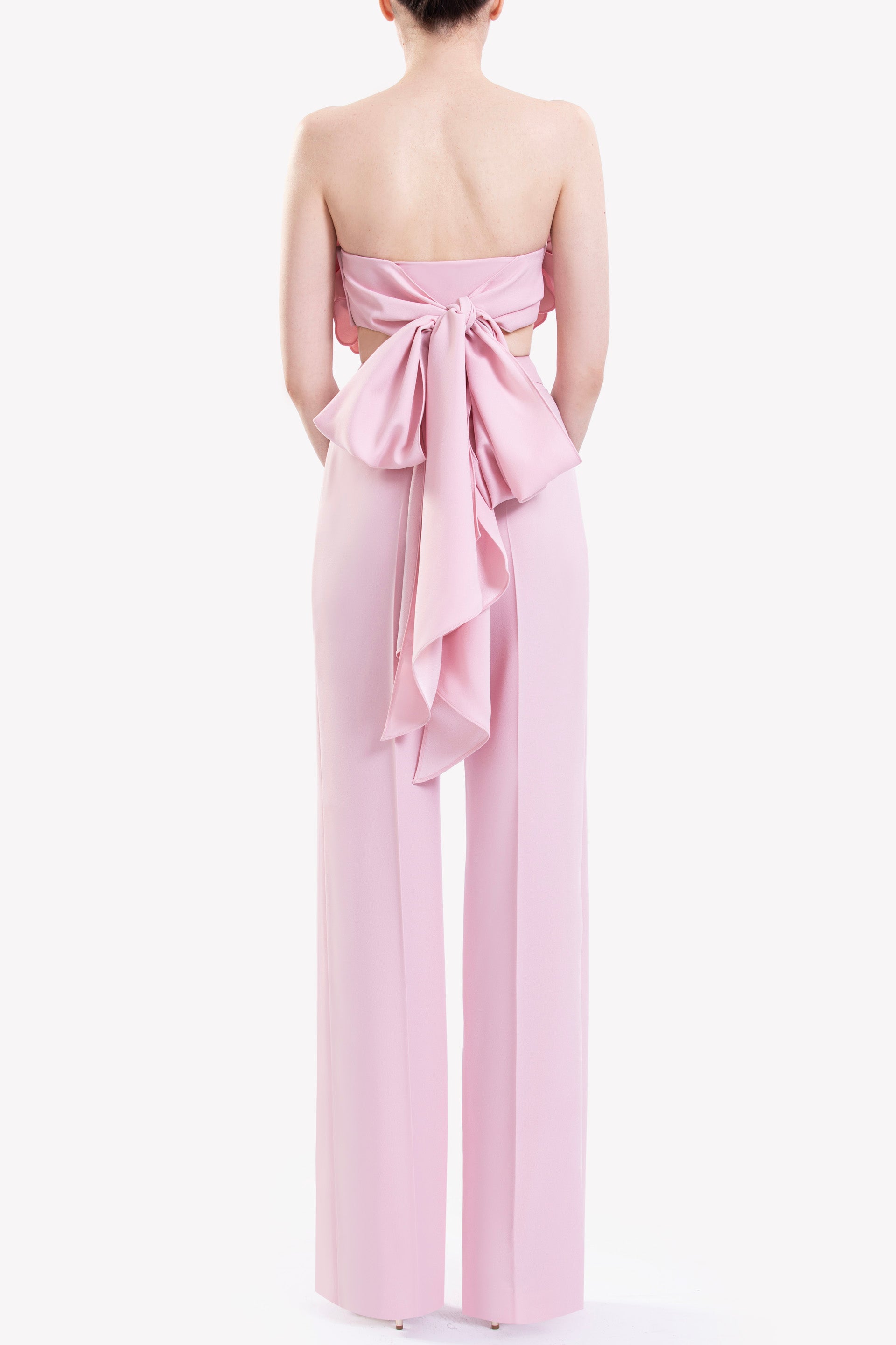 Salsa Rosa crepe strapless cropped top adorned with 3D floral embellishments with a big bow in the back paired with Salsa Rosa pleated straight-cut pants.