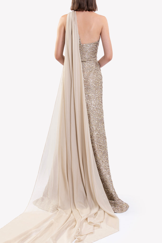 Gold brocade dress, featuring an asymmetrical neckline and single shoulder strap. Fitted bodice flows into a floor-length overlapping skirt with a high side slit, featuring a one-side muslin shawl.