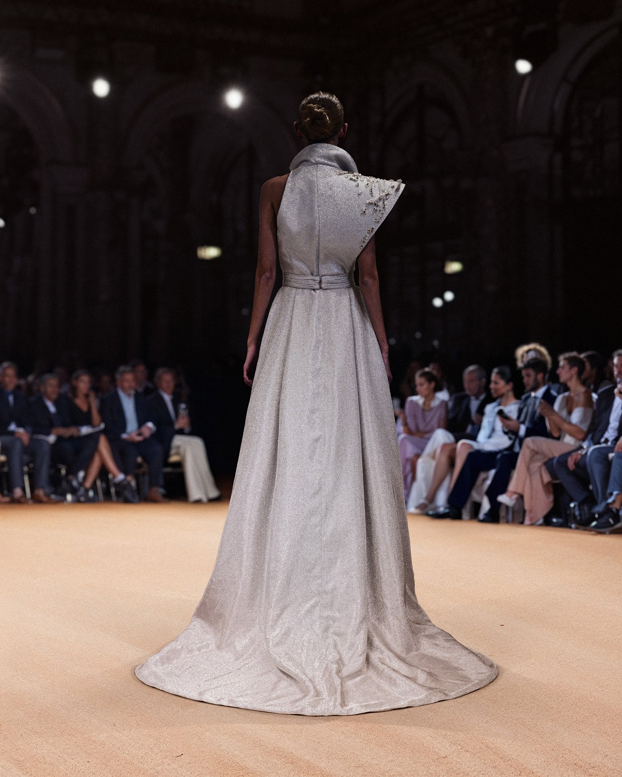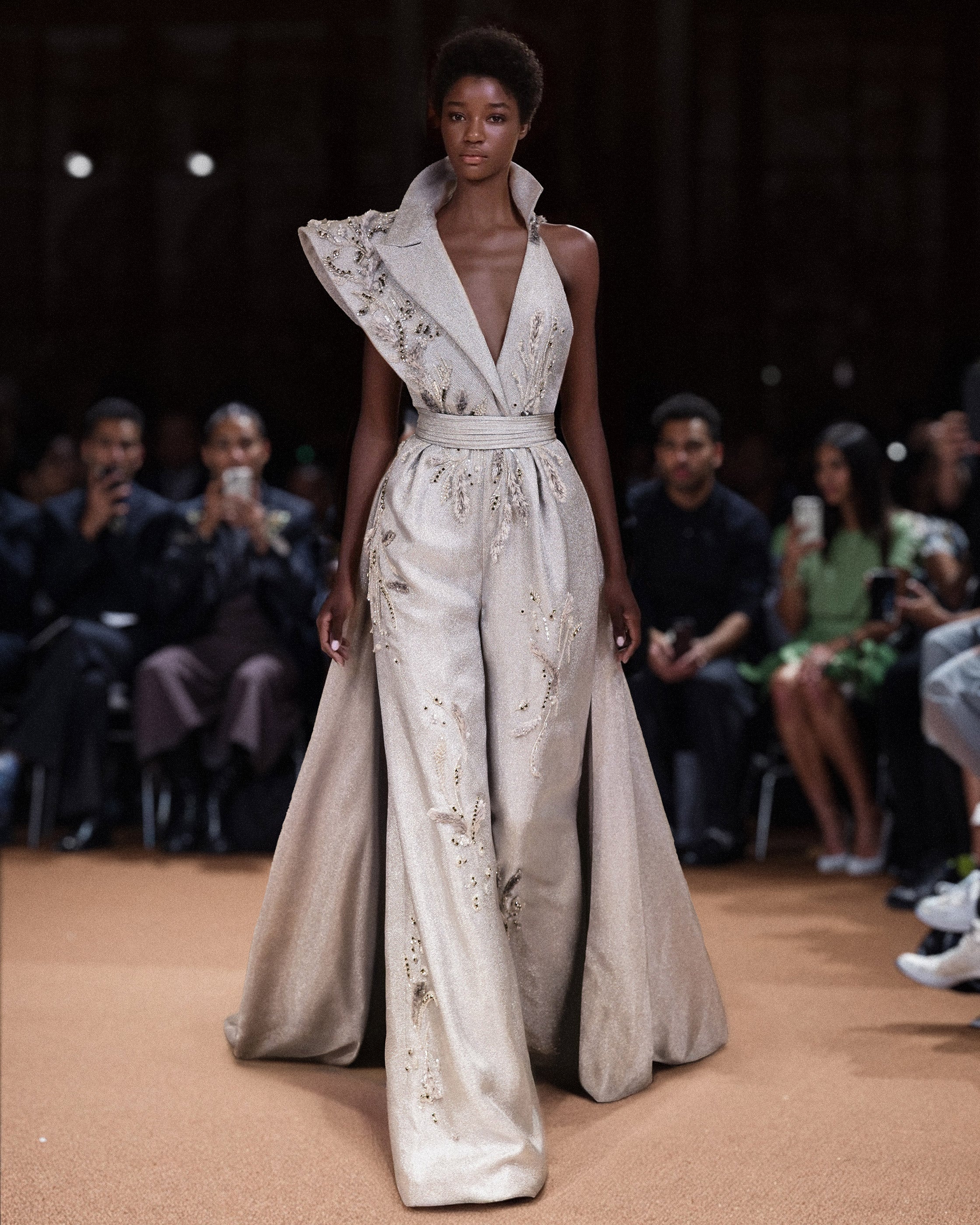 The jumpsuit is beautifully embellished on one side, showcasing intricate embroidery crafted with ivory and silver threads, complemented by delicate raffia and accented with minor anthracite crystals.