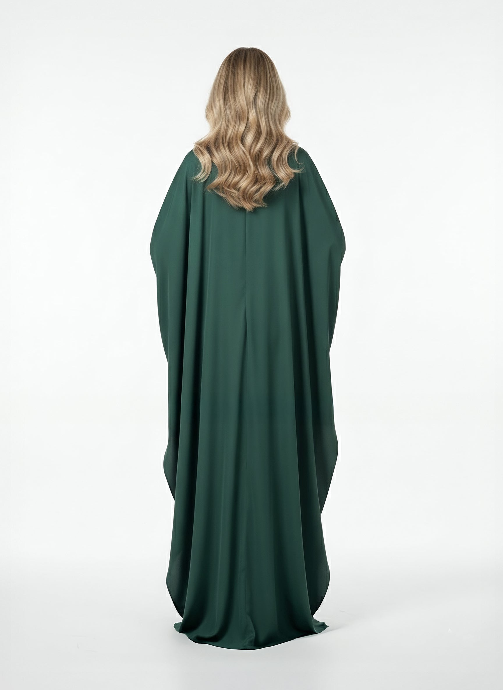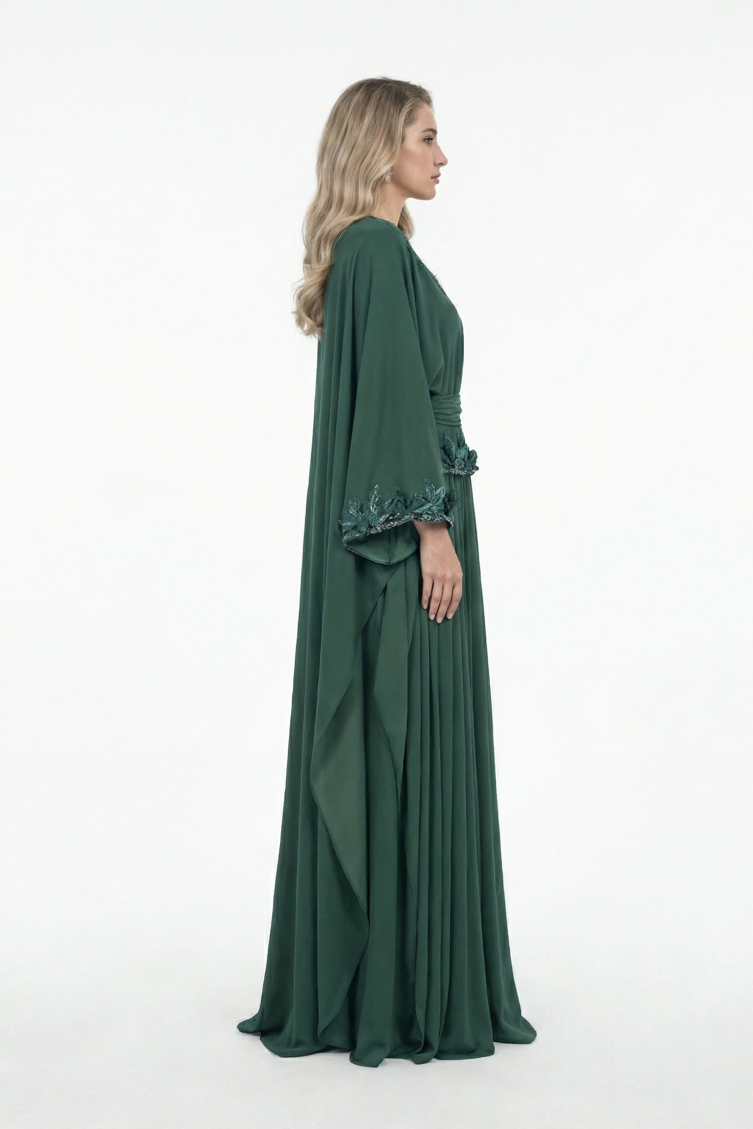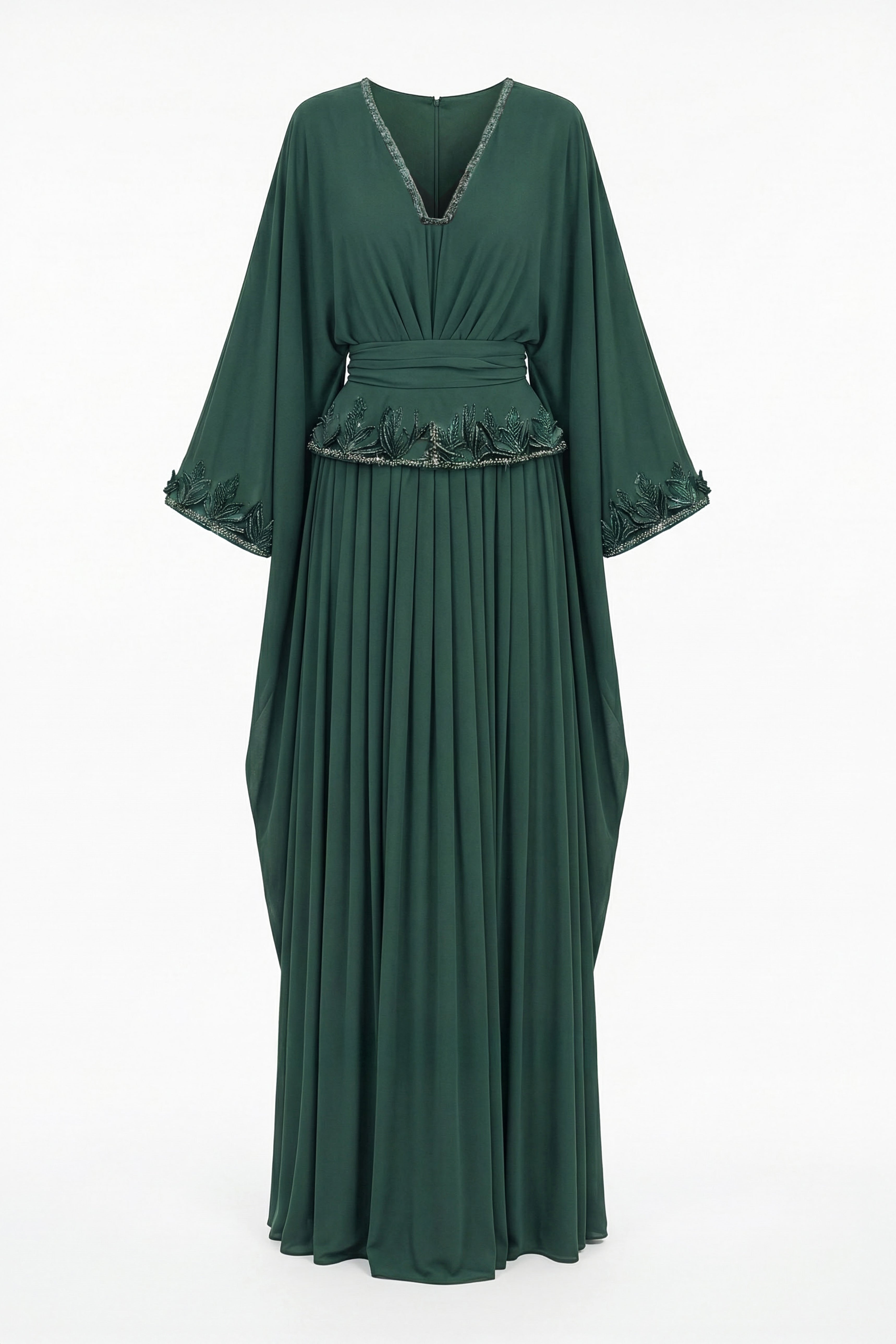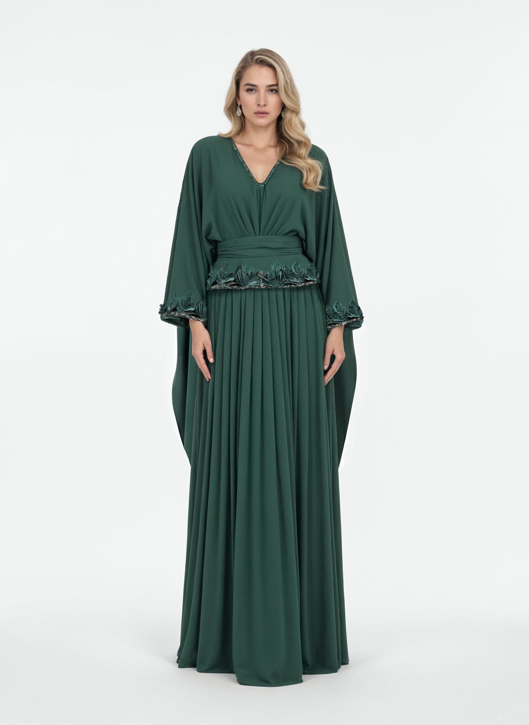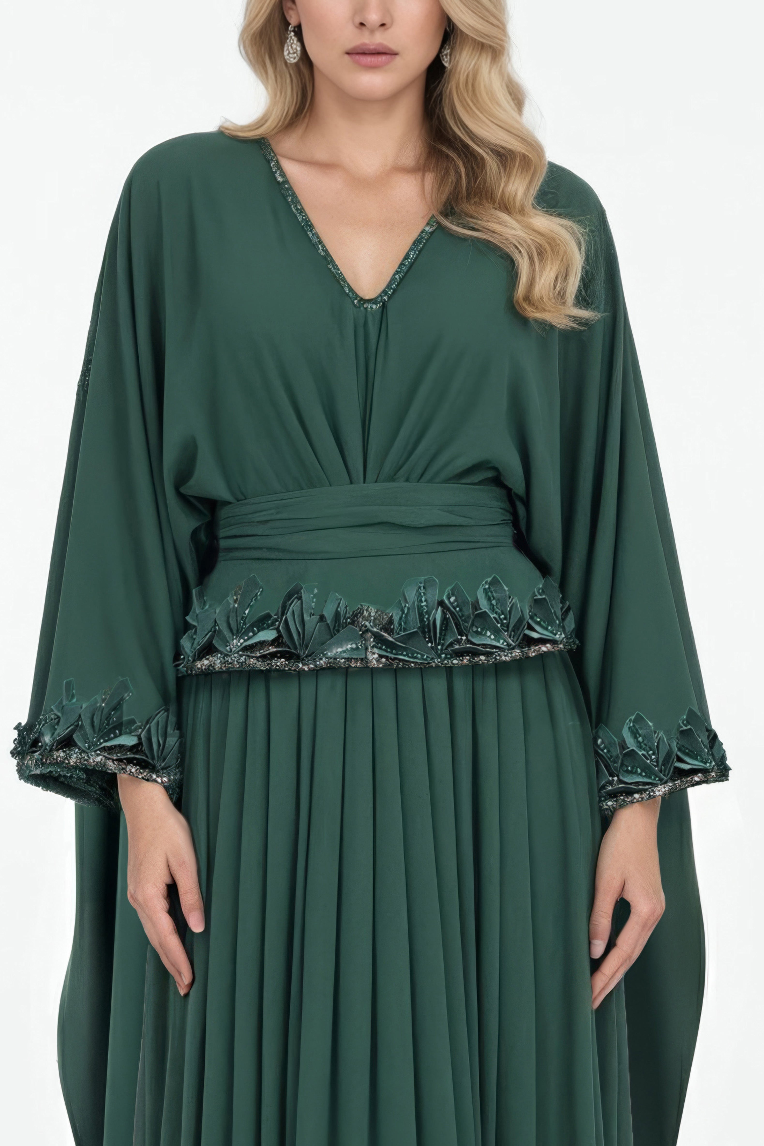 A green crepe abaya featuring batwing sleeves and a pleated, flowy skirt panel. The hemline of the bodice and the hemline of the sleeves are adorned with hand-embroidered 3D detailing, incorporating beads and crystals for added dimension and craftsmanship.