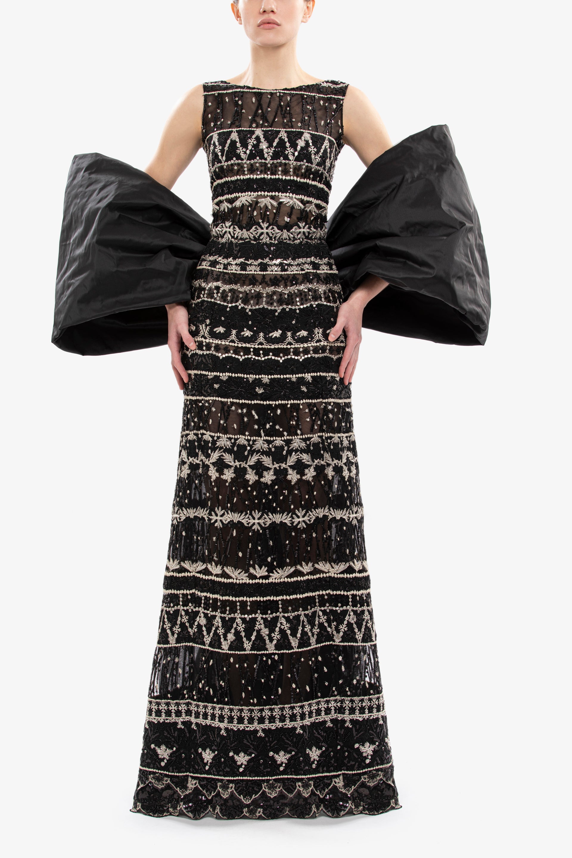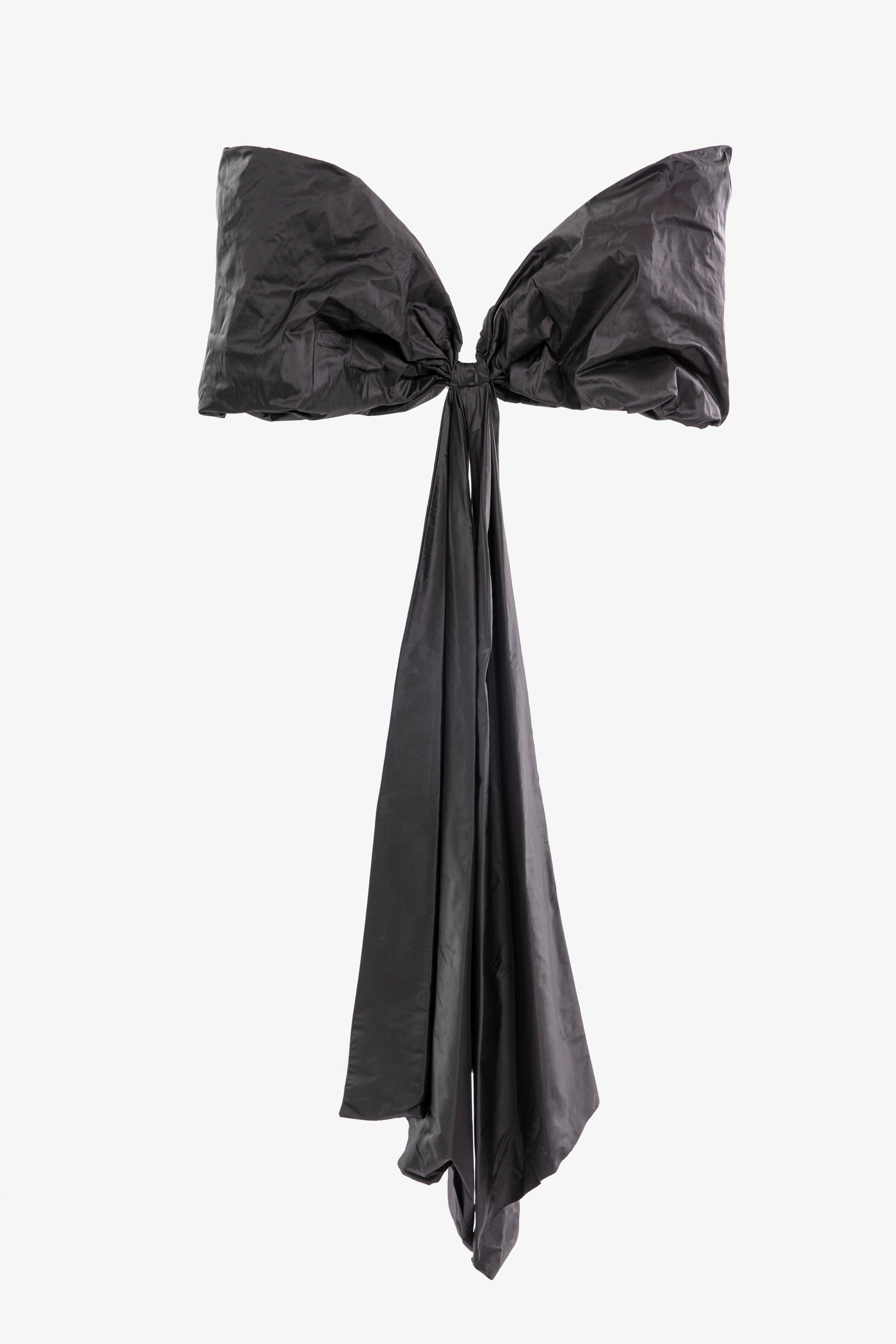 A jet-black taffeta large cape in a dramatic bow shape, adding an elegant and striking element to any outfit