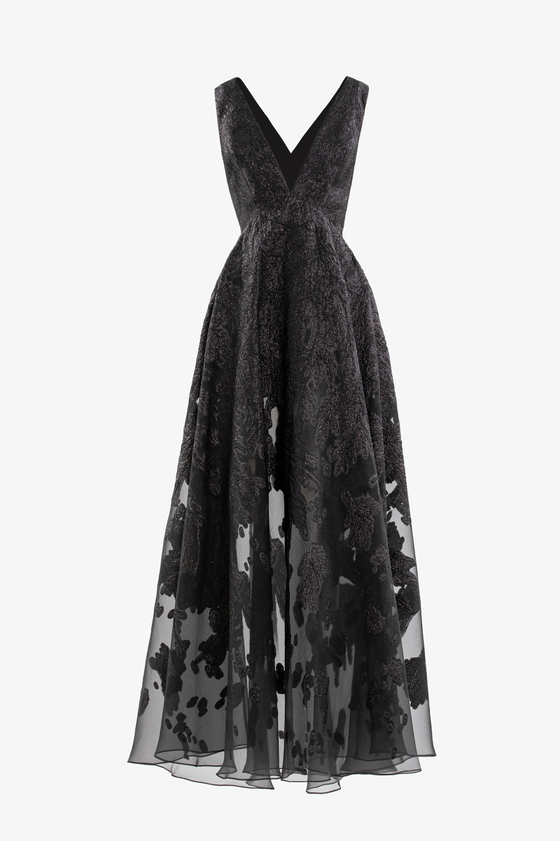 A jet-black, floor-length dress crafted from luxurious brocade fabric, featuring a V-neckline and sleeveless design. The dress is elegantly detailed with pockets and a transparent hemline.