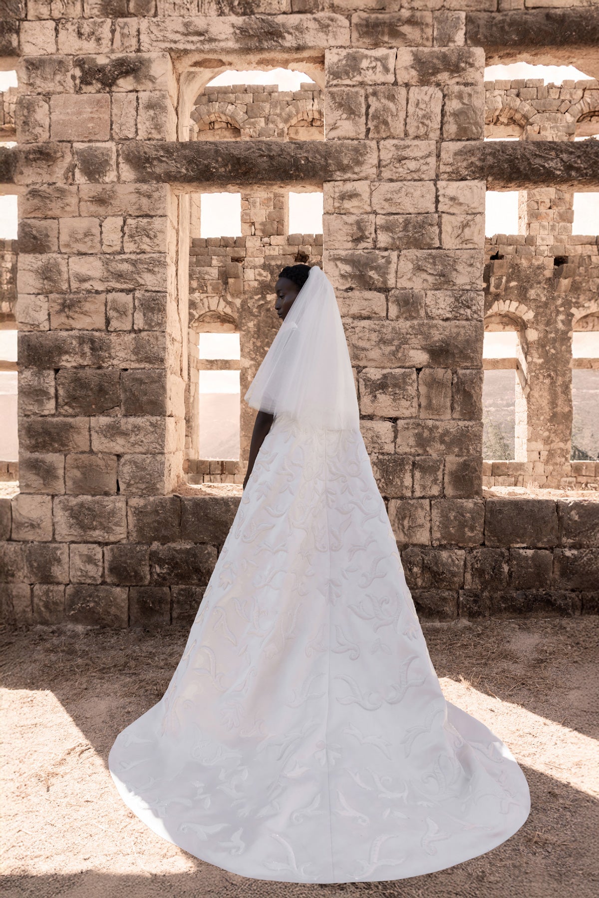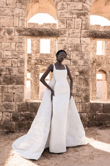 An elegant ivory Mikado dress featuring a structured square neckline and a sleek, fitted silhouette, flowing into a dramatic back train hand embroidered with raised satin organic shaped appliques. The intricate motifs of swirling leaves and flourishes are delicately outlined in tonal off- white threading, adding depth and dimension to the dress.
