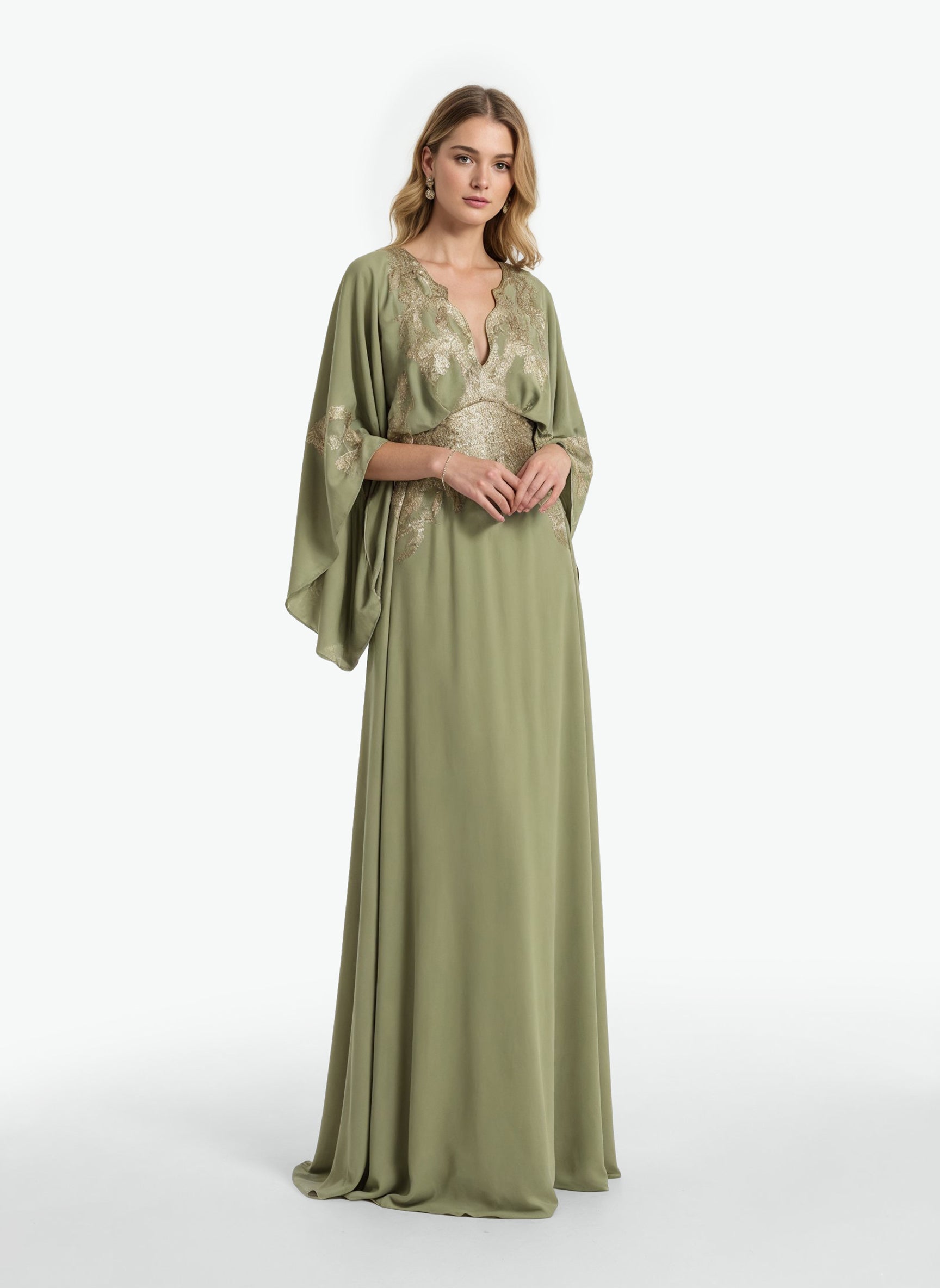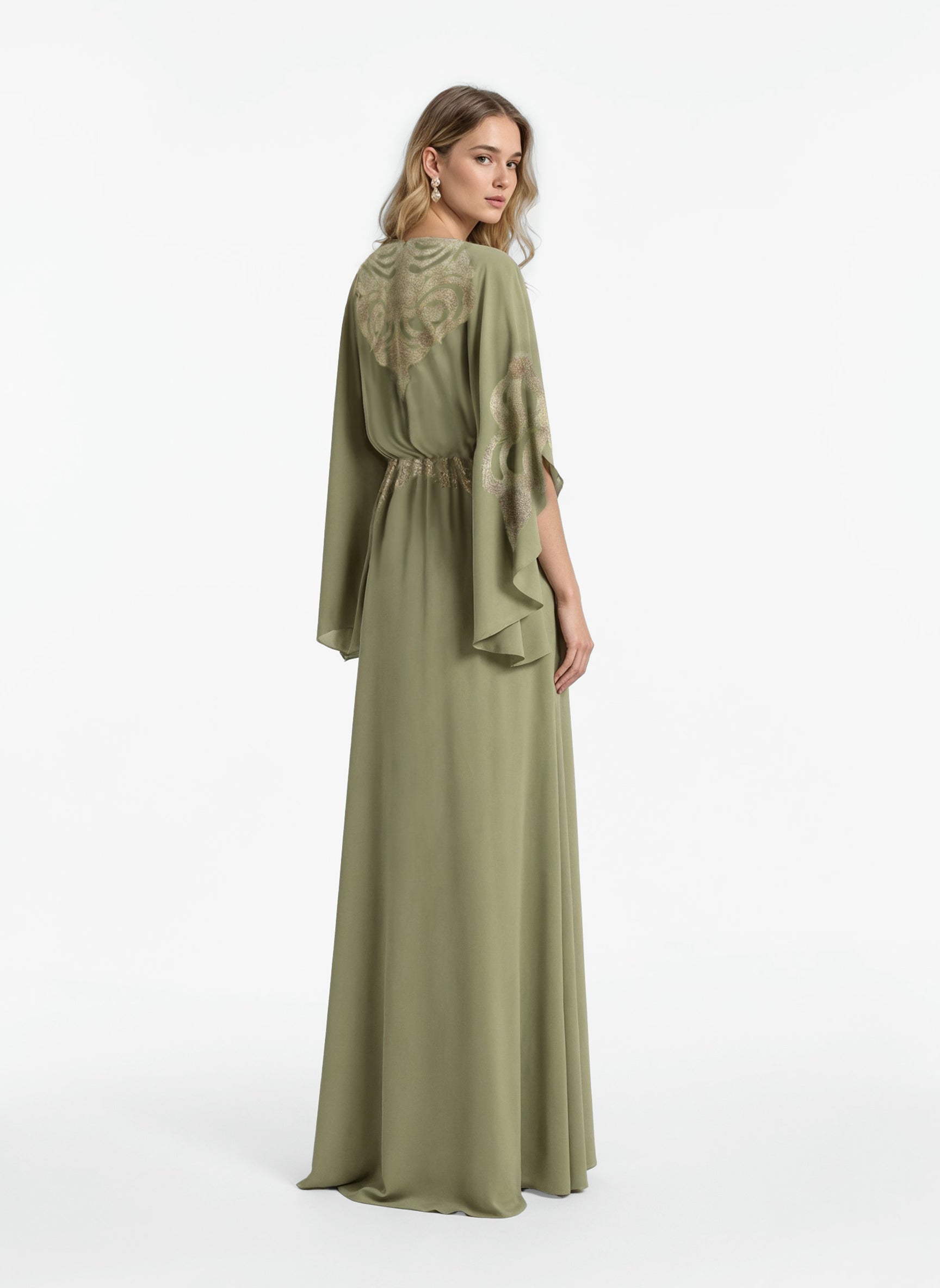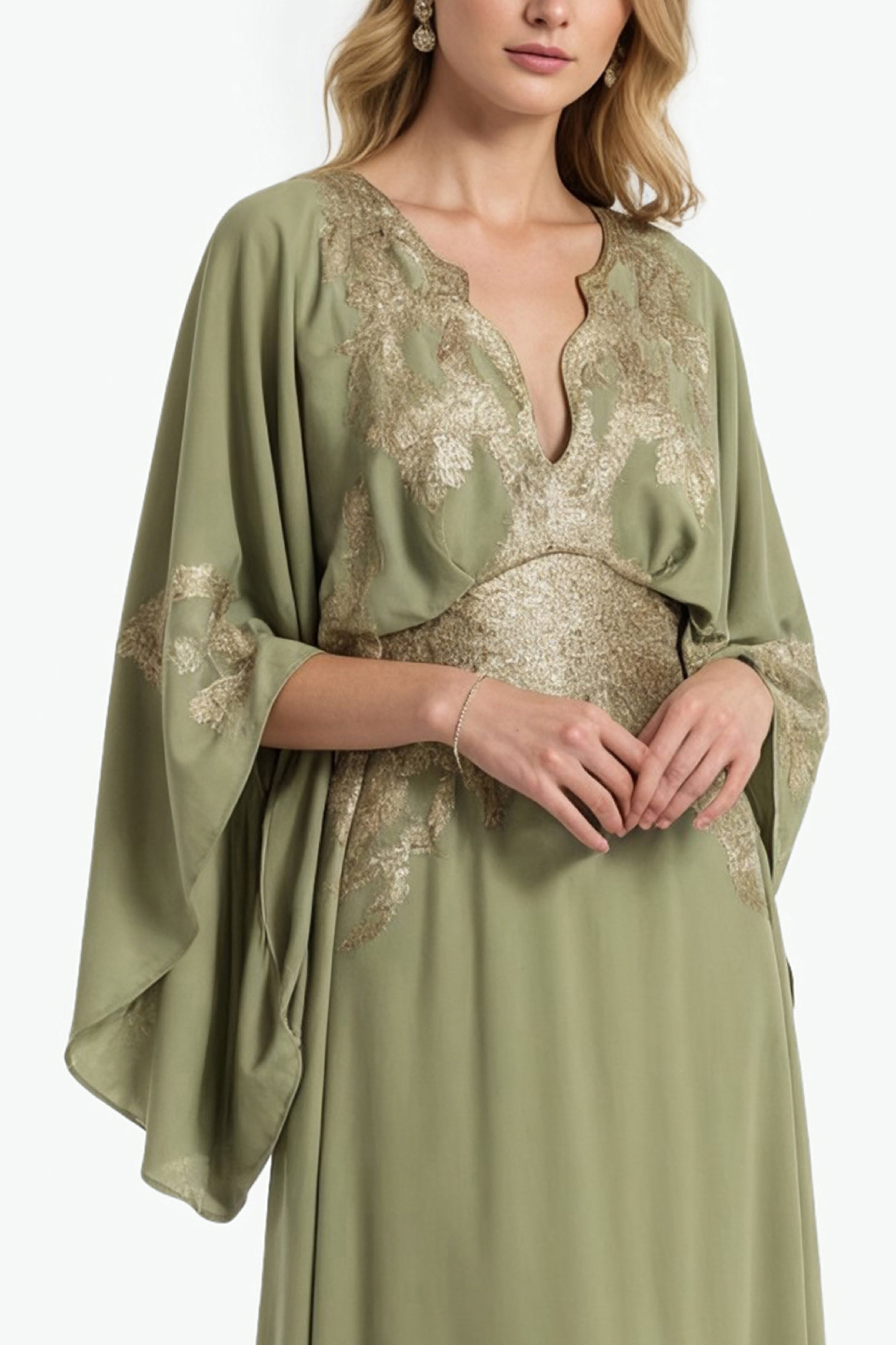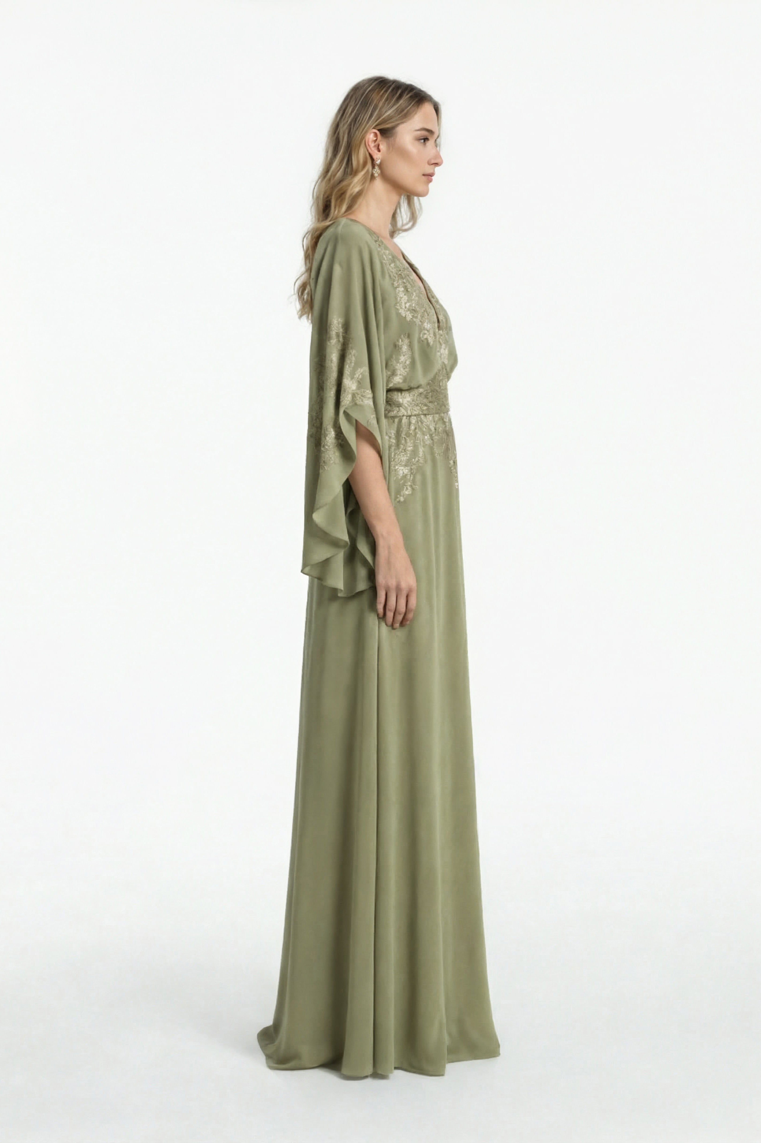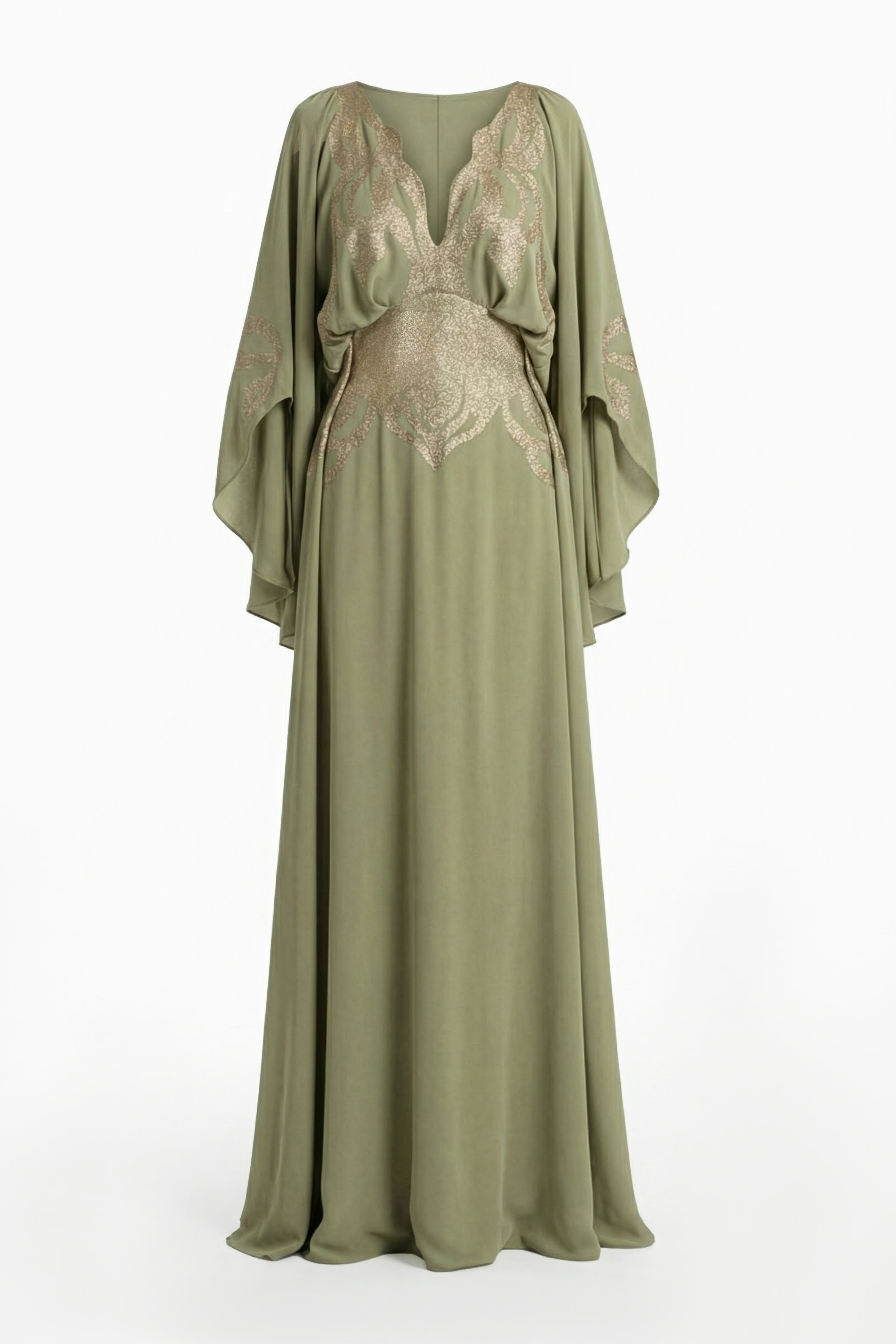 A refined light green crepe abaya featuring delicate handwork crafted with light gold thread. The silhouette is tailored with a fitted waist and low hip, creating a beautifully structured shape. Flared sleeves introduce a graceful flow, while soft pleating under the bust enhances movement and drape. The design is completed with a straight-cut skirt.