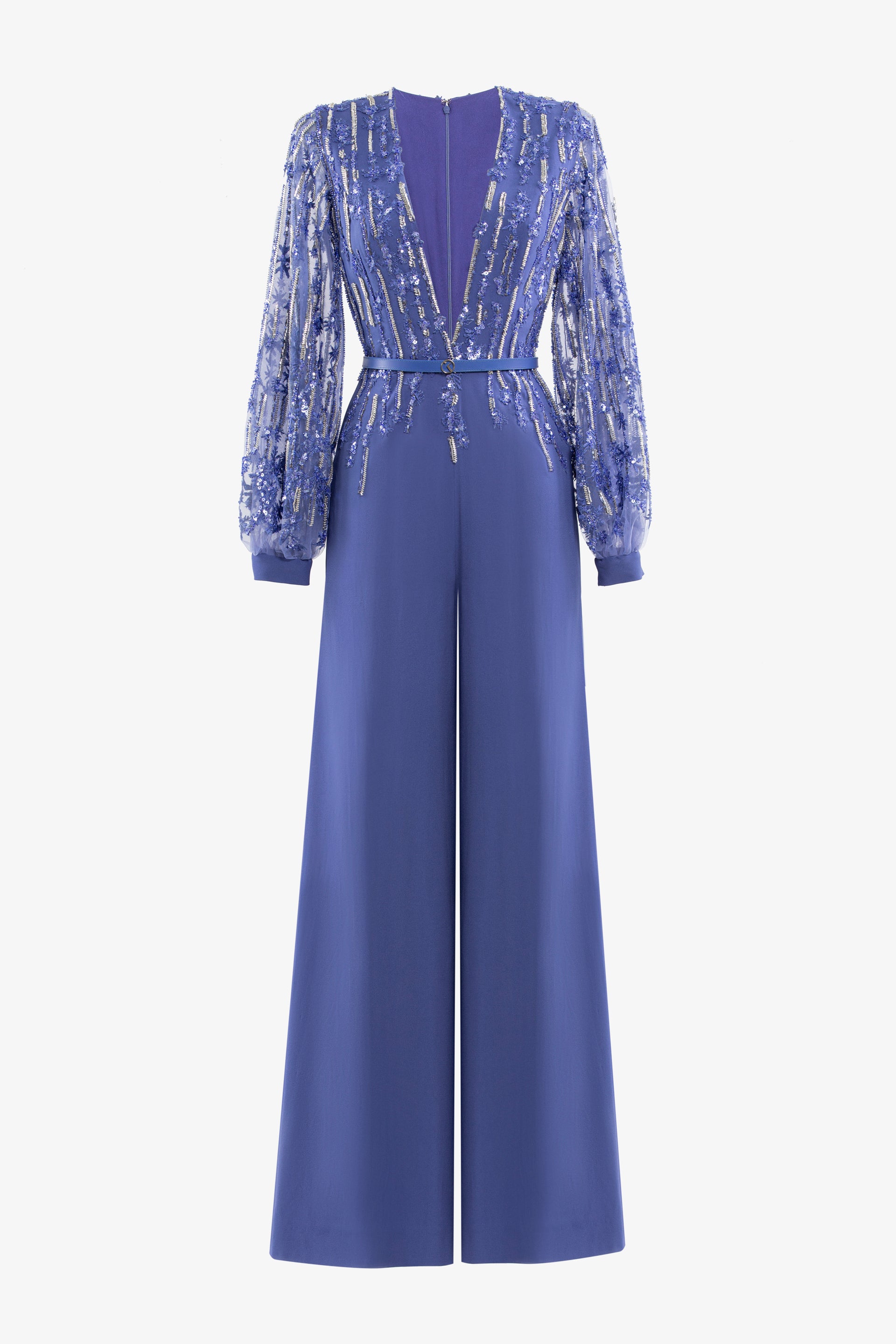 The marlin crepe jumpsuit is adorned with intricate beadwork, flowing seamlessly from the bodice down into the pants. With its long muslin sleeves and deep V neckline, it exudes a glamorous appeal. Paired with marlin 100% leather SK belt.