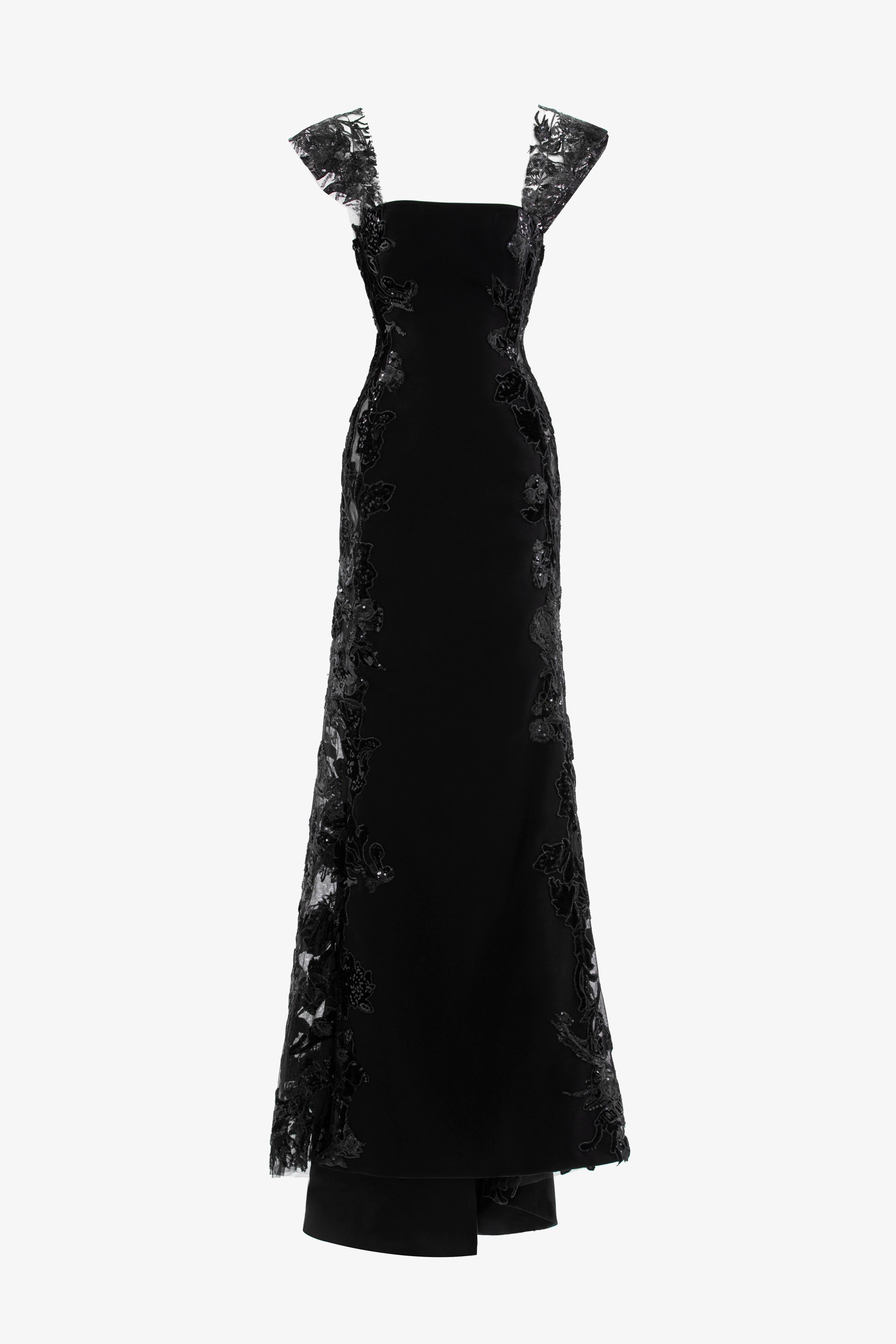 A jet-black long fitted crepe dress featuring intricate velvet design detailing that runs seamlessly along the sides, from the top to the bottom.