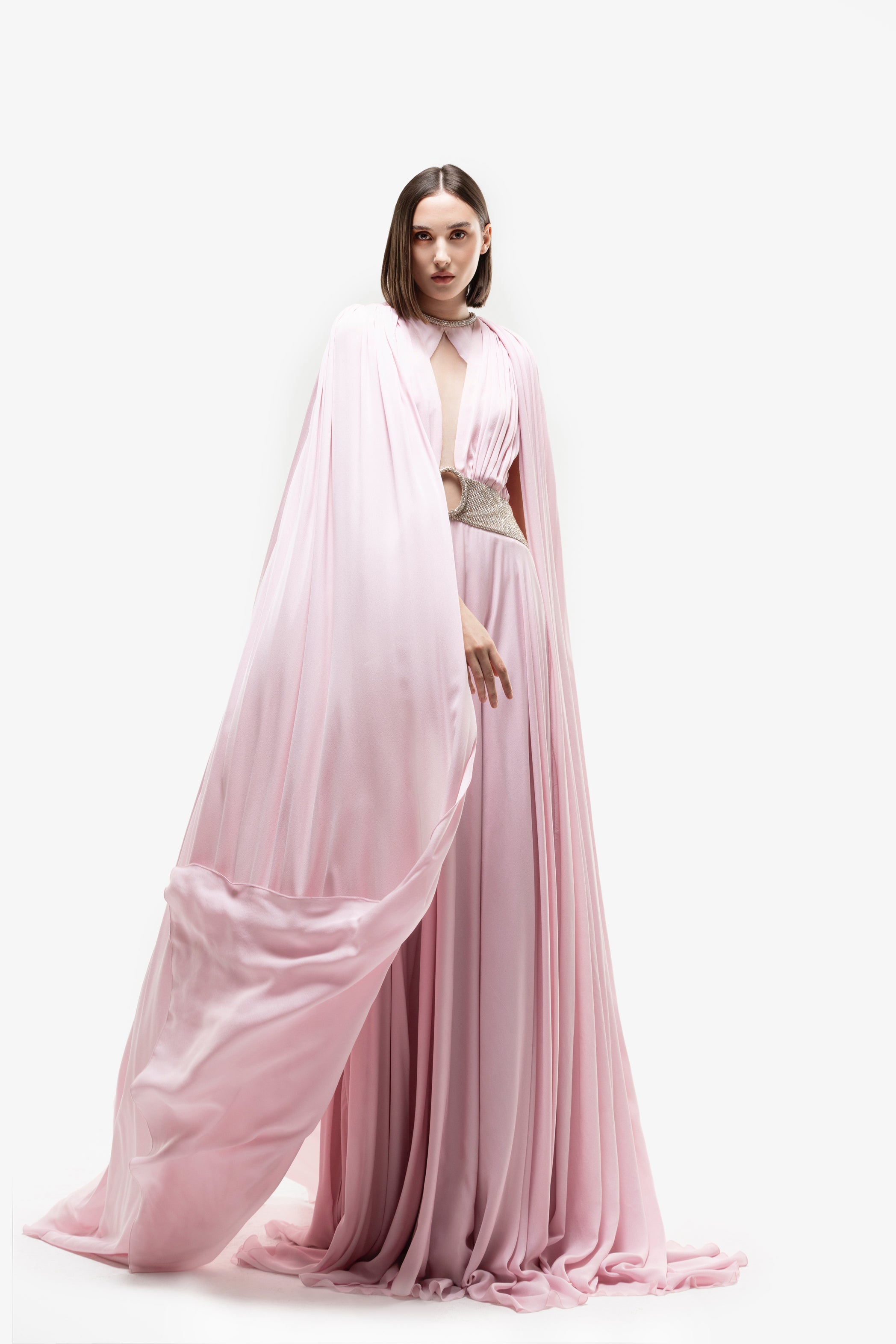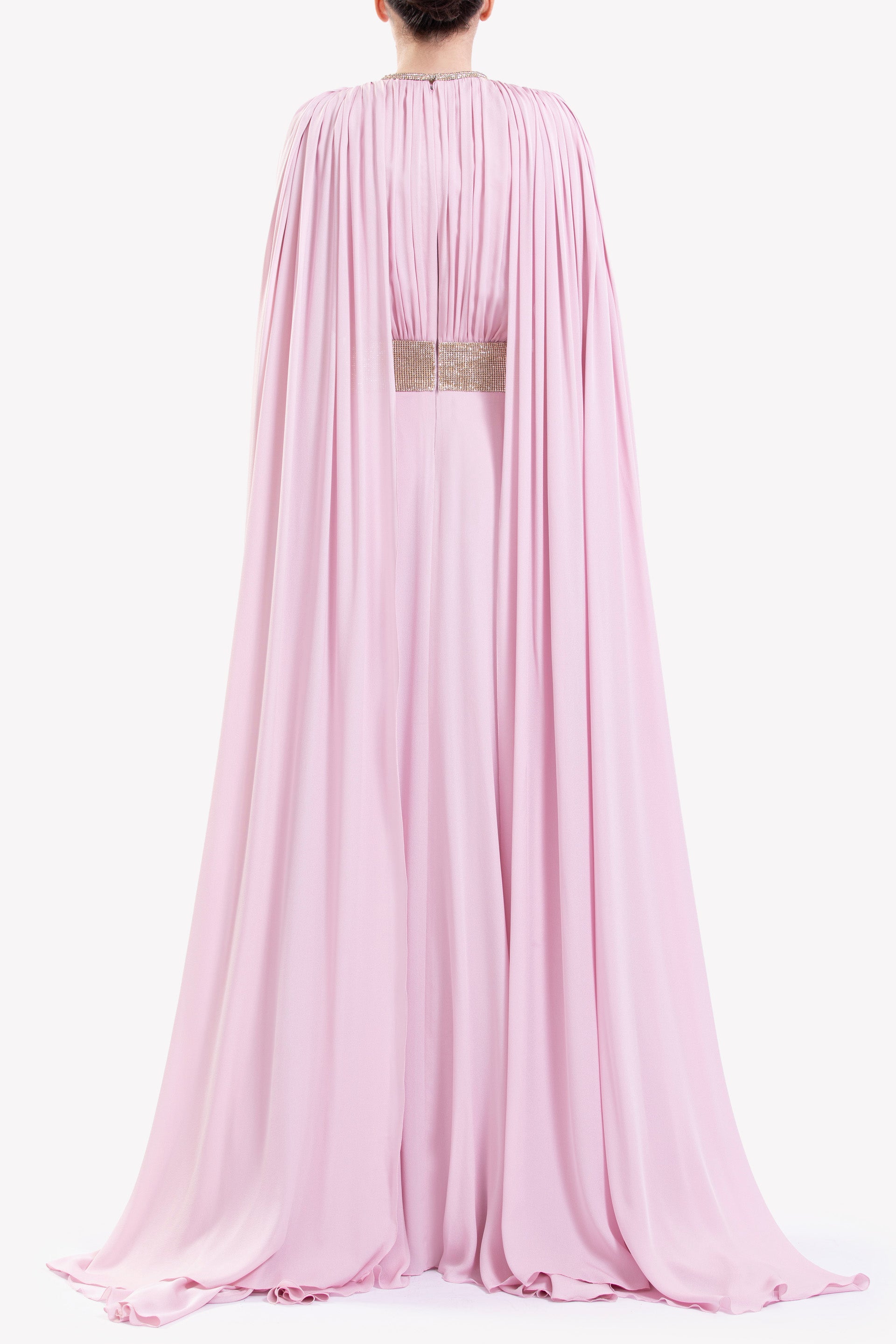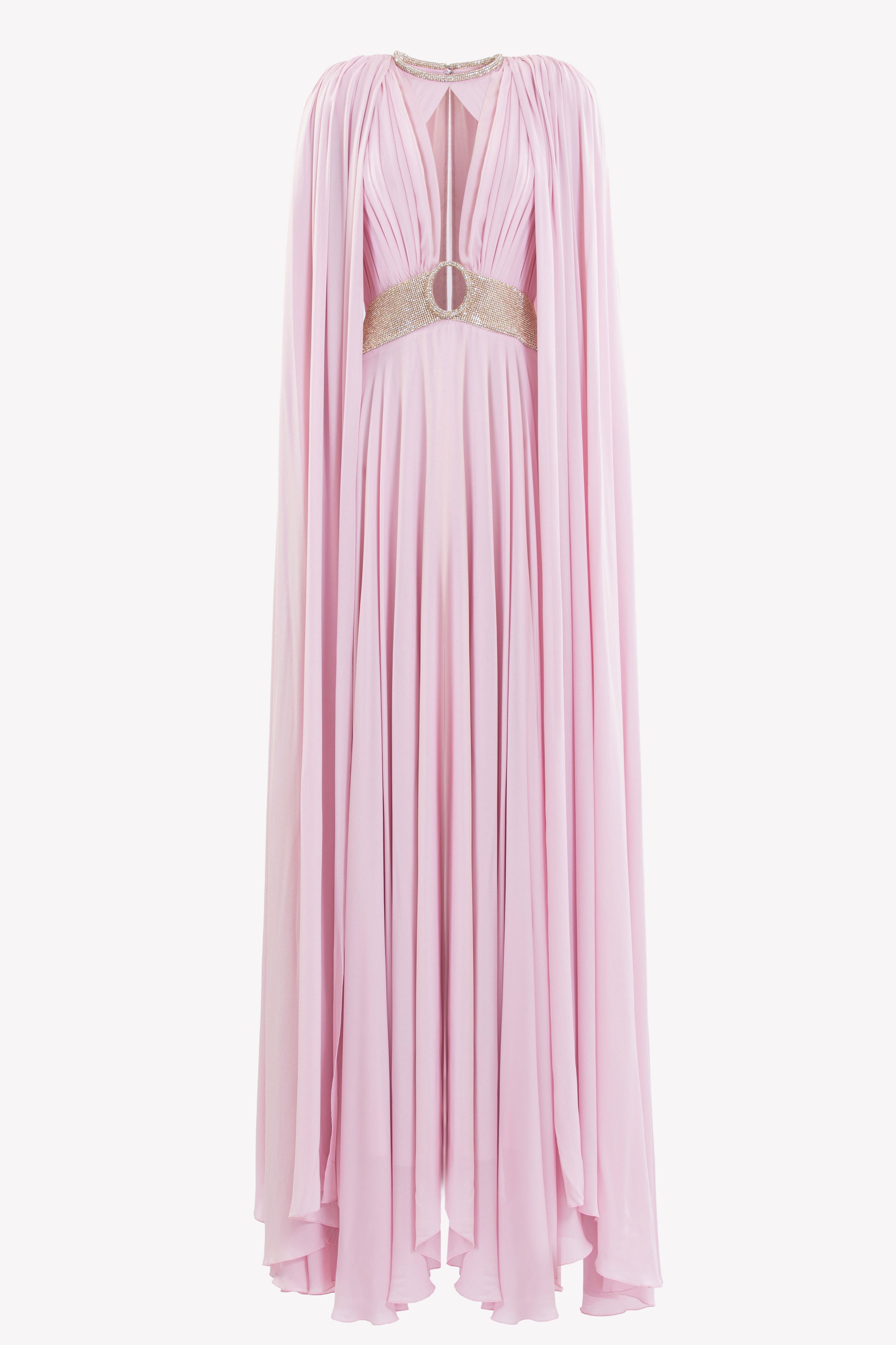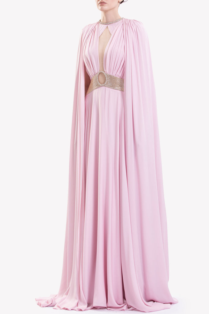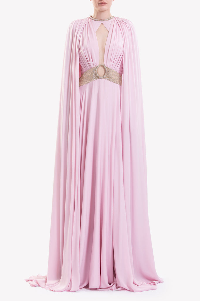 Salsa Rosa crepe georgette dress with an embroidered neckline, draped and pleated accents on the bust, and an embroidered belt with a central oval cut-out. Features an attached cape that flows from the shoulders. Flows into a floor-length skirt.