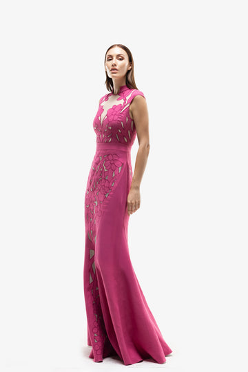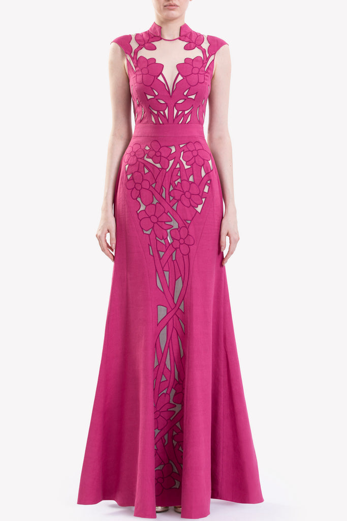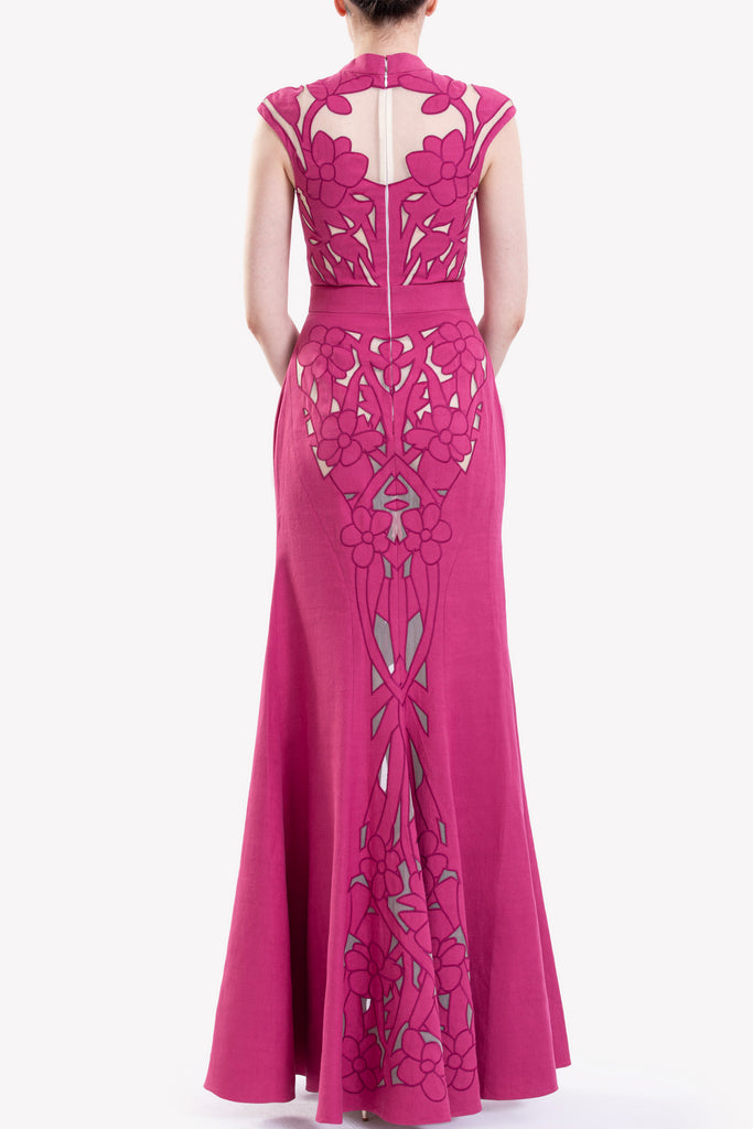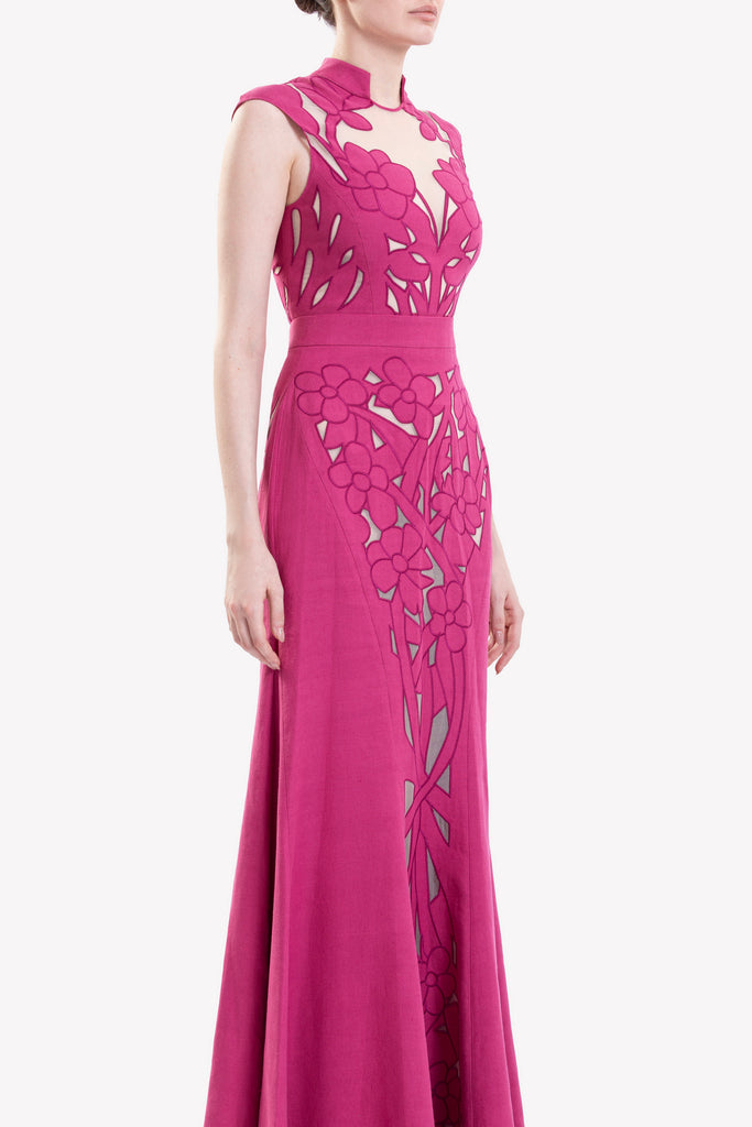 A Cactus Flower colored linen dress with a fitted mermaid silhouette and cap sleeves, featuring bold floral embroidered cutouts on the bodice and skirt that create striking patterns with sheer detailing. Floor-length design flows into a subtle flare.