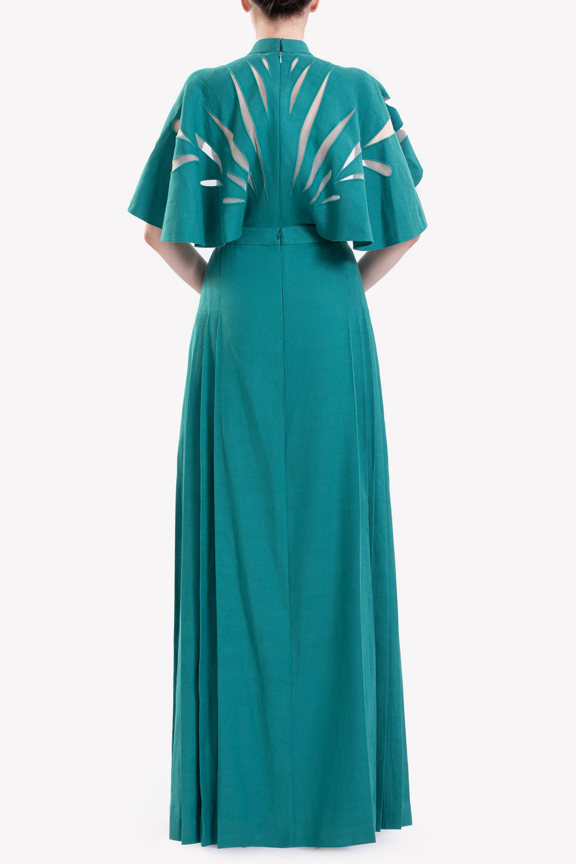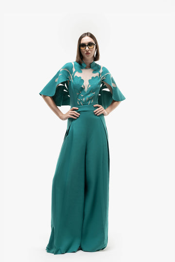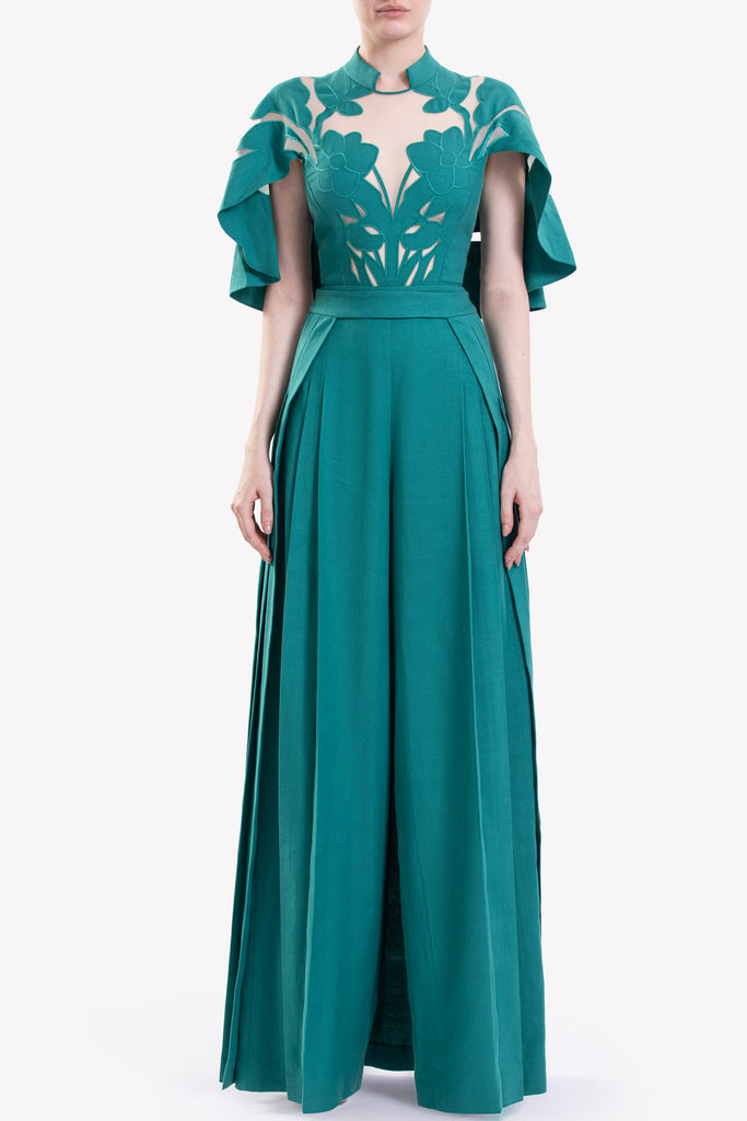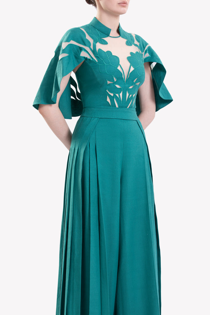 North Sea linen jumpsuit with a high neckline and wide-leg pleated trousers. Bodice features bold embroidered cut-out floral motifs extending into short cape- like sleeves, cinched at the waist. Finished with a matching north sea overskirt.