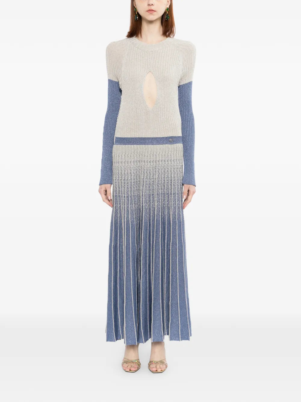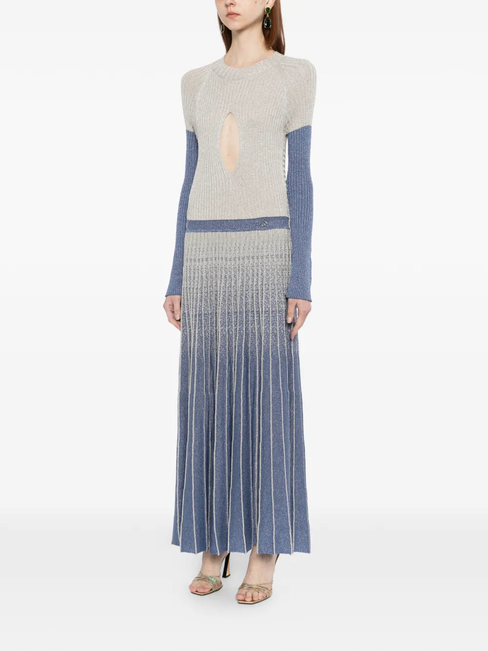 An off-white and Italian plum knitwear dress with a stunning degrade effect, transitioning from off-white to Italian plum. This midi-length dress features long sleeves, a low waist, and a subtle opening at the middle bust, finished with an elegant SK logo on the waist.
