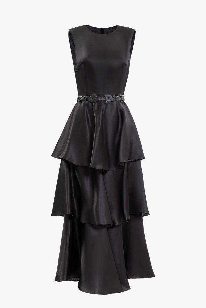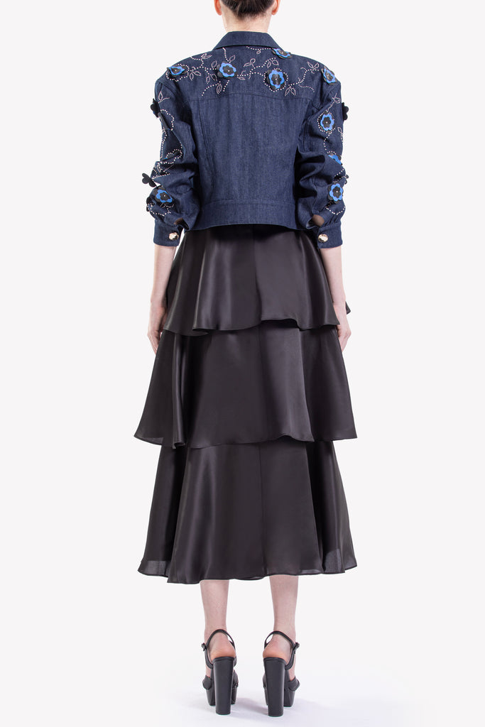 Cropped dark denim jacket detailed with SK silver buttons, embellished with embroidered floral accents in shades of blue and black paired with a Jet-black silk tiered ruffle midi dress with a rounded neckline and sleeveless design.