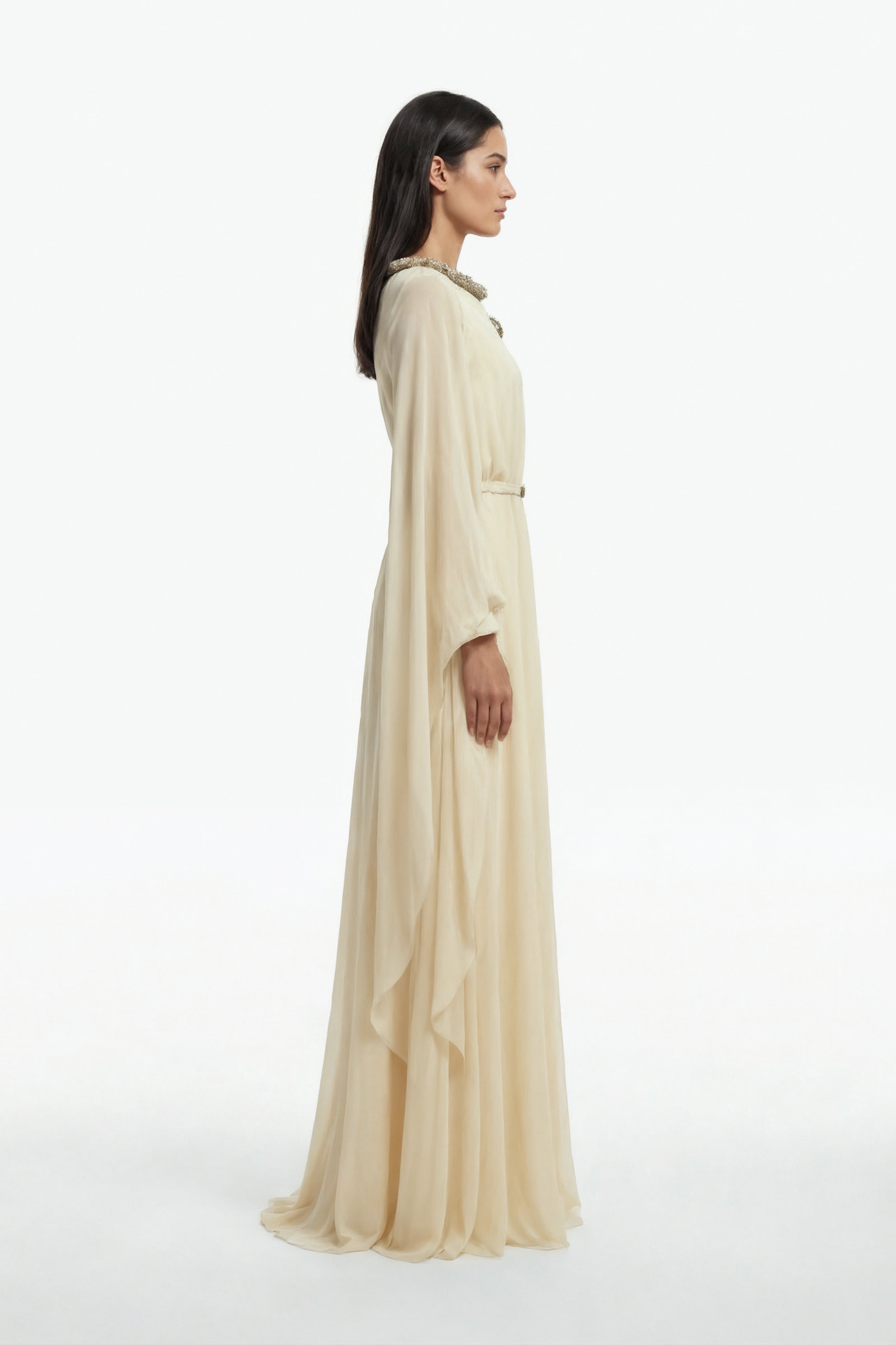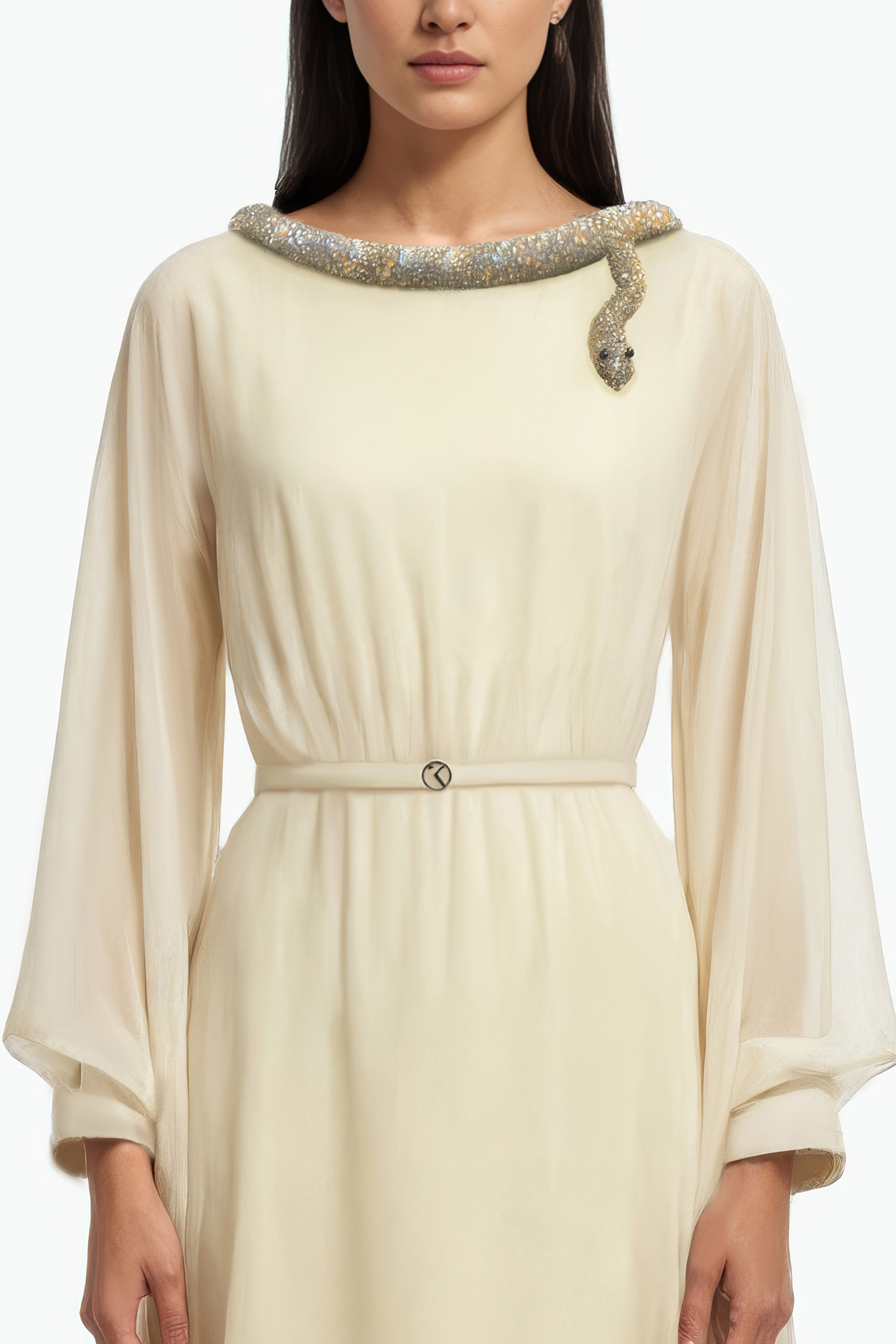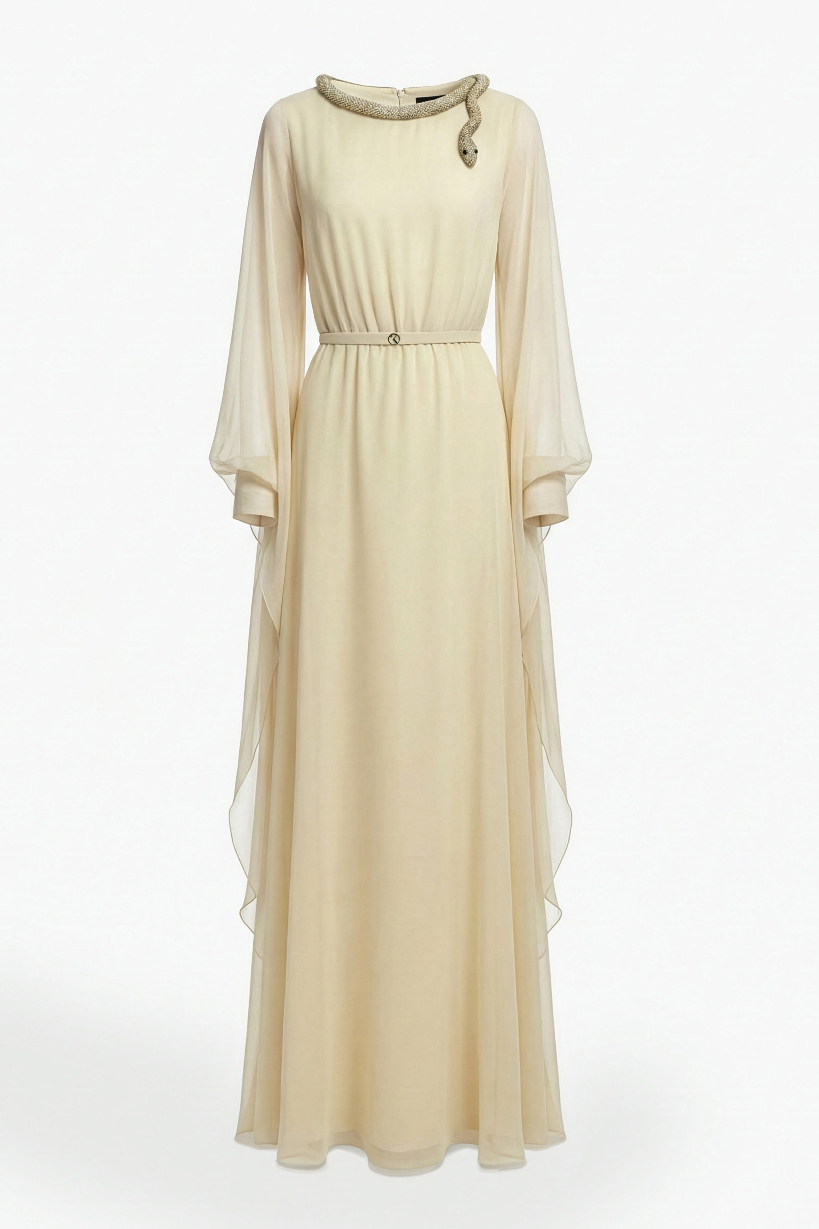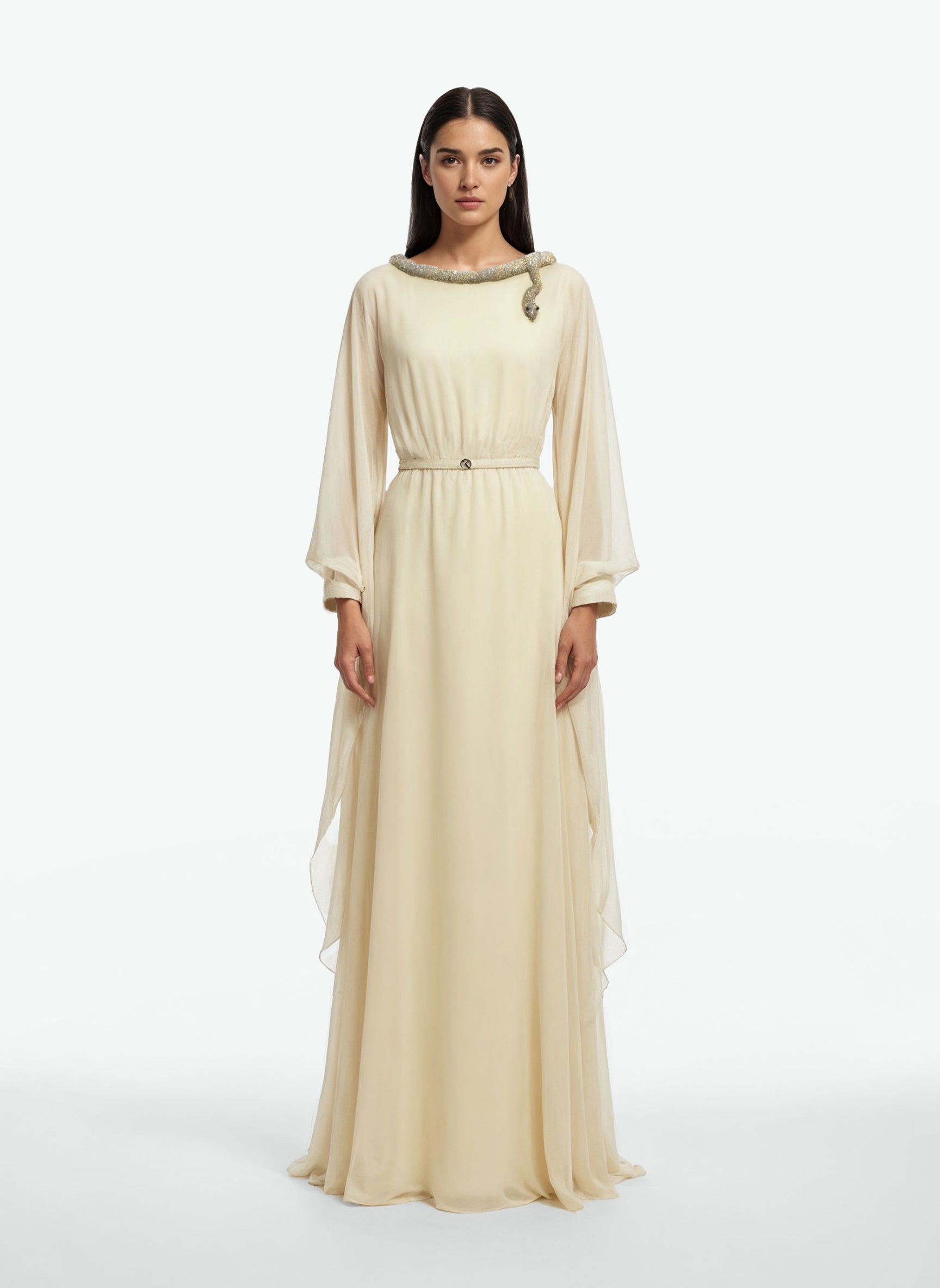A soft yellow dress featuring a boat neckline, flowing cape sleeves, and a floor-length silhouette with a gentle train. The waist is defined with a matching SK logo slim belt, while a striking embroidered snake coils around the neckline, crafted in metallic silver, gold and crystal beadwork for a bold, sculptural accent.