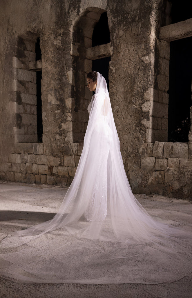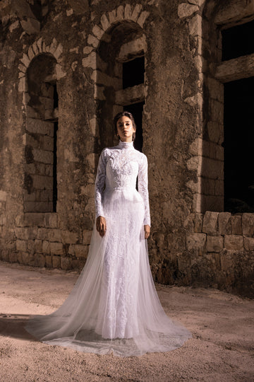 An elegant off-white fitted gown with a soft straight silhouette and tulle overlay. Featuring a high illusion neckline, long sleeves, open lace-framed back. Intricately embroidered lace with subtle beading and sequins adds a refined sparkle, finished with fabric-covered buttons in the back. Paired with a 3.25 meters plain tulle veil.