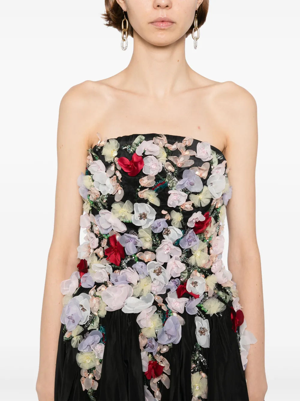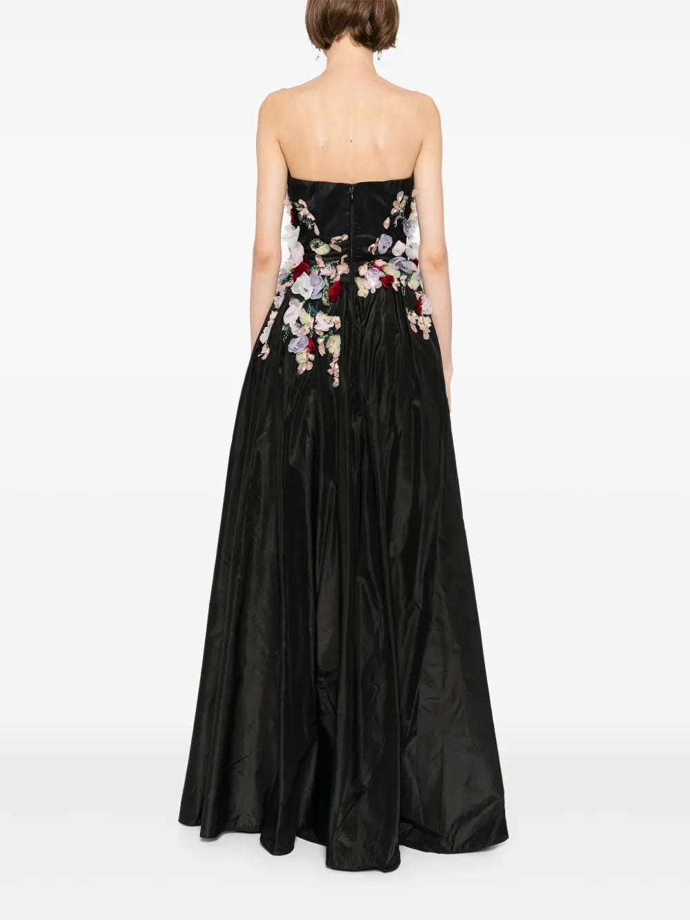 Jet black taffeta gown is embellished at the top with 3D organza flowers in various colors and shapes, which gradually diminish into the skirt. The dress also features convenient pockets