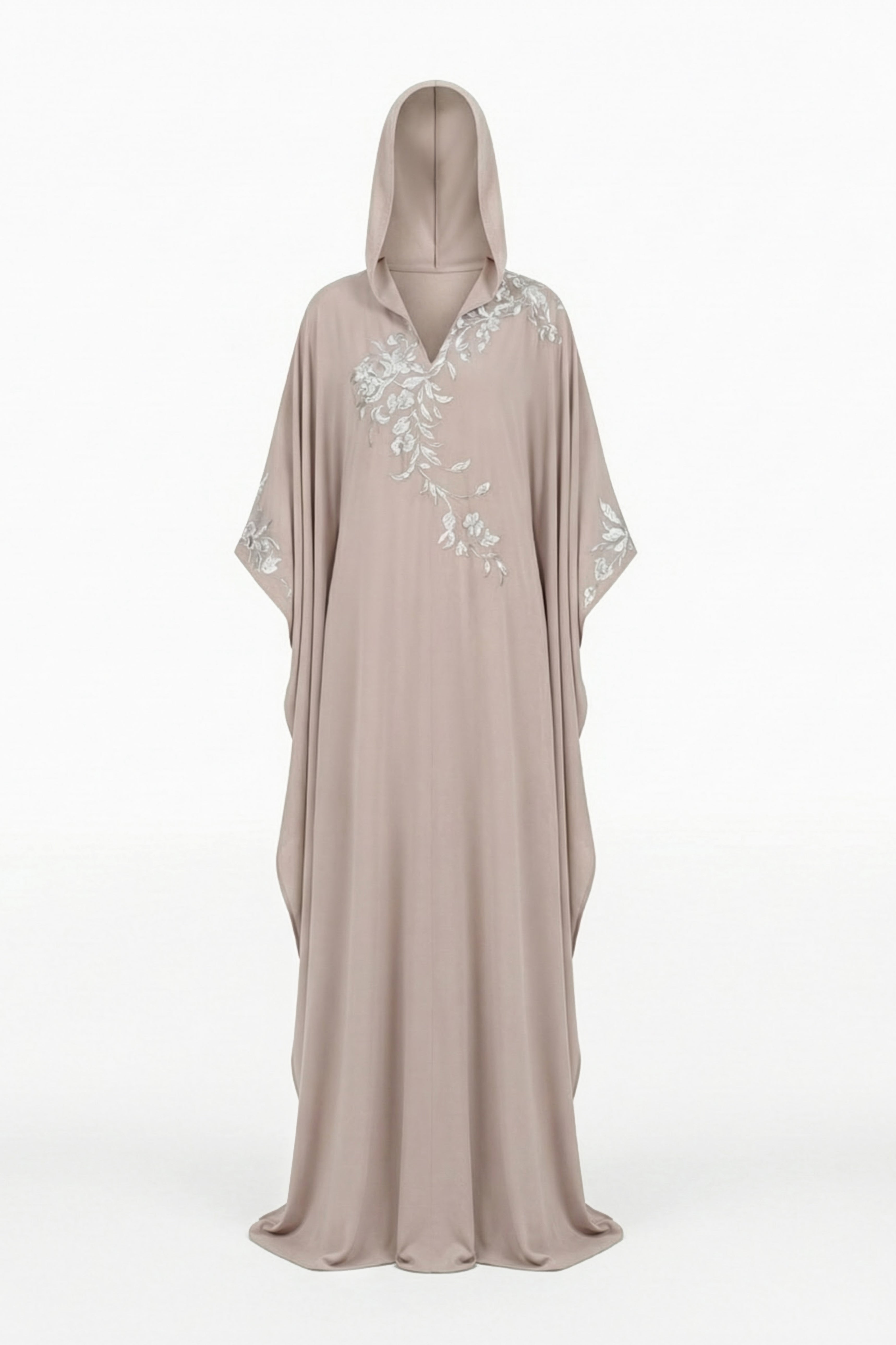 A beige rose crepe flowy abaya featuring a hood. The bodice and sleeves are adorned with intricate hand-embroidered patterns in ivory silk thread and sequins, adding detailed craftsmanship to the design.