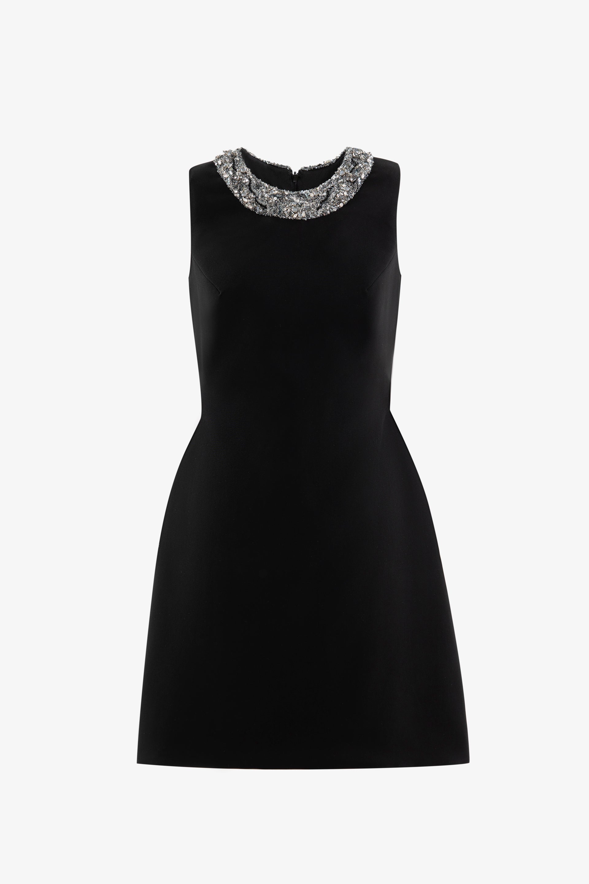 A mini jet-black crepe dress with an embellished neckline, intricately embroidered with sequins, pearls, and beads in silver and anthracite.