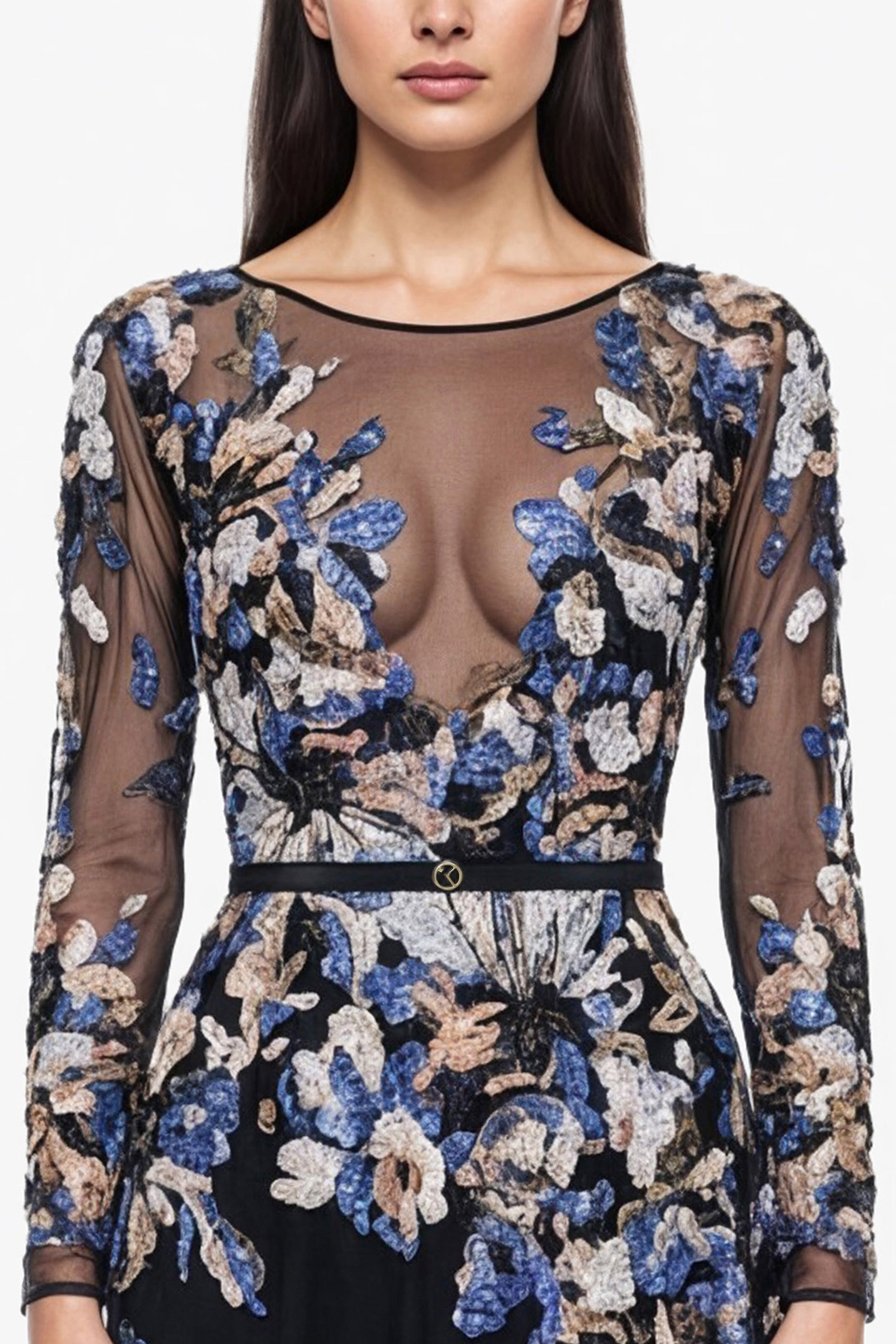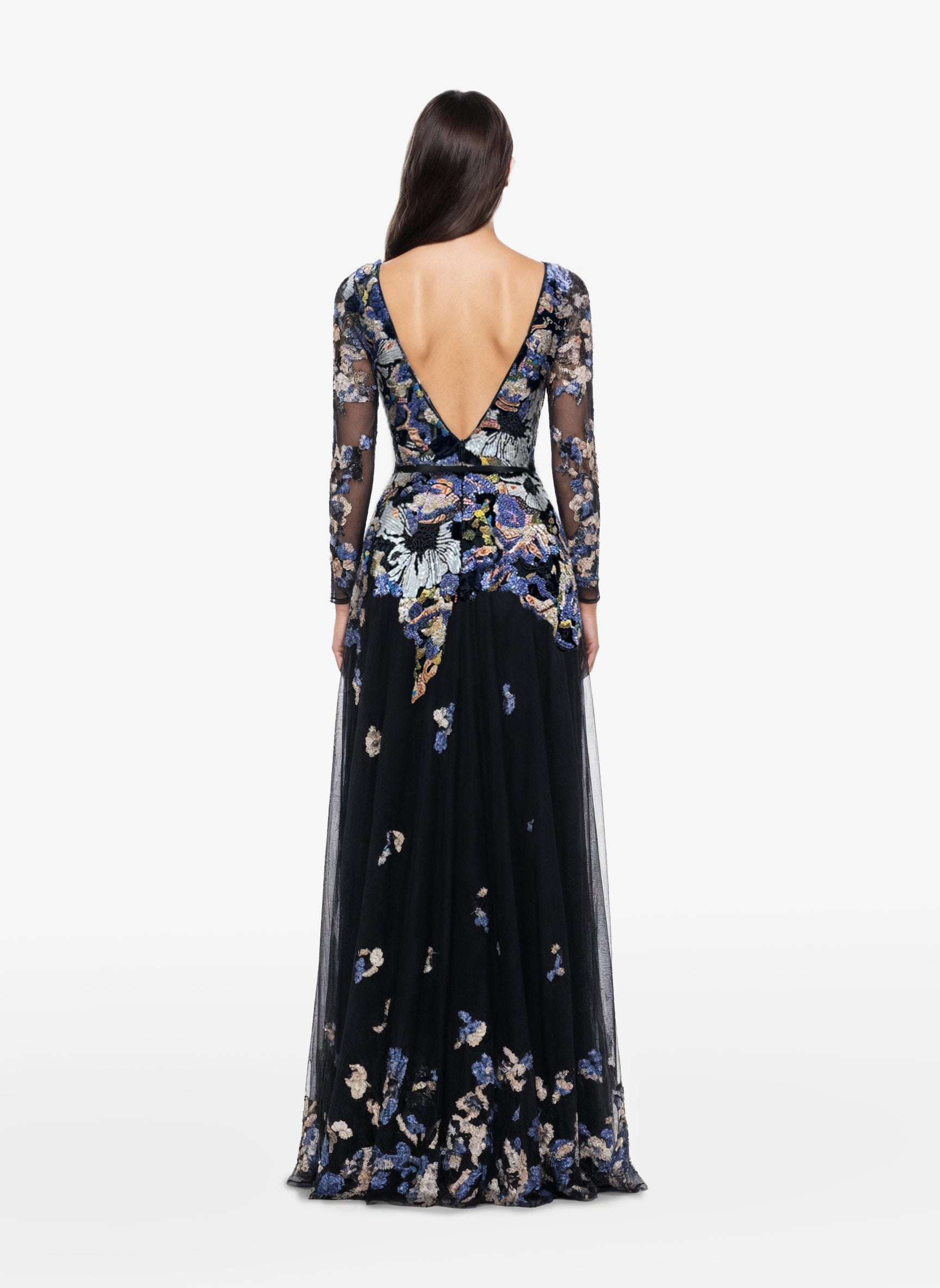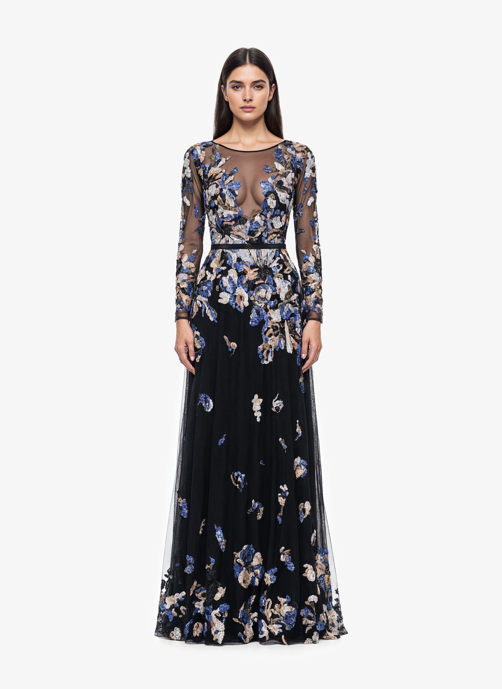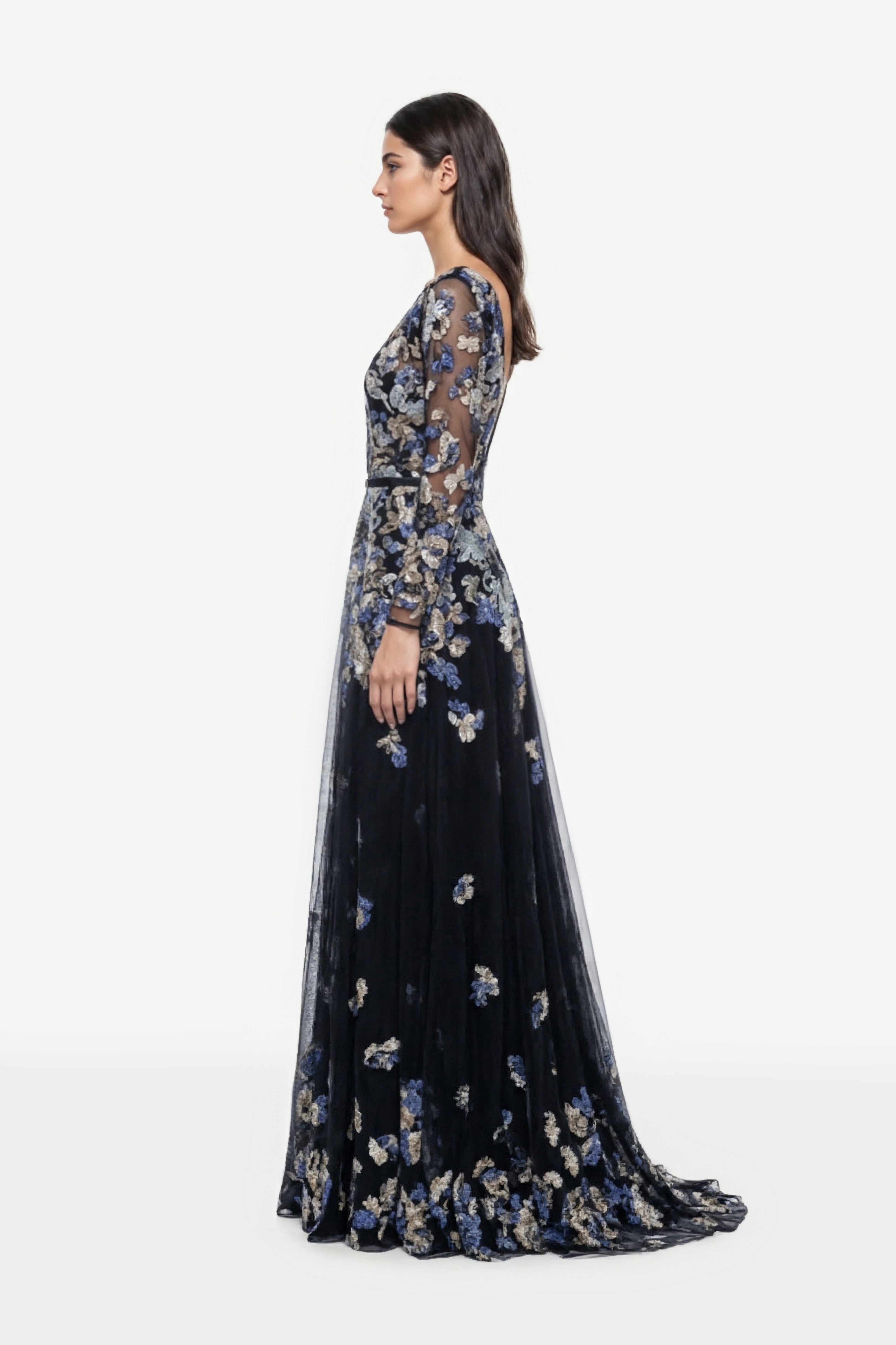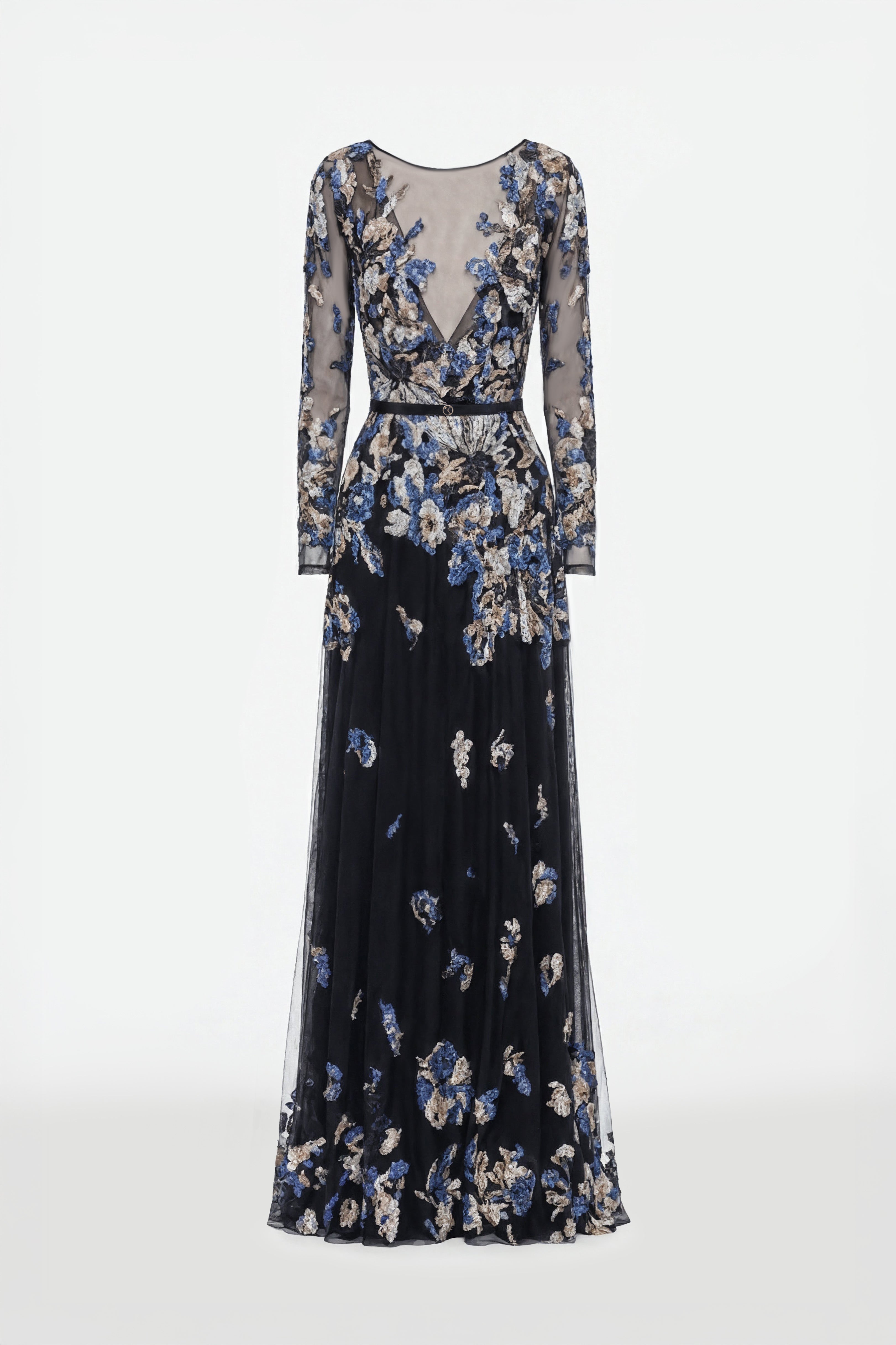 An embroidered tulle gown featuring a graceful boat neckline, long sleeves, and a flowing A-line skirt. The bodice is richly embellished with a mix of materials, beads, and multicolored sequins, creating an intricate and dynamic texture. The design is completed with delicate hand-embroidery along the hemline and the sleeves, adding an elegant artisanal finish.