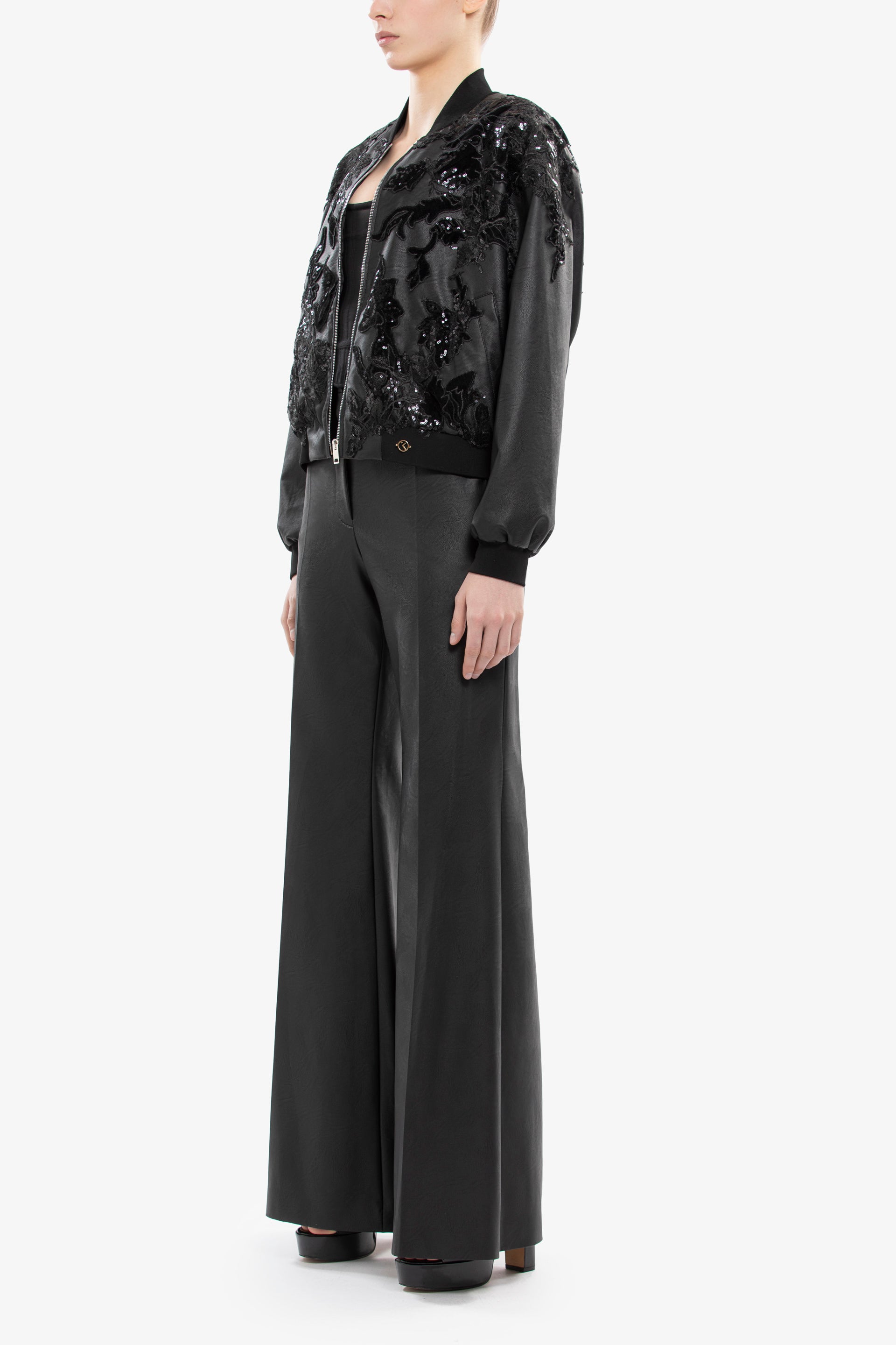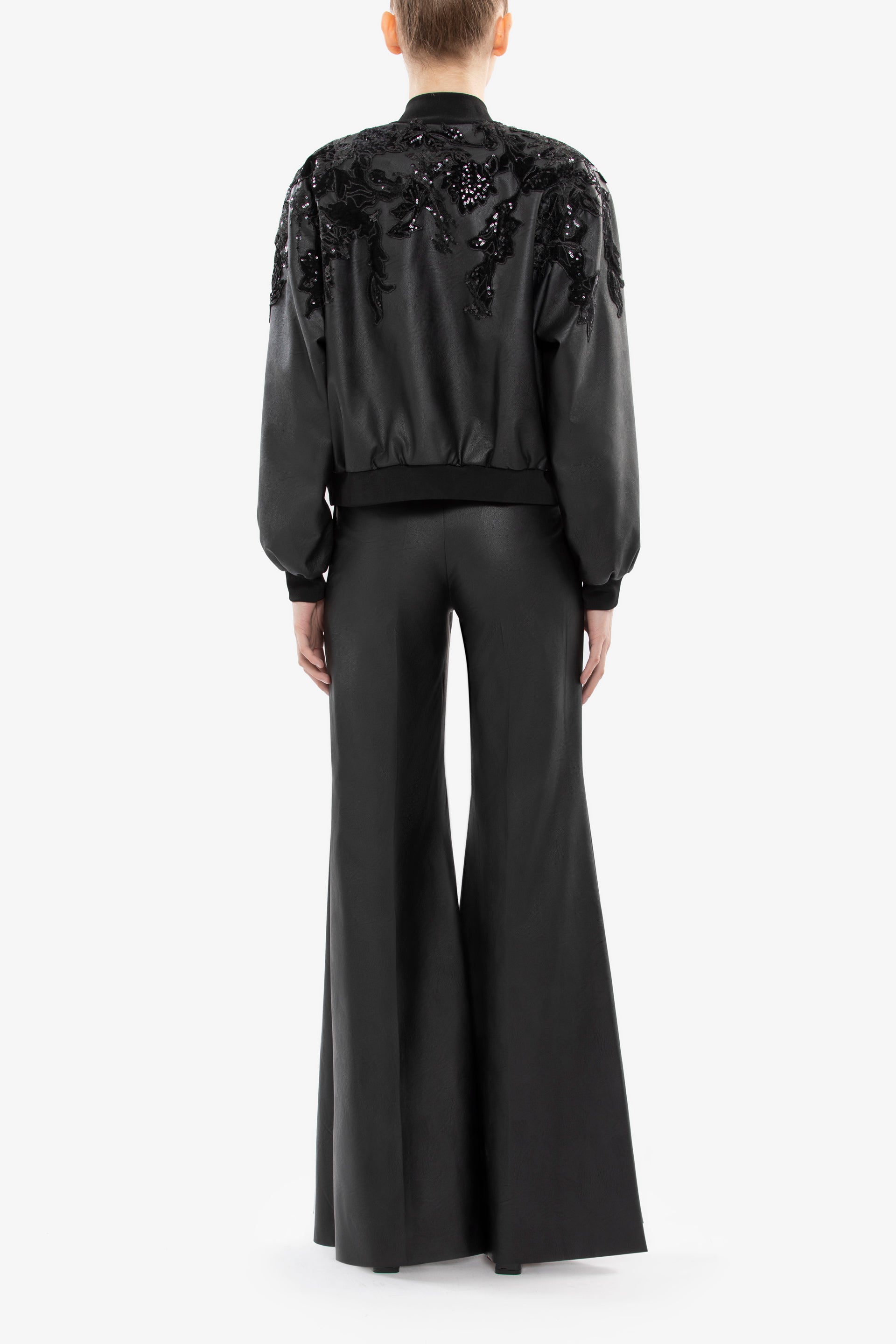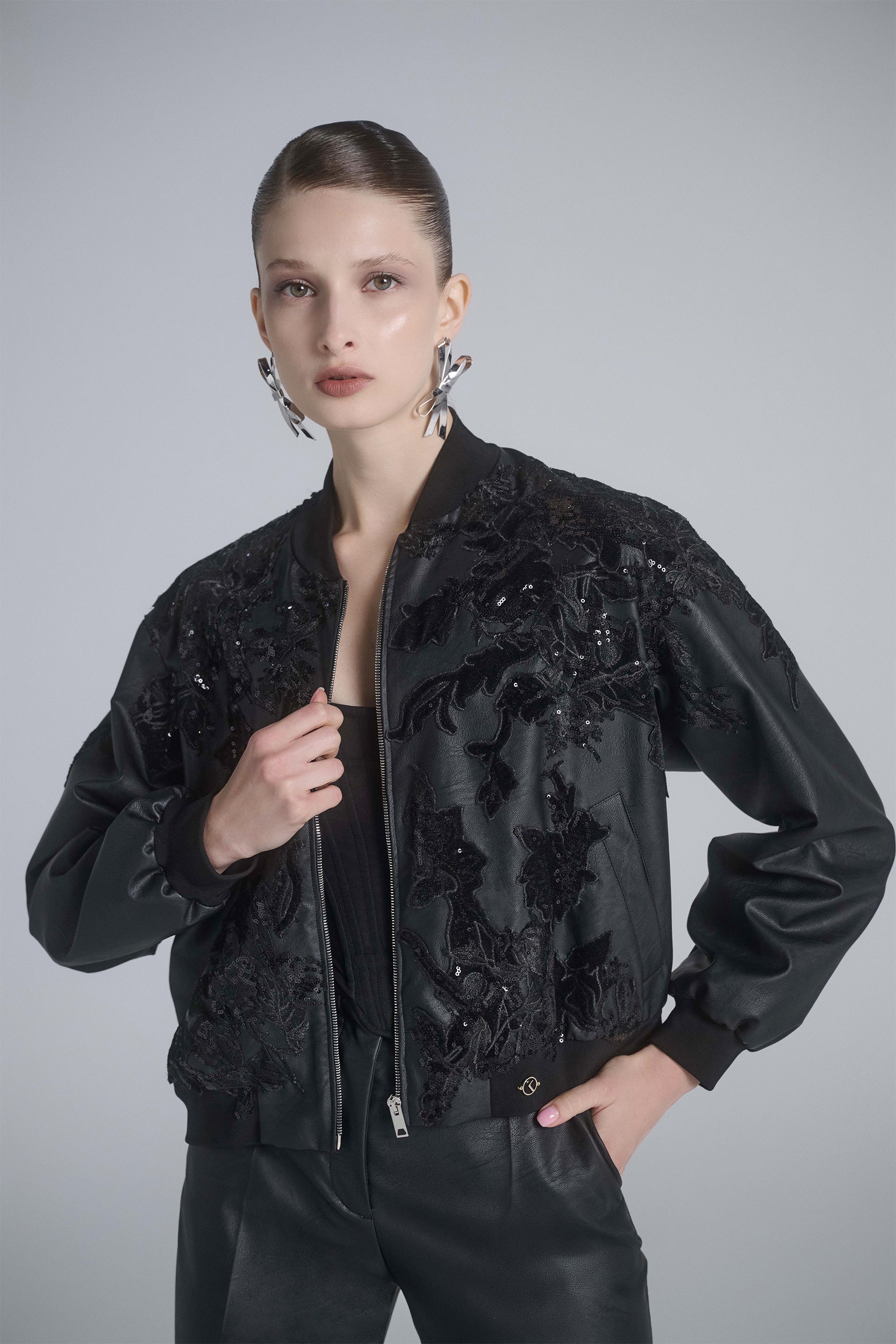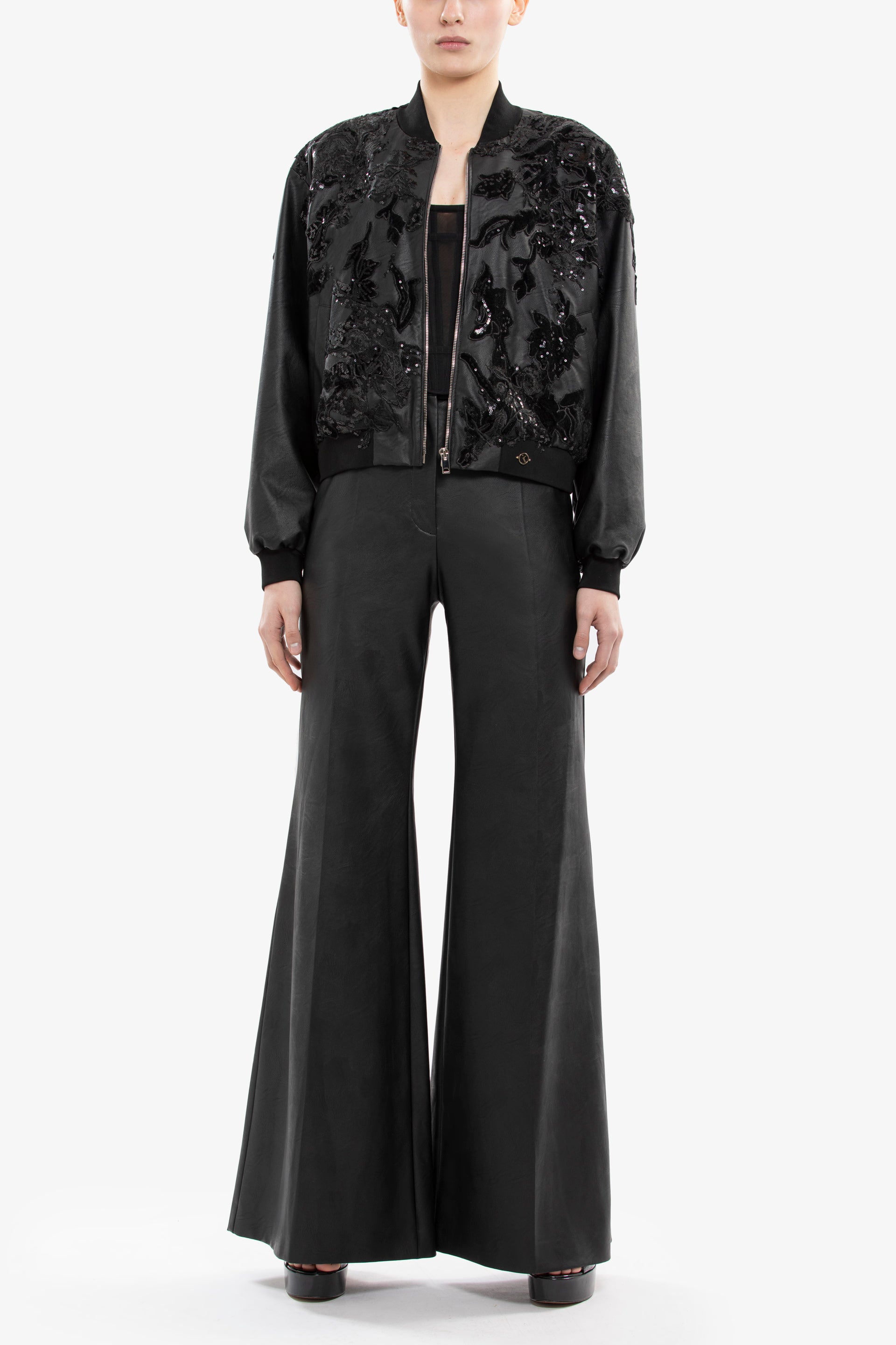 A jet-black embroidered bomber jacket featuring an intricate velvet pattern that extends seamlessly across the entire jacket, including the back. Adorned with light gold SK logo with A jet-black tulle marquise corset and jet black leather pants featuring pockets.