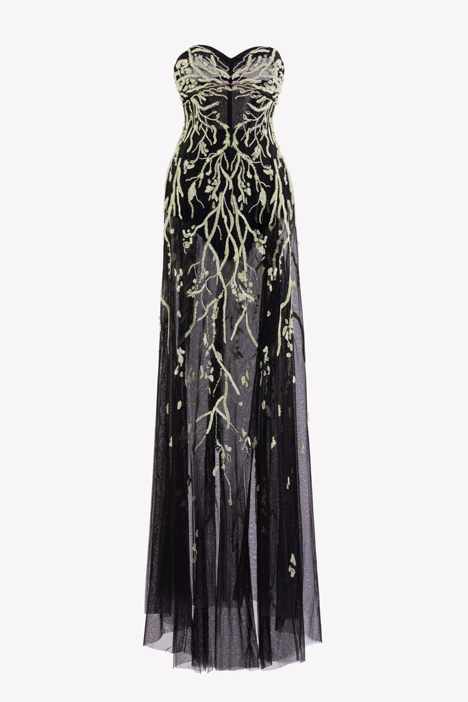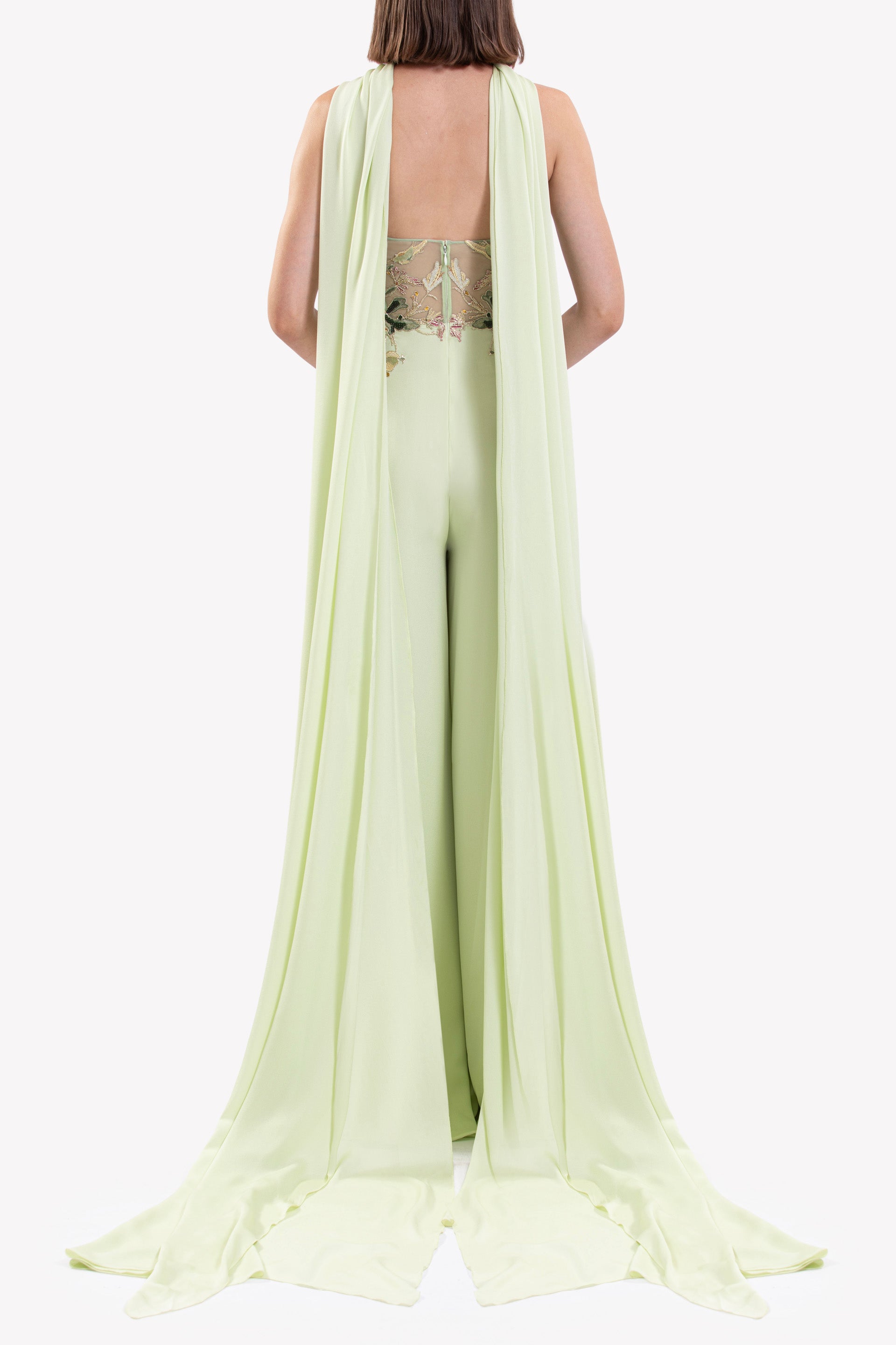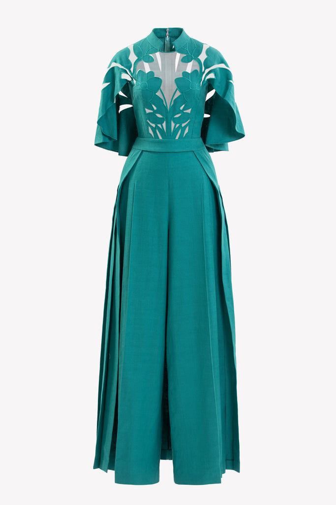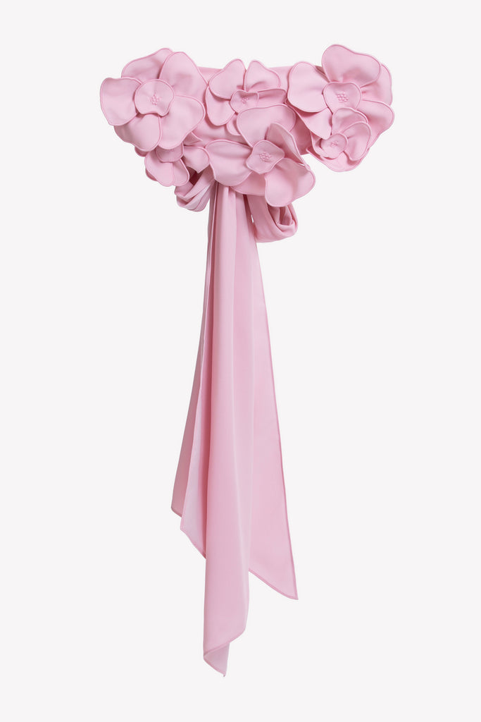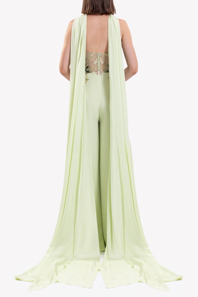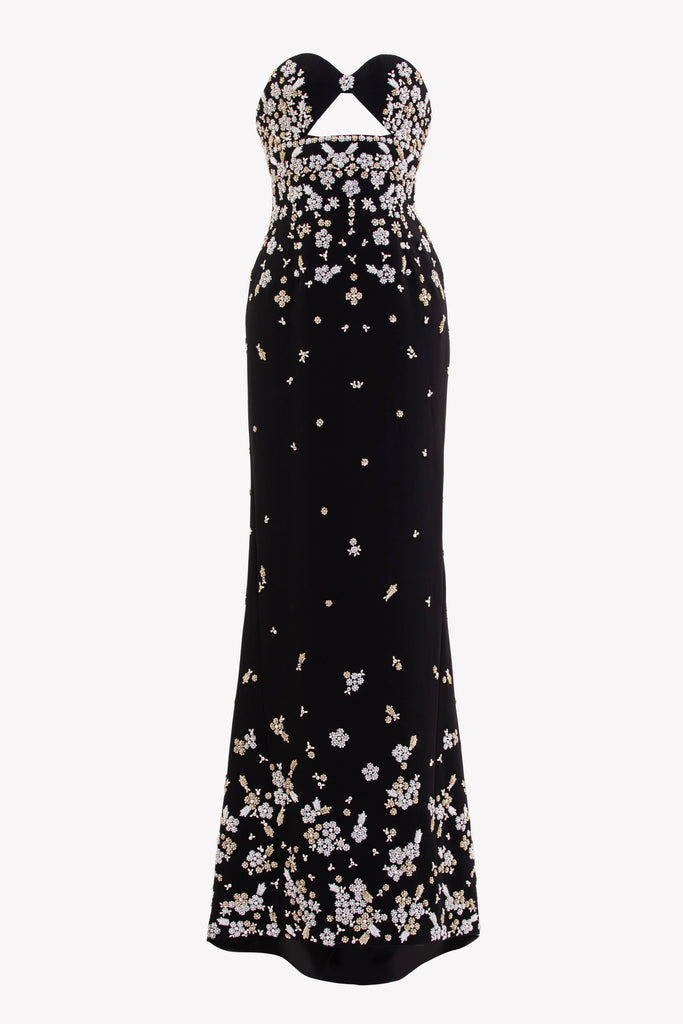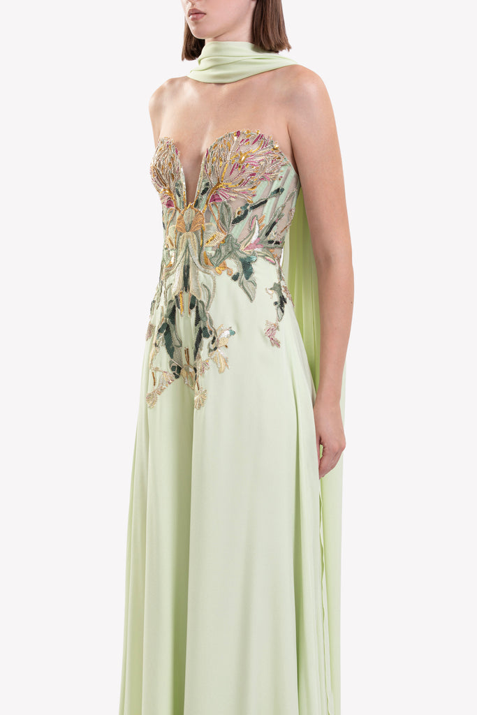 Reed crepe georgette jumpsuit with a strapless sweetheart neckline and fitted bodice, embellished with colorful dandelion-inspired embroidery, designed in a fluid floor-length silhouette and paired with a matching neck scarf.