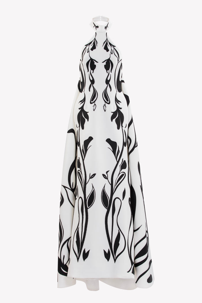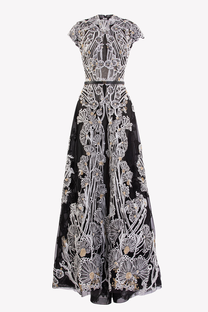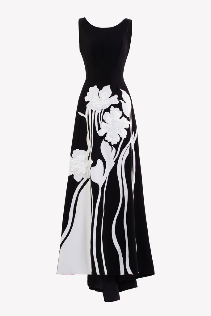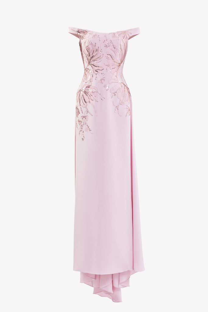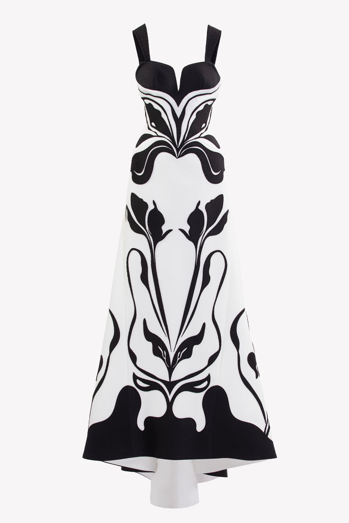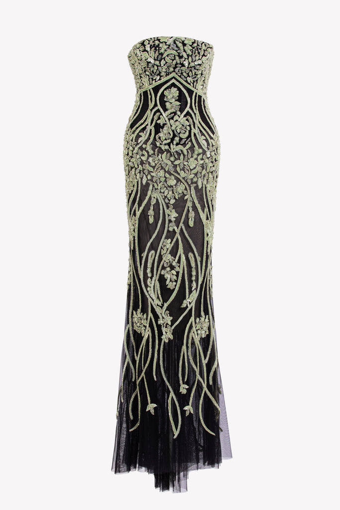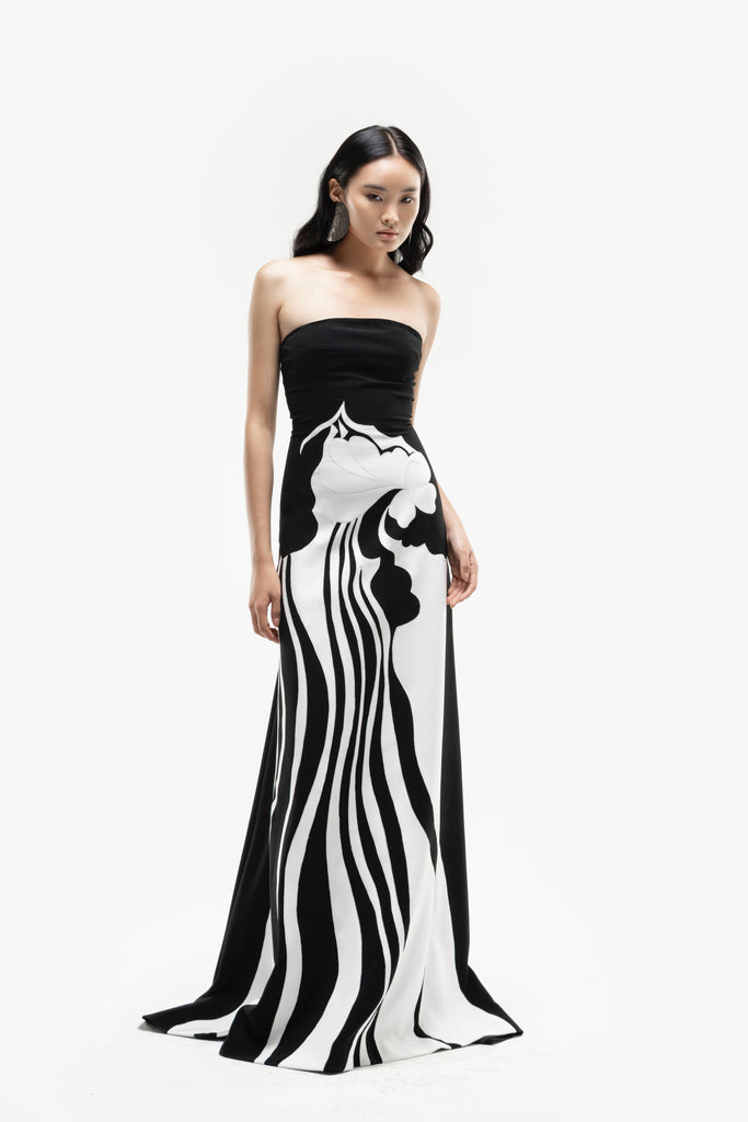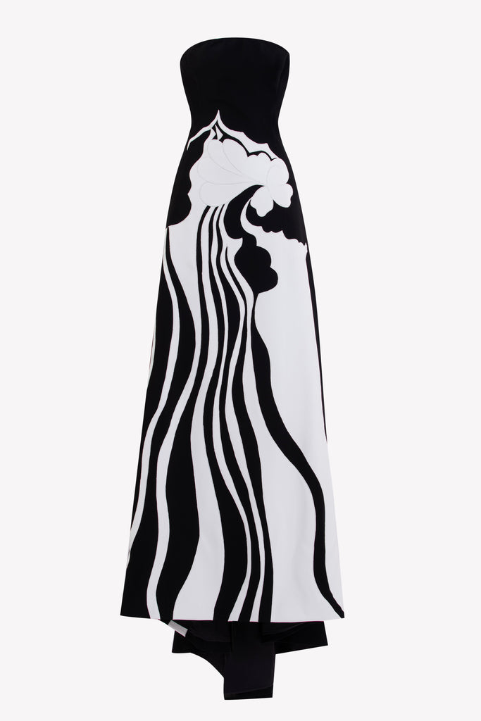 Reed crepe georgette jumpsuit with a strapless sweetheart neckline and fitted bodice, embellished with colorful dandelion-inspired embroidery, designed in a fluid floor-length silhouette and paired with a matching neck scarf.