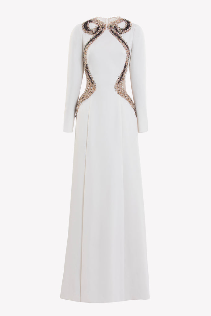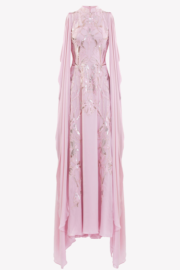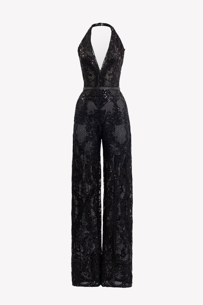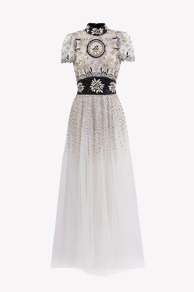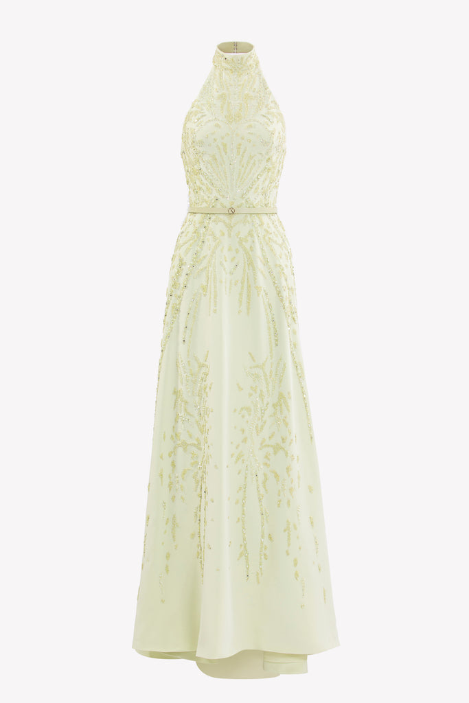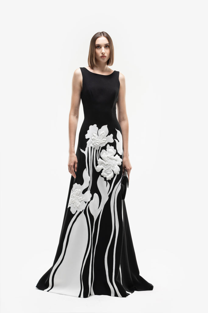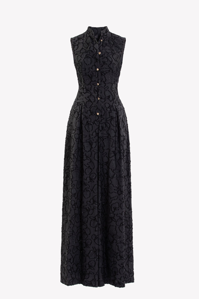 Reed crepe georgette jumpsuit with a strapless sweetheart neckline and fitted bodice, embellished with colorful dandelion-inspired embroidery, designed in a fluid floor-length silhouette and paired with a matching neck scarf.