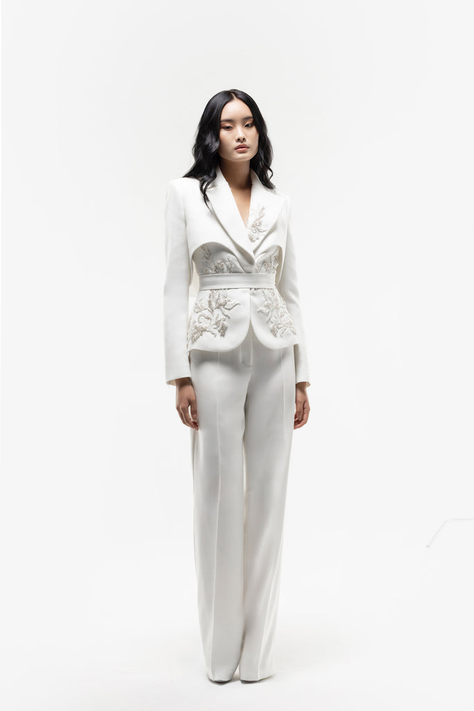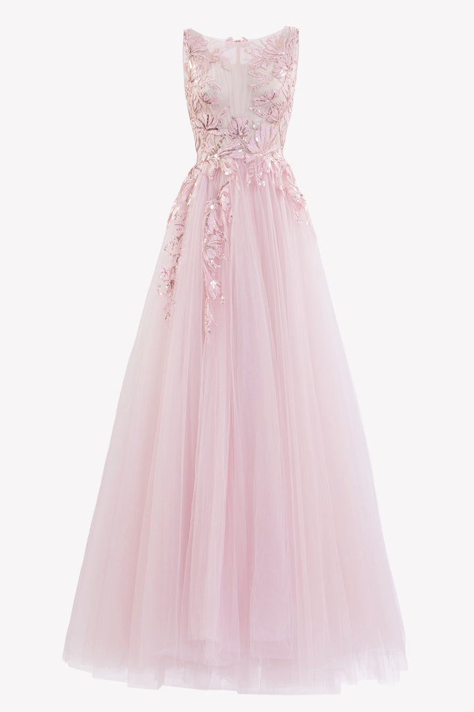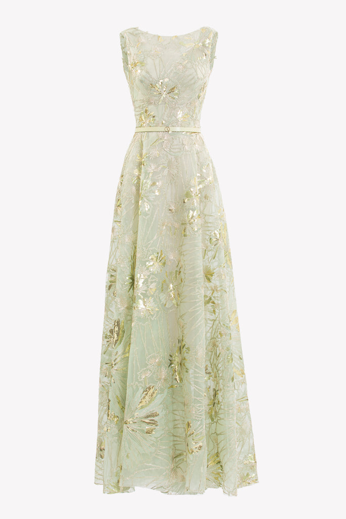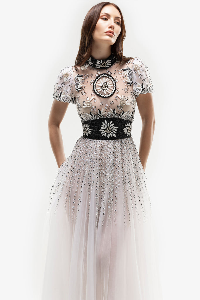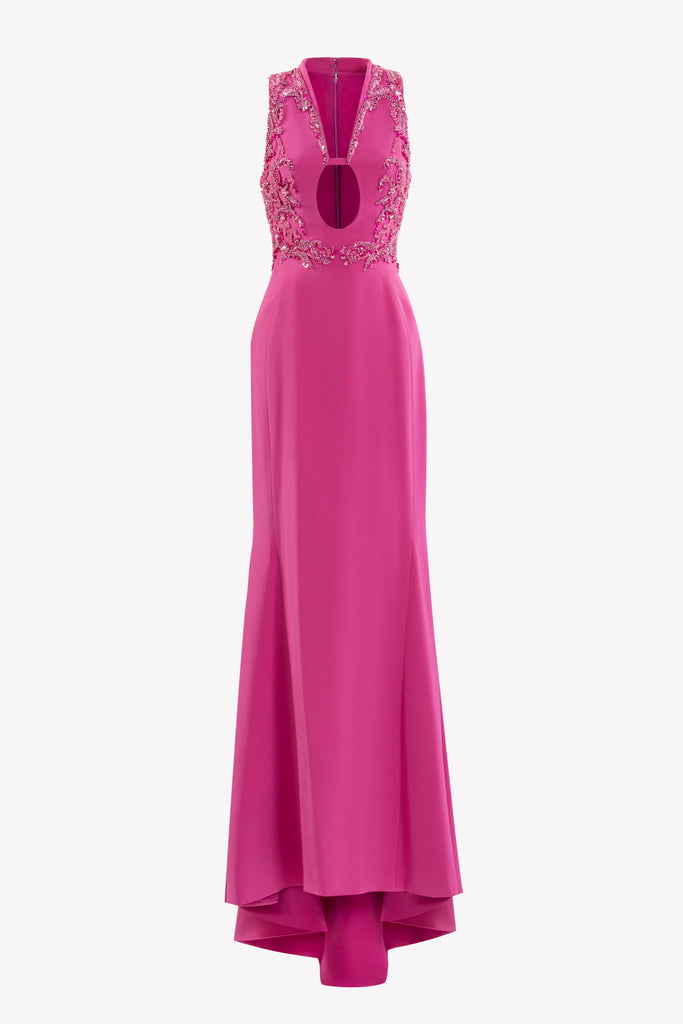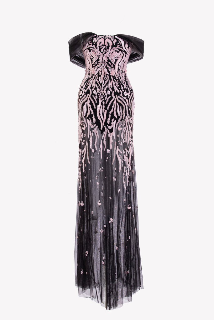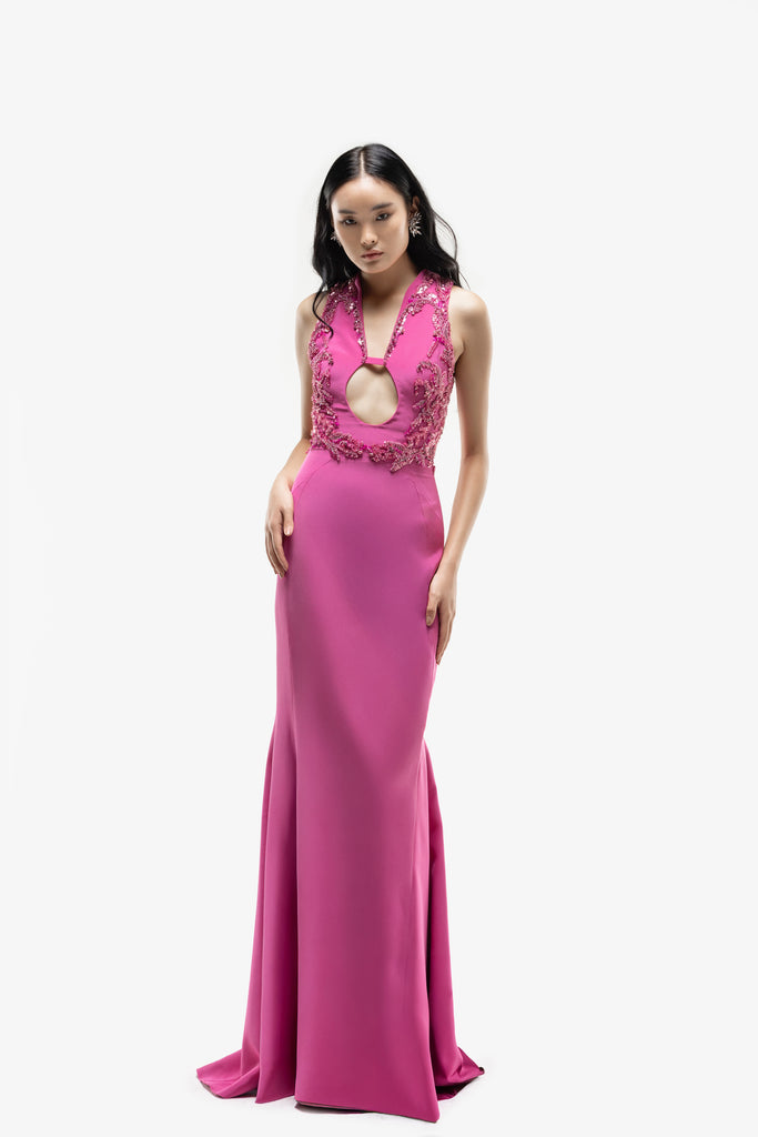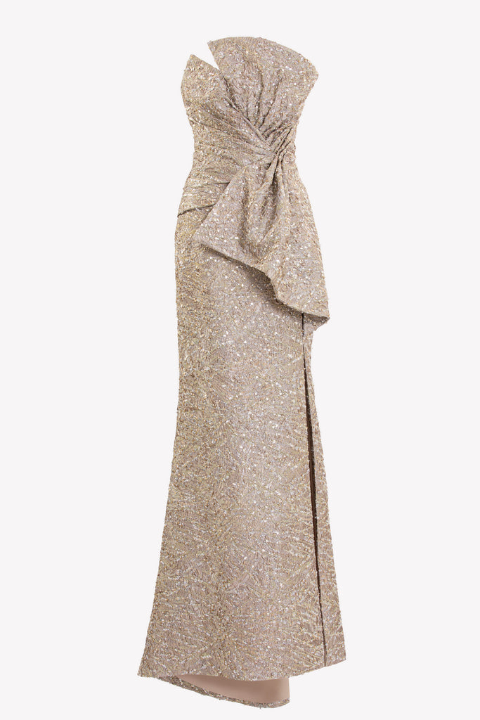 Reed crepe georgette jumpsuit with a strapless sweetheart neckline and fitted bodice, embellished with colorful dandelion-inspired embroidery, designed in a fluid floor-length silhouette and paired with a matching neck scarf.