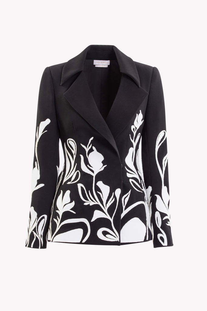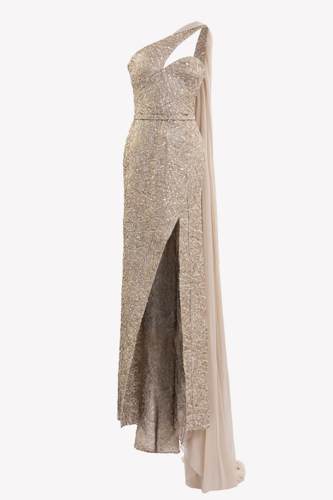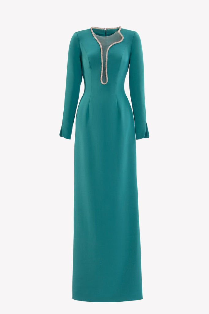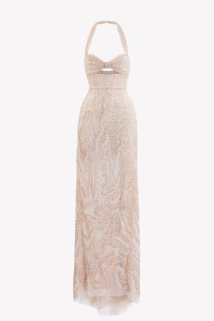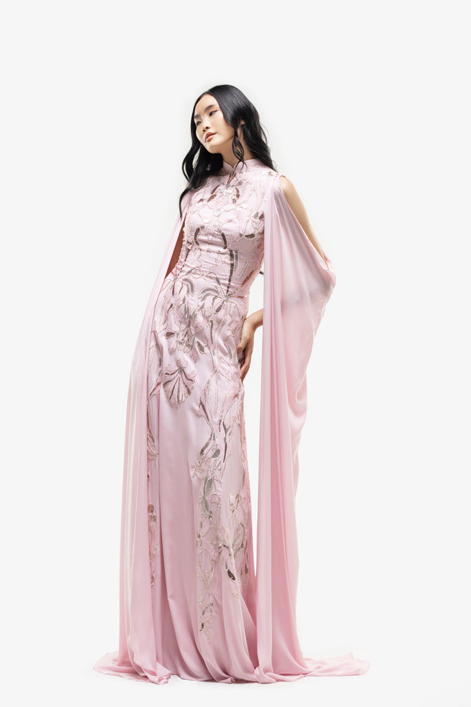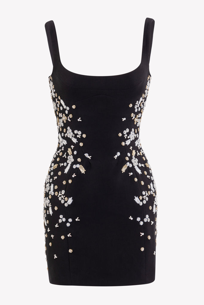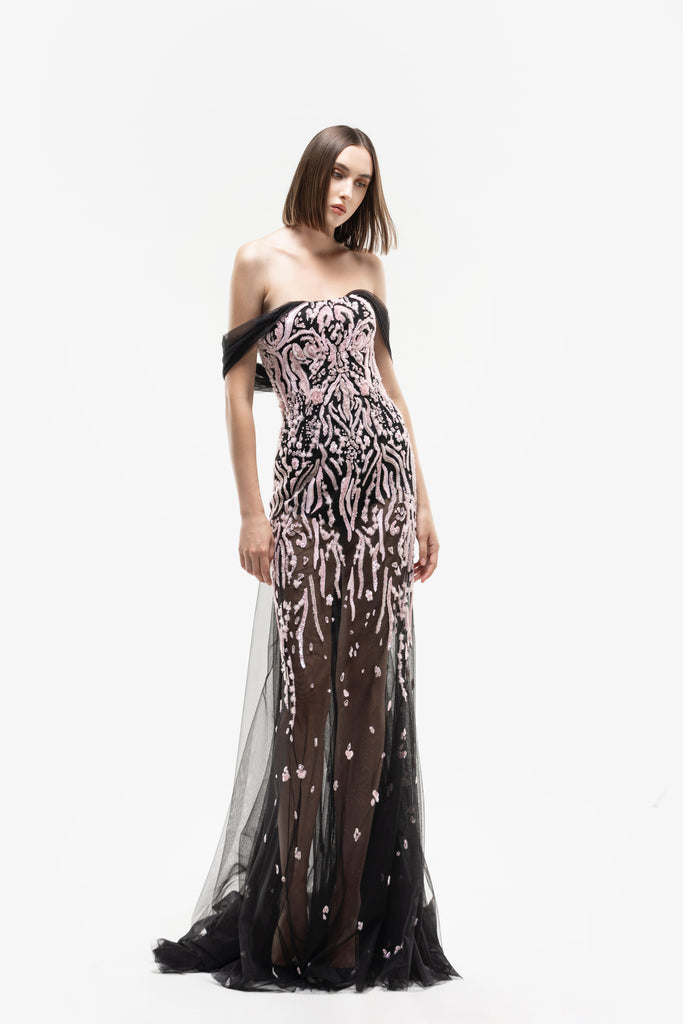 Reed crepe georgette jumpsuit with a strapless sweetheart neckline and fitted bodice, embellished with colorful dandelion-inspired embroidery, designed in a fluid floor-length silhouette and paired with a matching neck scarf.