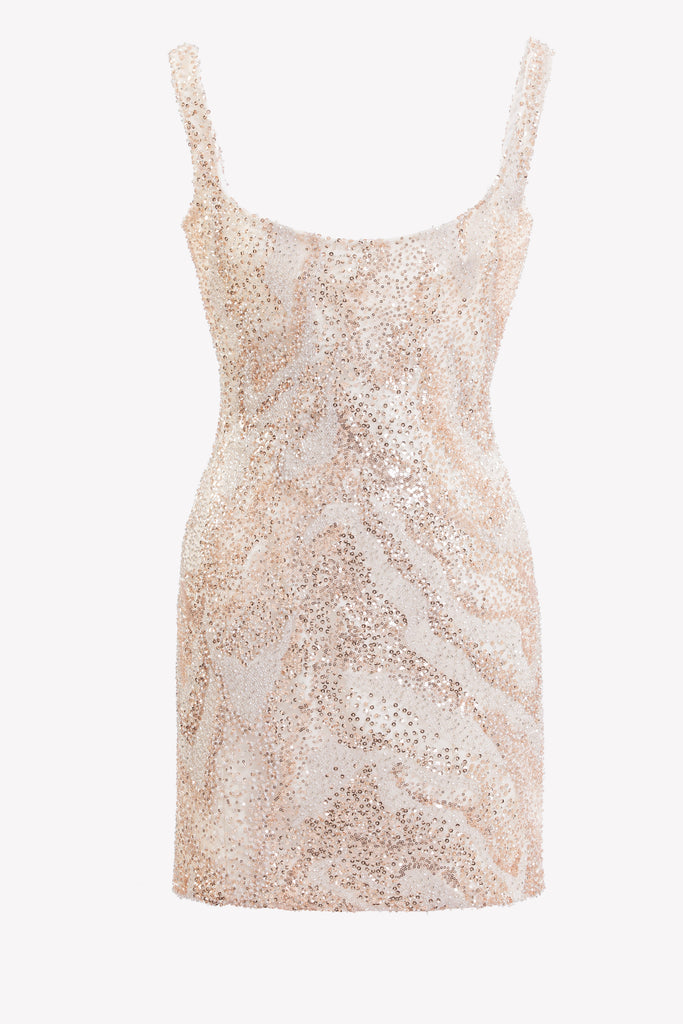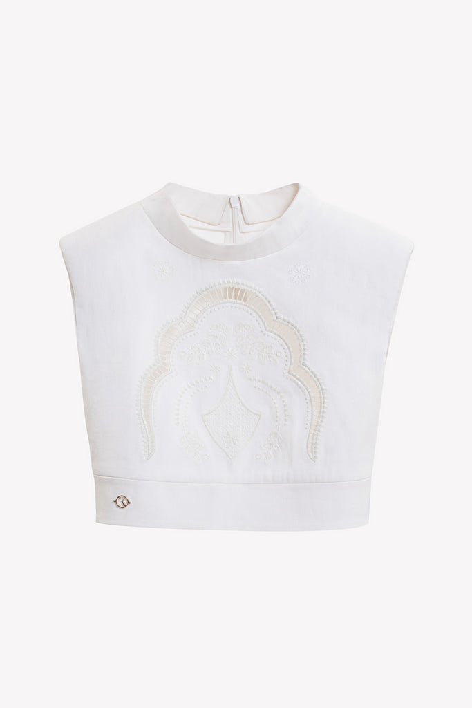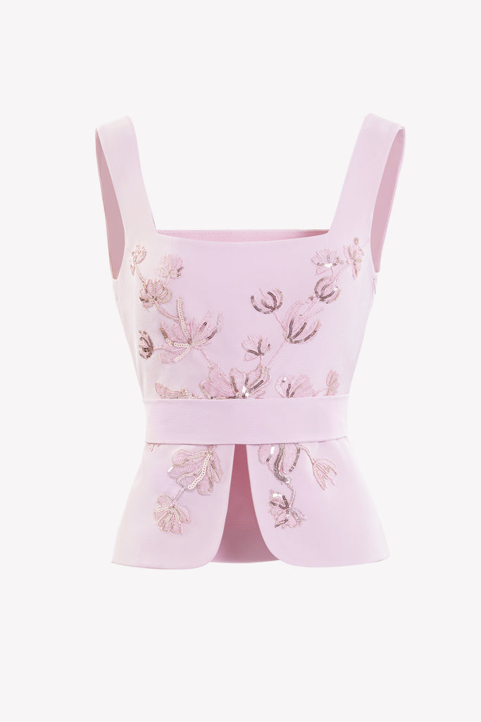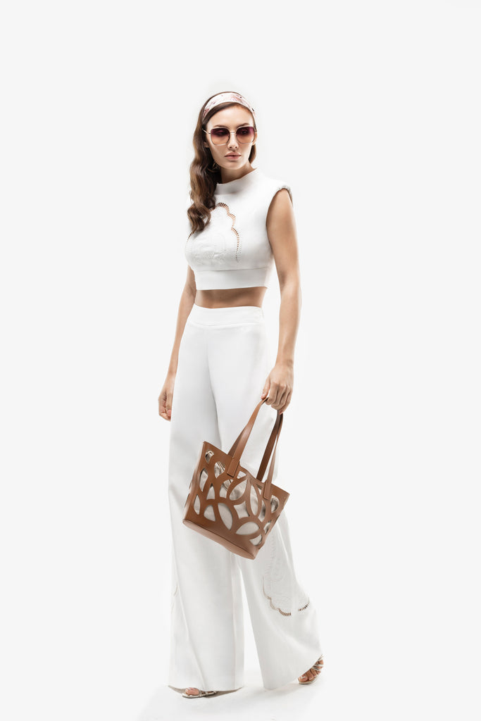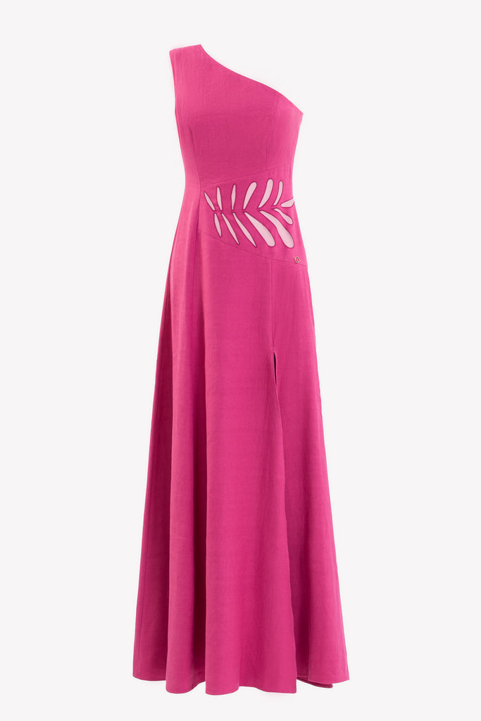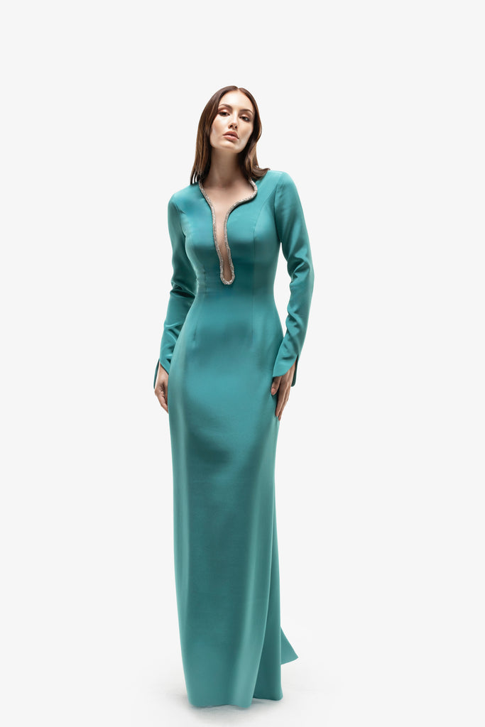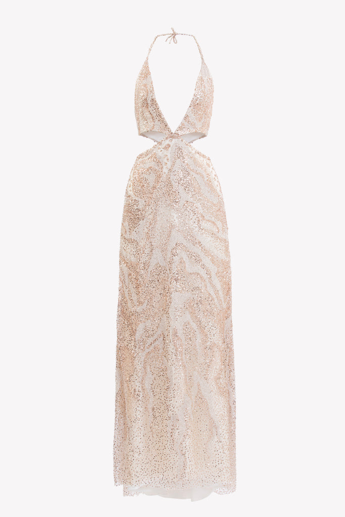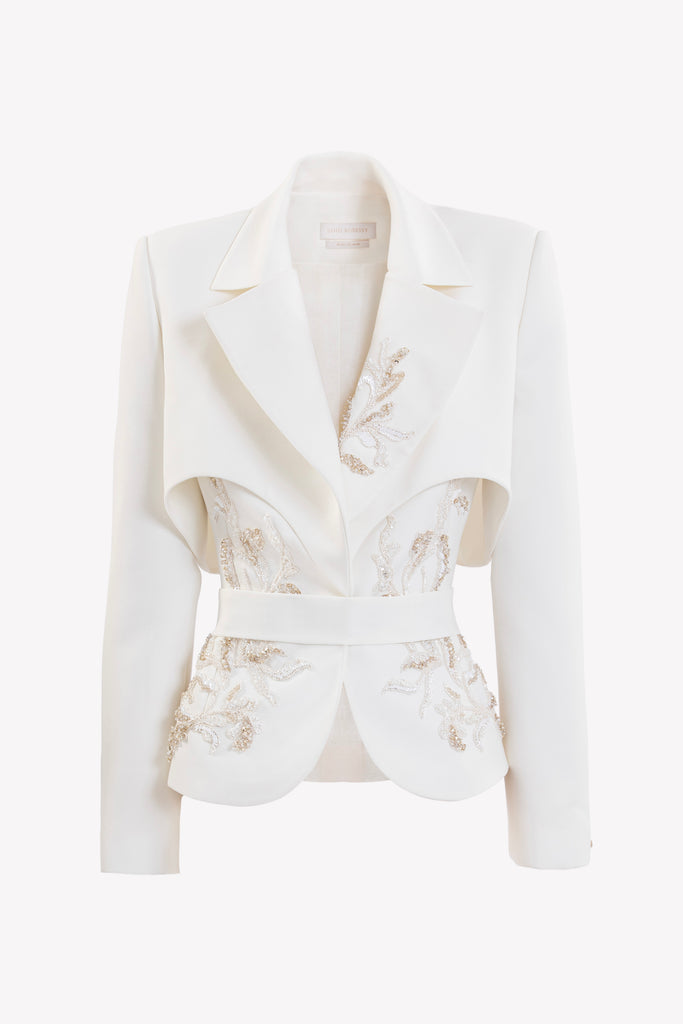 Reed crepe georgette jumpsuit with a strapless sweetheart neckline and fitted bodice, embellished with colorful dandelion-inspired embroidery, designed in a fluid floor-length silhouette and paired with a matching neck scarf.
