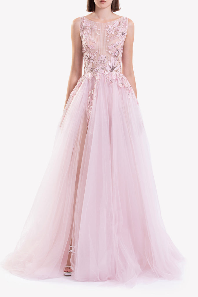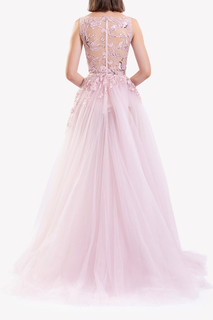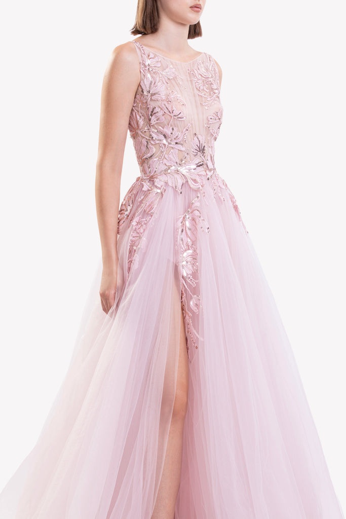 Salsa Rosa gathered tulle dress with a sleeveless bateau neckline and fitted bodice, adorned with delicate dandelion-inspired embroidery, flowing into a voluminous floor-length skirt with a high slit.