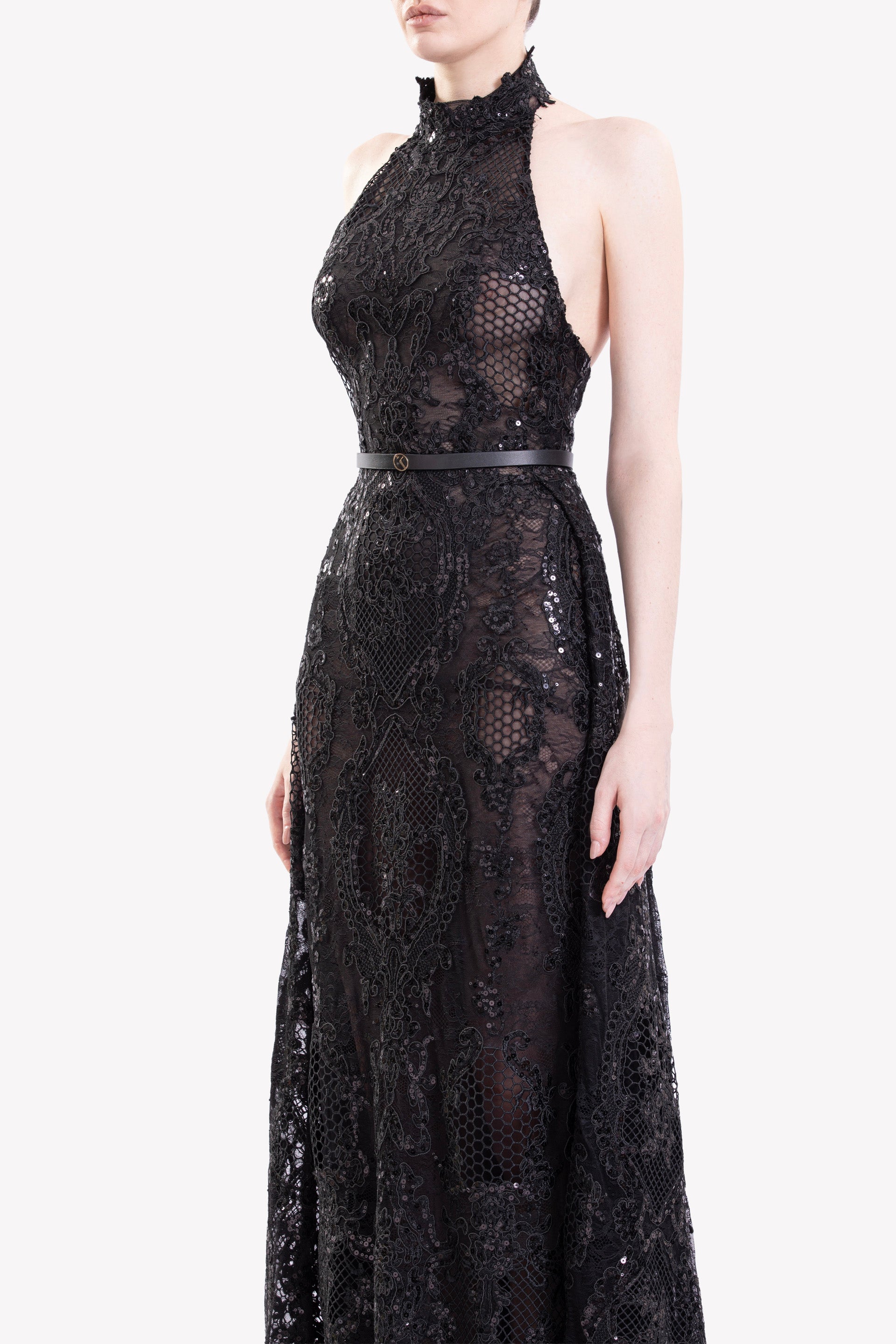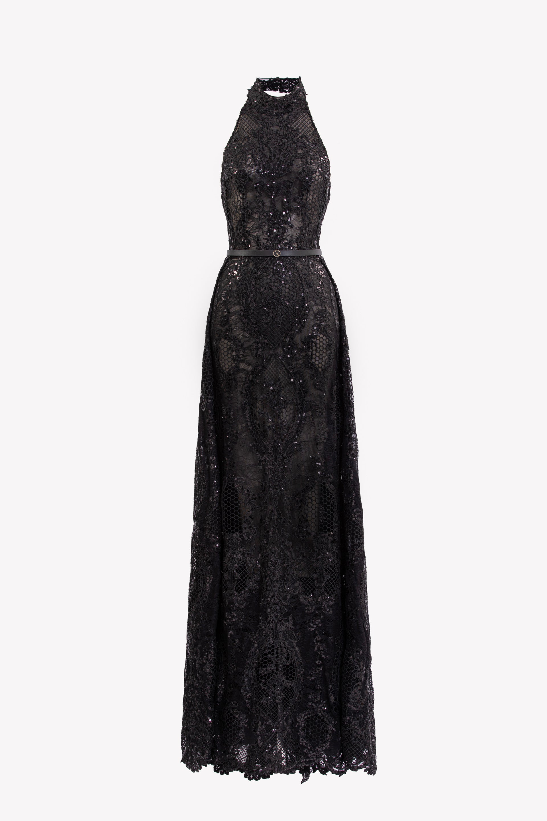Jet-black lace embroidered dress with a halter neckline and fitted bodice, featuring subtle tonal embroidery for added texture. Flows into a floor-length A-line overskirt with a soft, flowing silhouette.